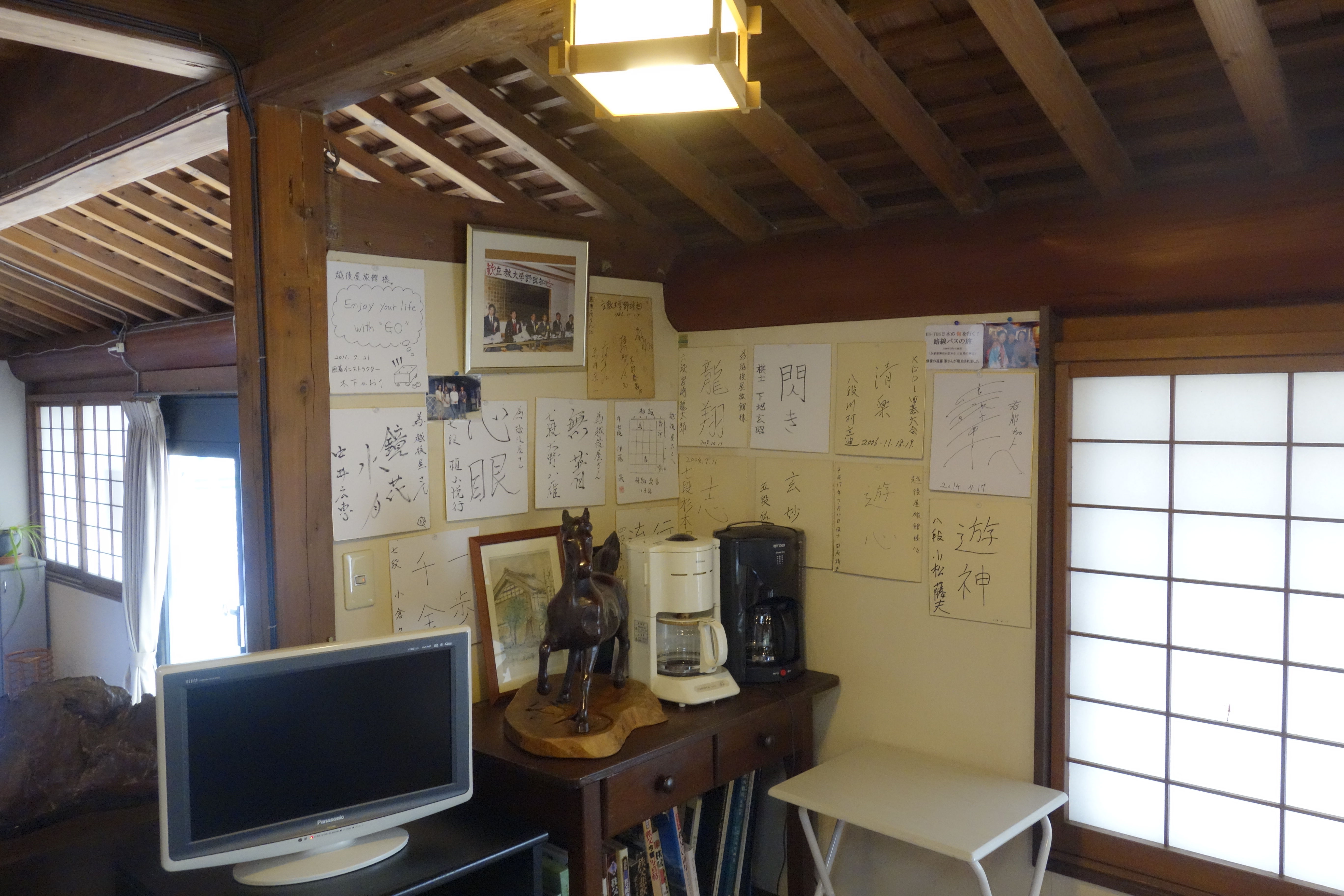 旅館入口前に「毘沙門水」のポスターが張ってあるのを確認!