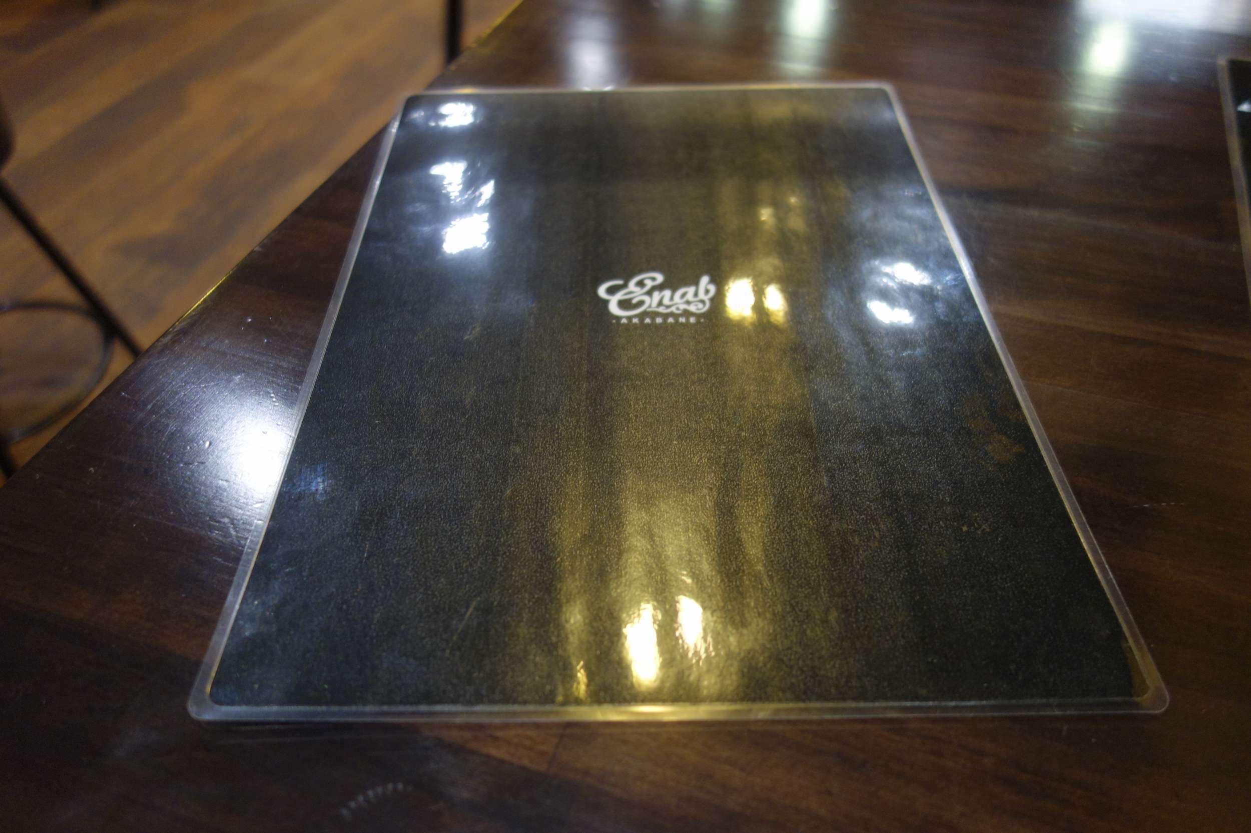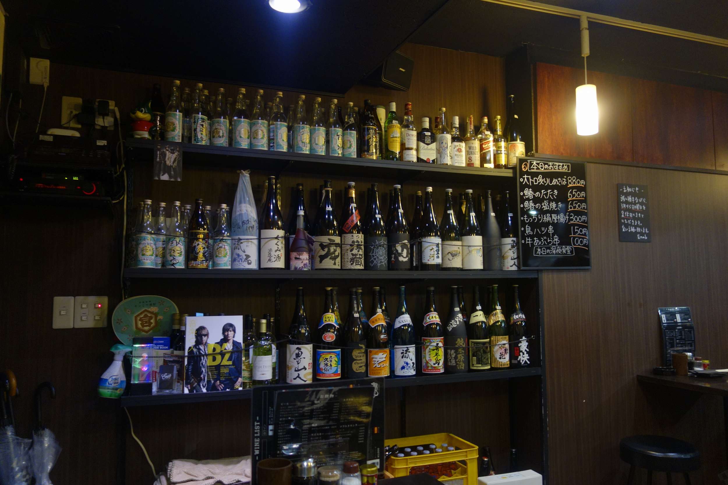 エナブ店内に入ると、様々なお酒の瓶(特にキンミヤ焼酎の存在感が凄い)やこの日のメニューが目につき