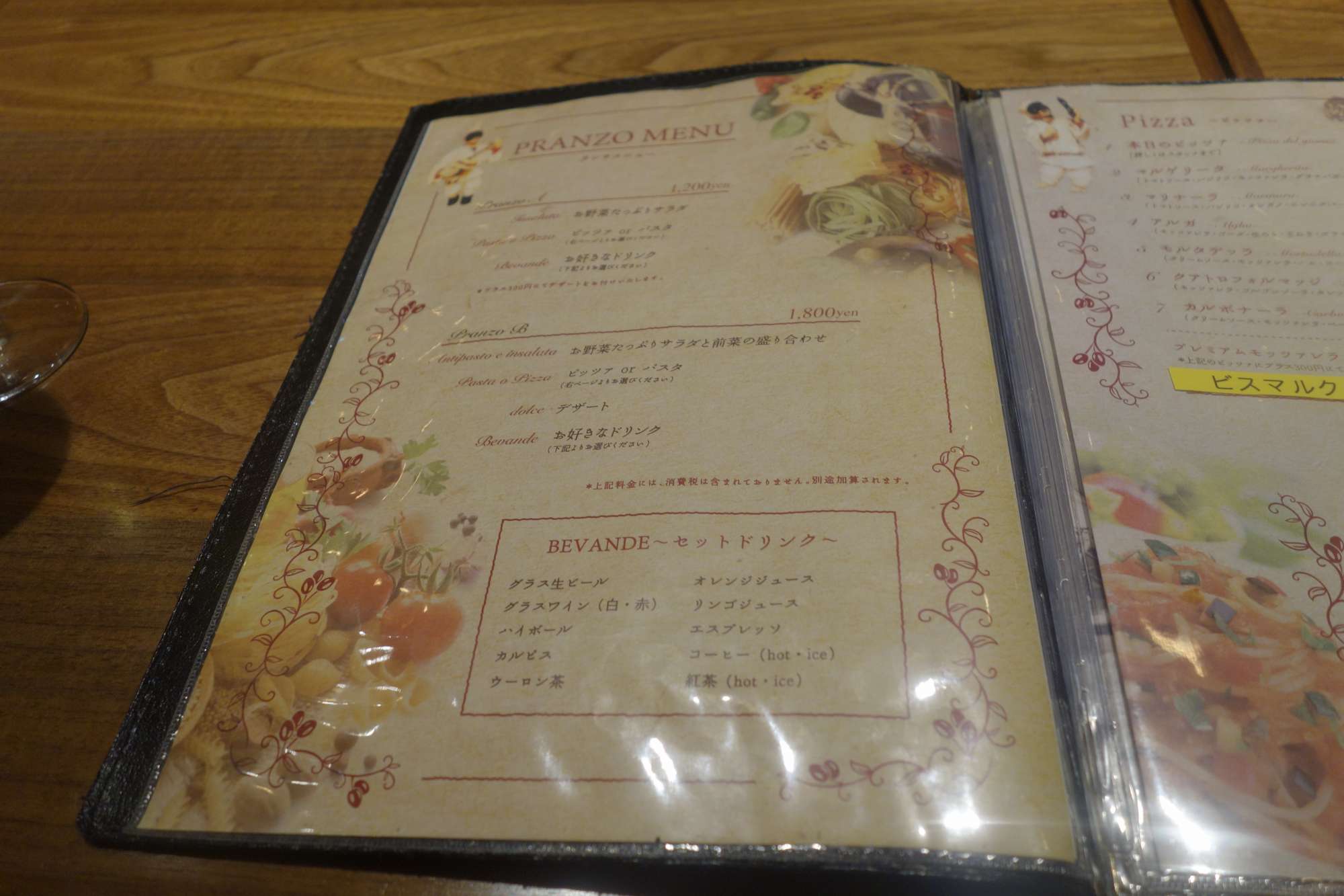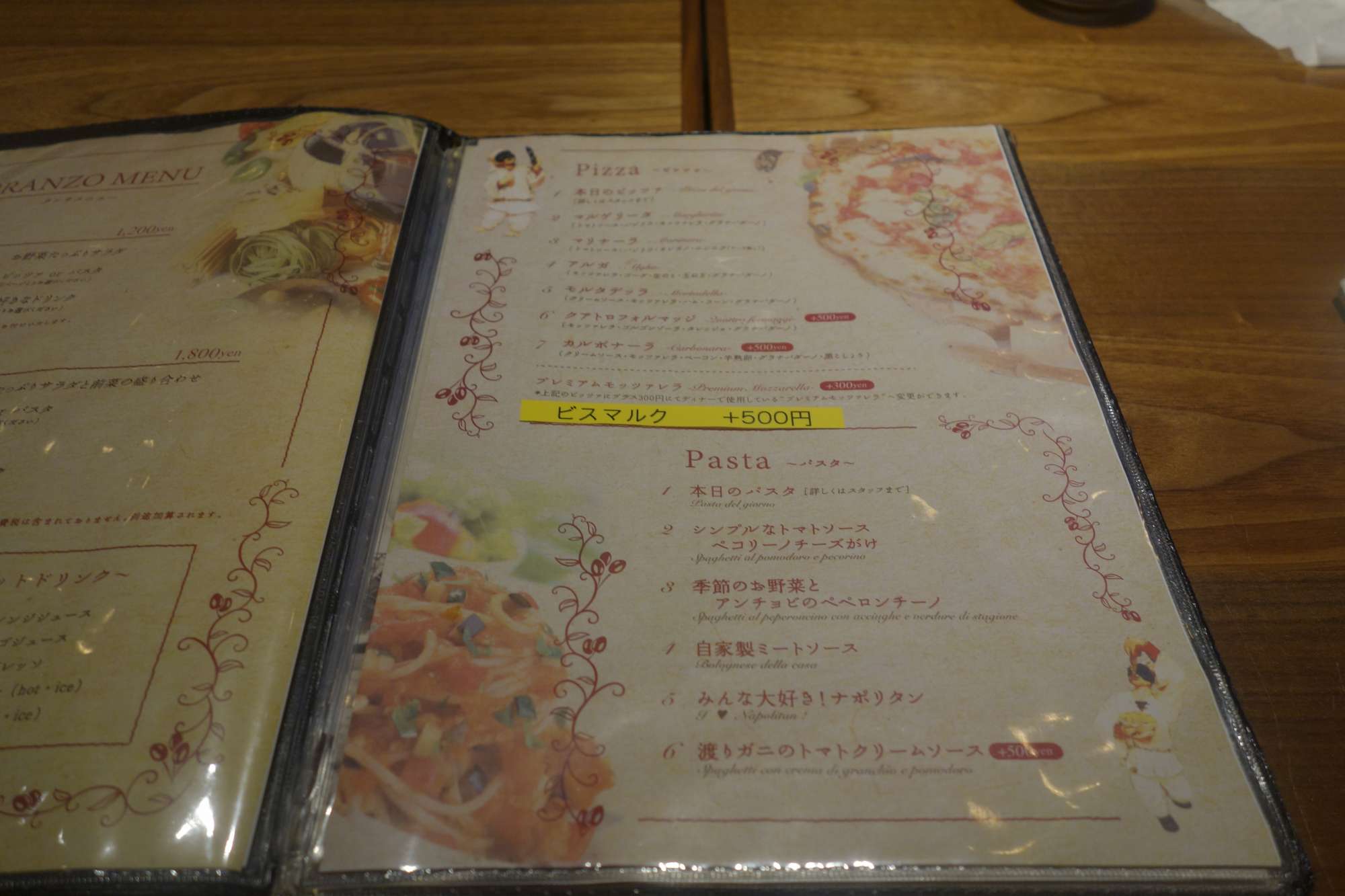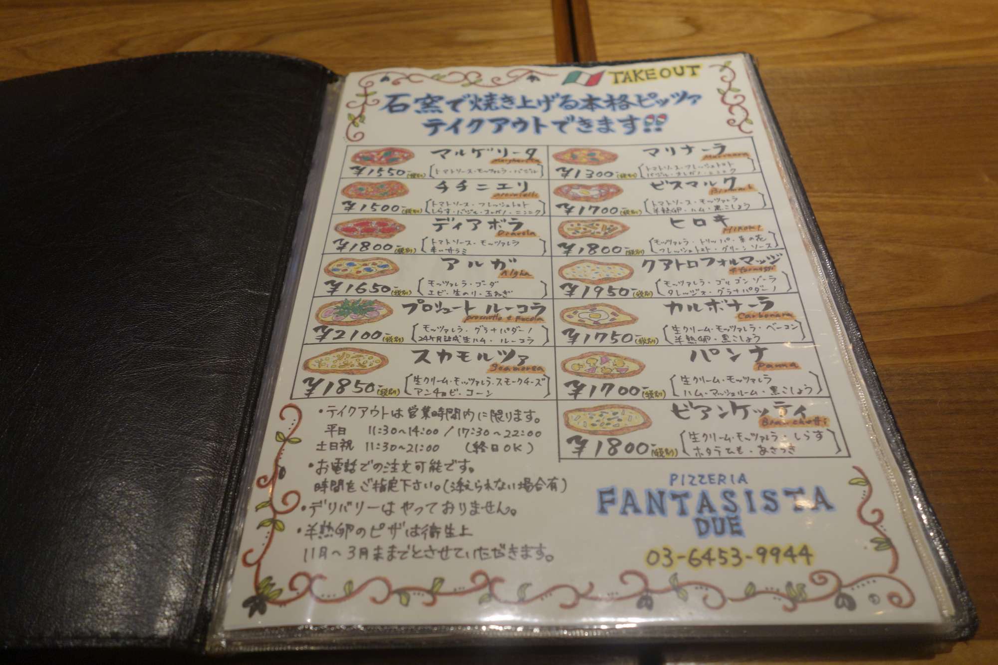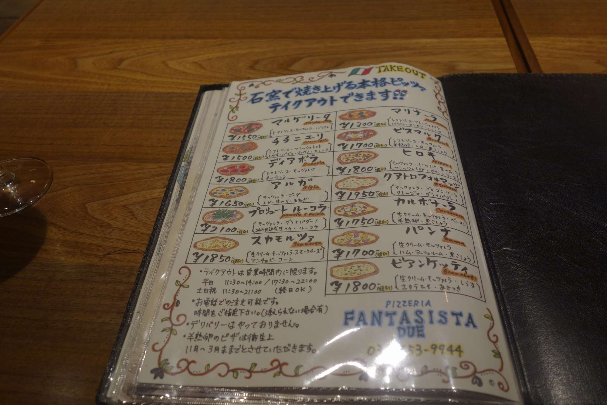 最初のページには持ち帰りピッツァメニューがあり