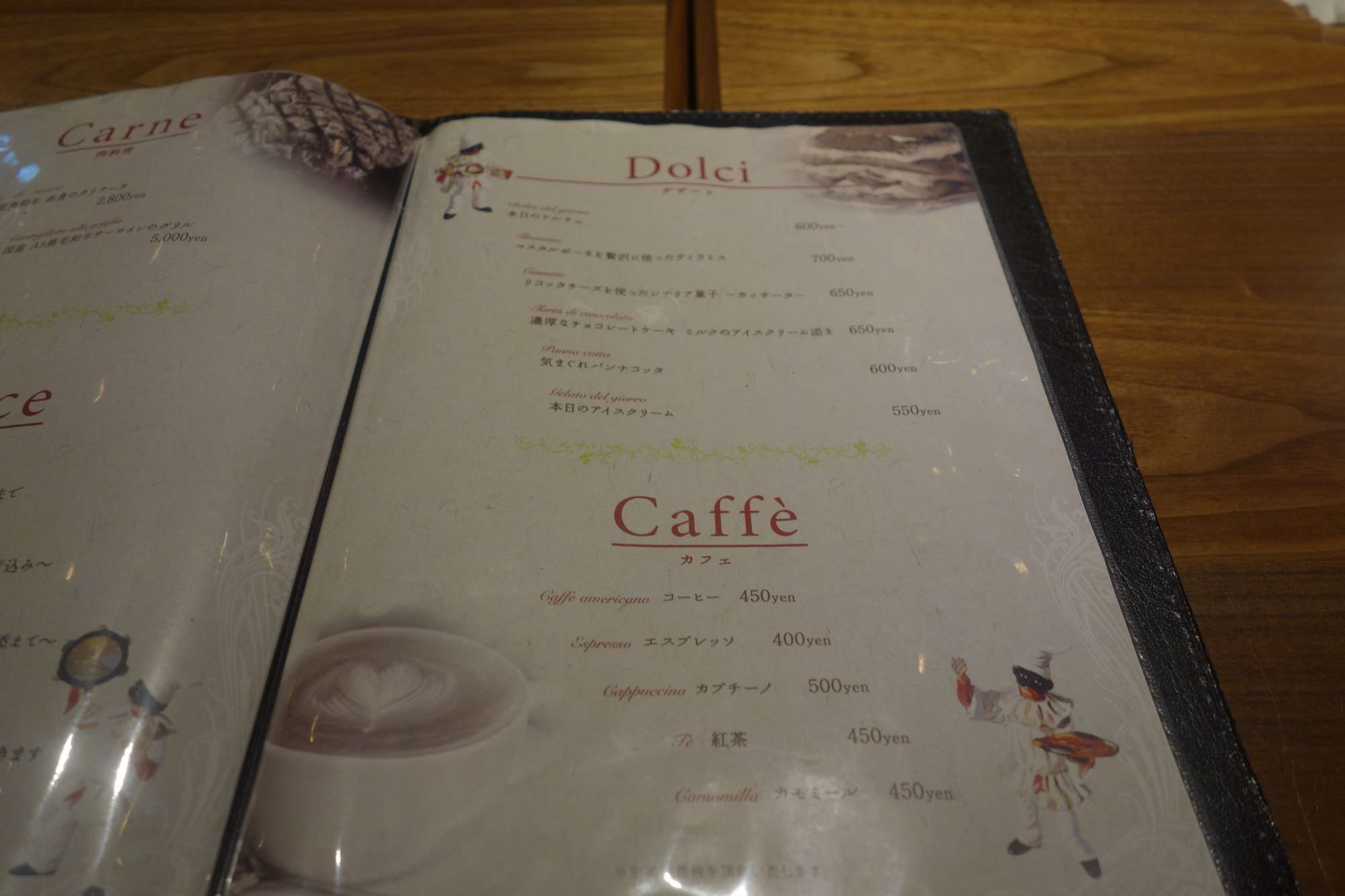 ドルチェメニュー、コーヒーメニュー