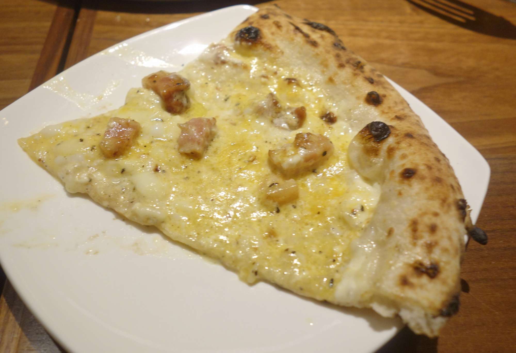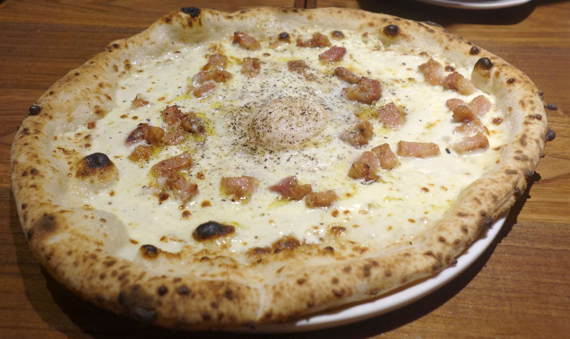 いざ食べてみると、カルボナーラ感と言いますか、チーズと玉子のトロリ感とベーコンの塩気をしっかりと感じられ、創作ピッツァとしてはかなりレベルの高い一品です。