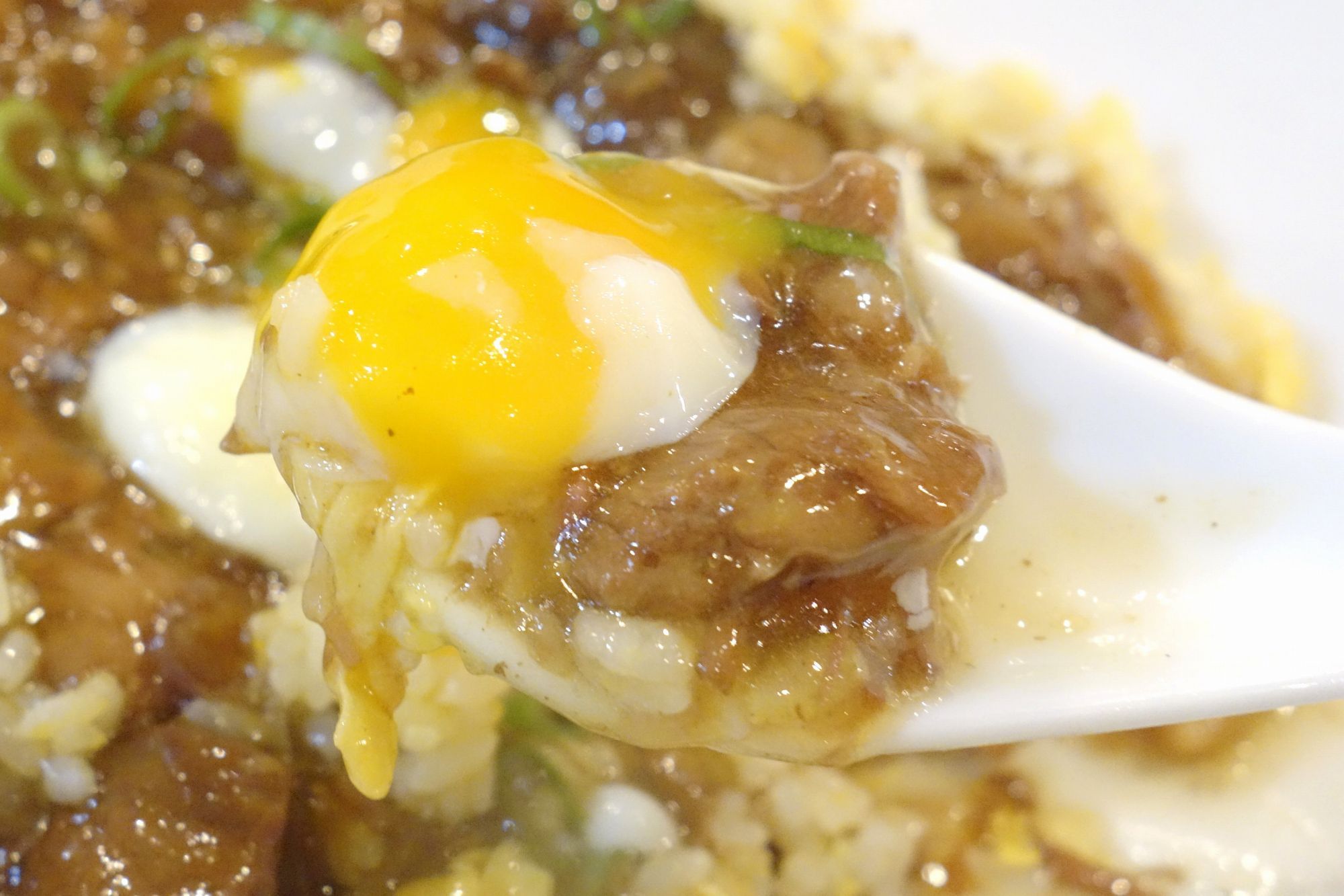 続いてはチャーハン中央にあった温泉玉子を交えて食べてみると、黄身の円やかな美味しさがプラスされてさらにウマウマ! 程よく塩気が薄れるので食べやすさもUPします。