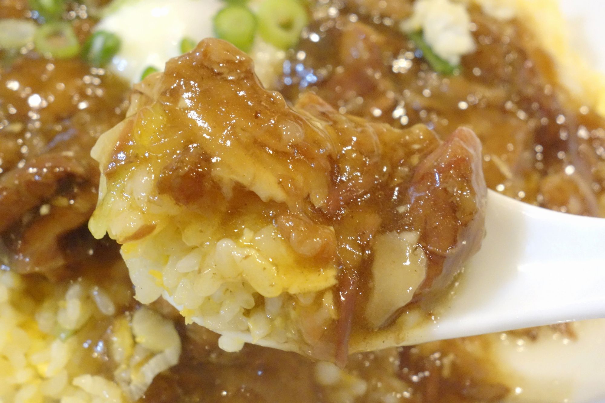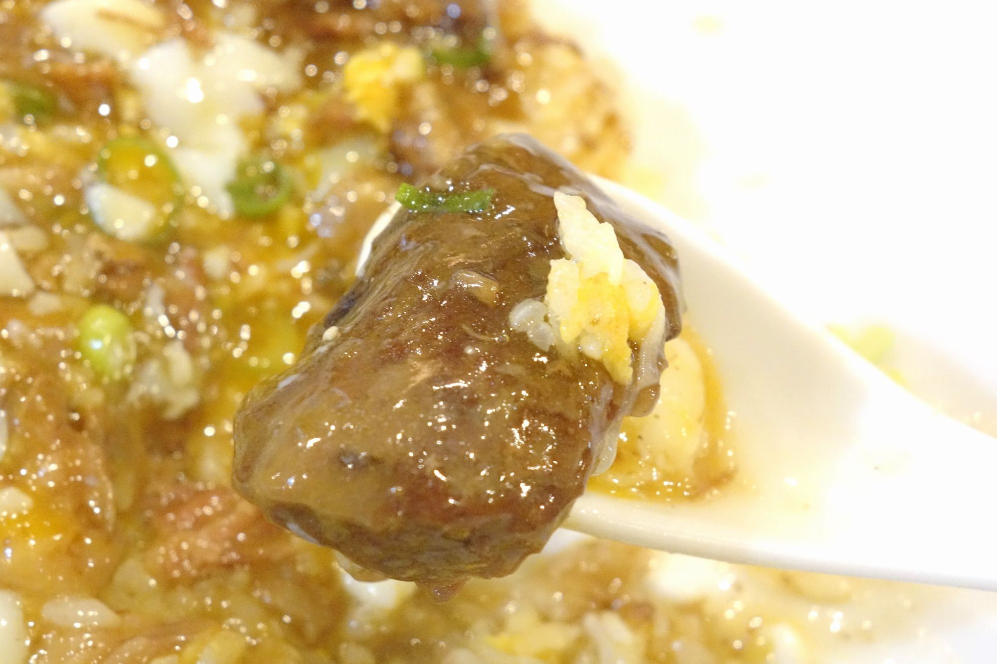 続いて牛すじあんかけを交えて食べてみると、とろみがかった牛すじあんかけは、牛すじが溶け込んだことで旨味が濃厚! 加えて甘じょっぱい味付けがチャーハンとの相性バッチリで、勢い良く食べる手が進みます。