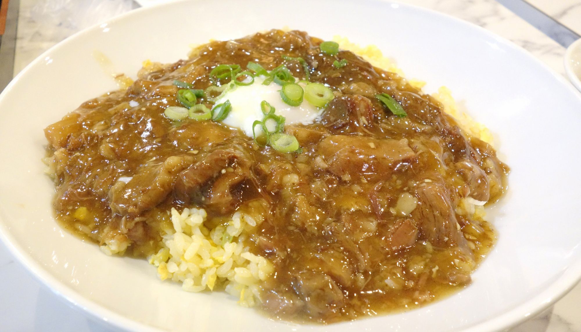牛すじチャーハンは、玉子でコーティングされたチャーハンの上に牛すじあんかけがたっぷりかかったあんかけチャーハンで