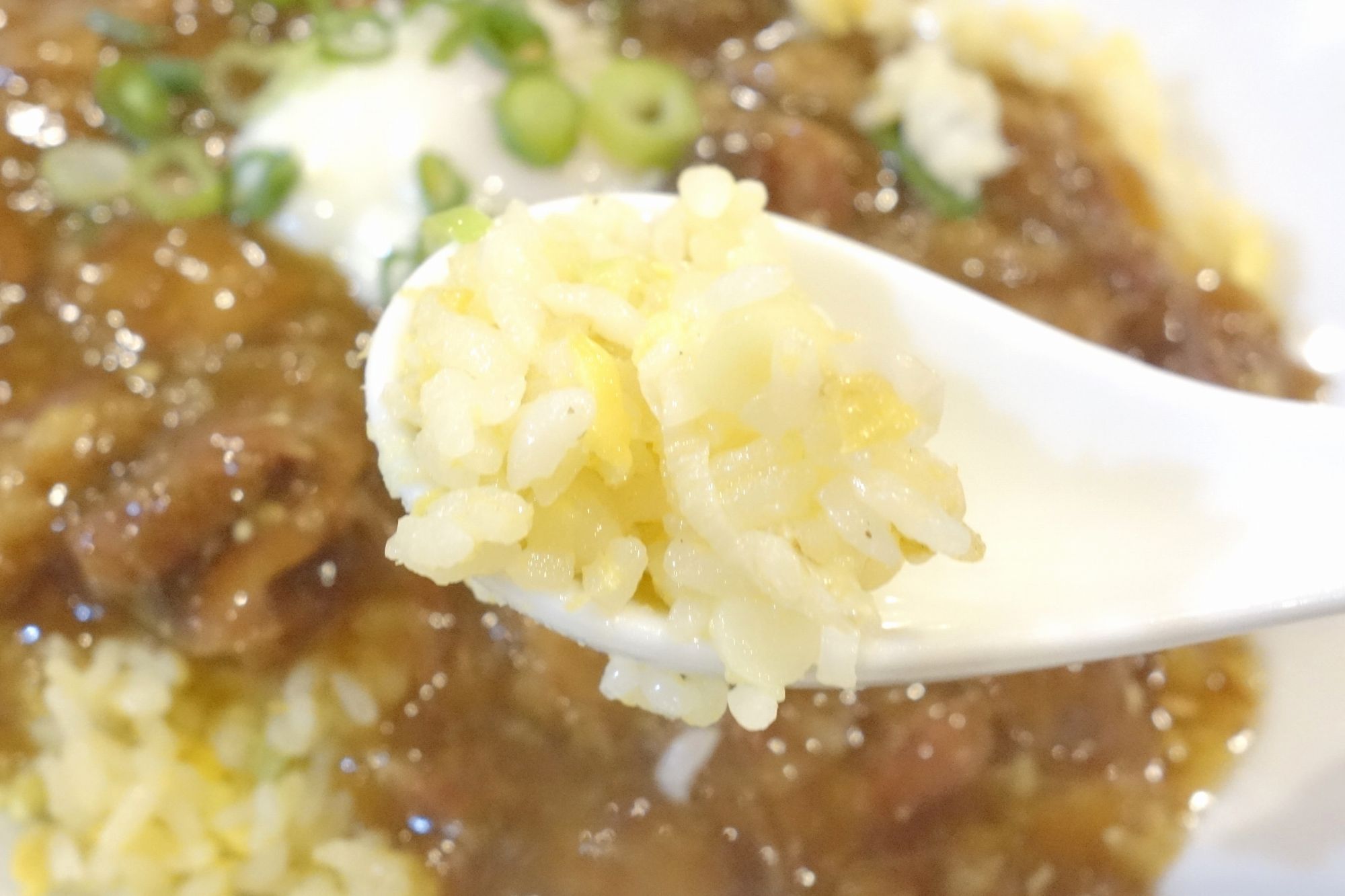 あんかけがかかっていない部分を狙ってチャーハンを食べてみると、あんかけと一緒に食べることを想定して、塩気がほぼ0。ちょっぴり胡椒が効いています。