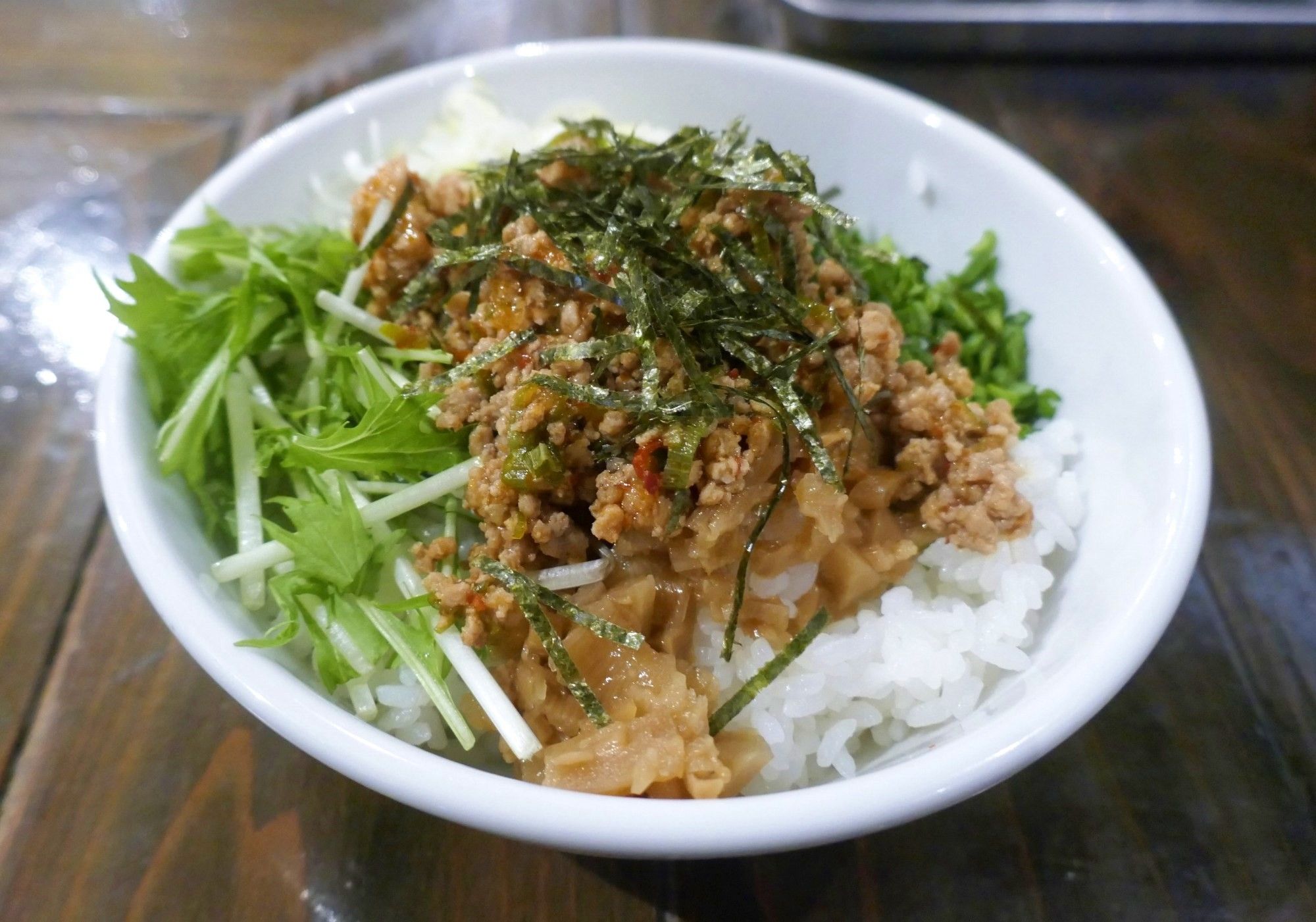 混ぜメシは、旨味と辛味の塩梅がグッドなミンチが、ハリのある炊き加減なご飯に絡んでウマイ!