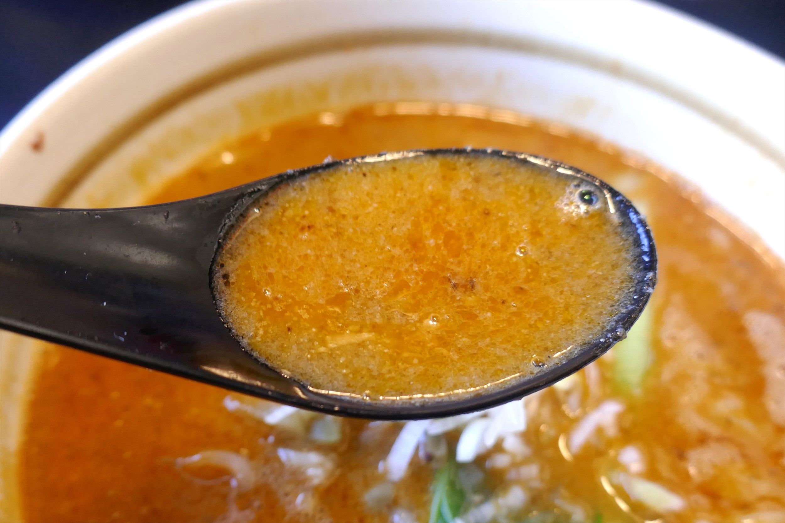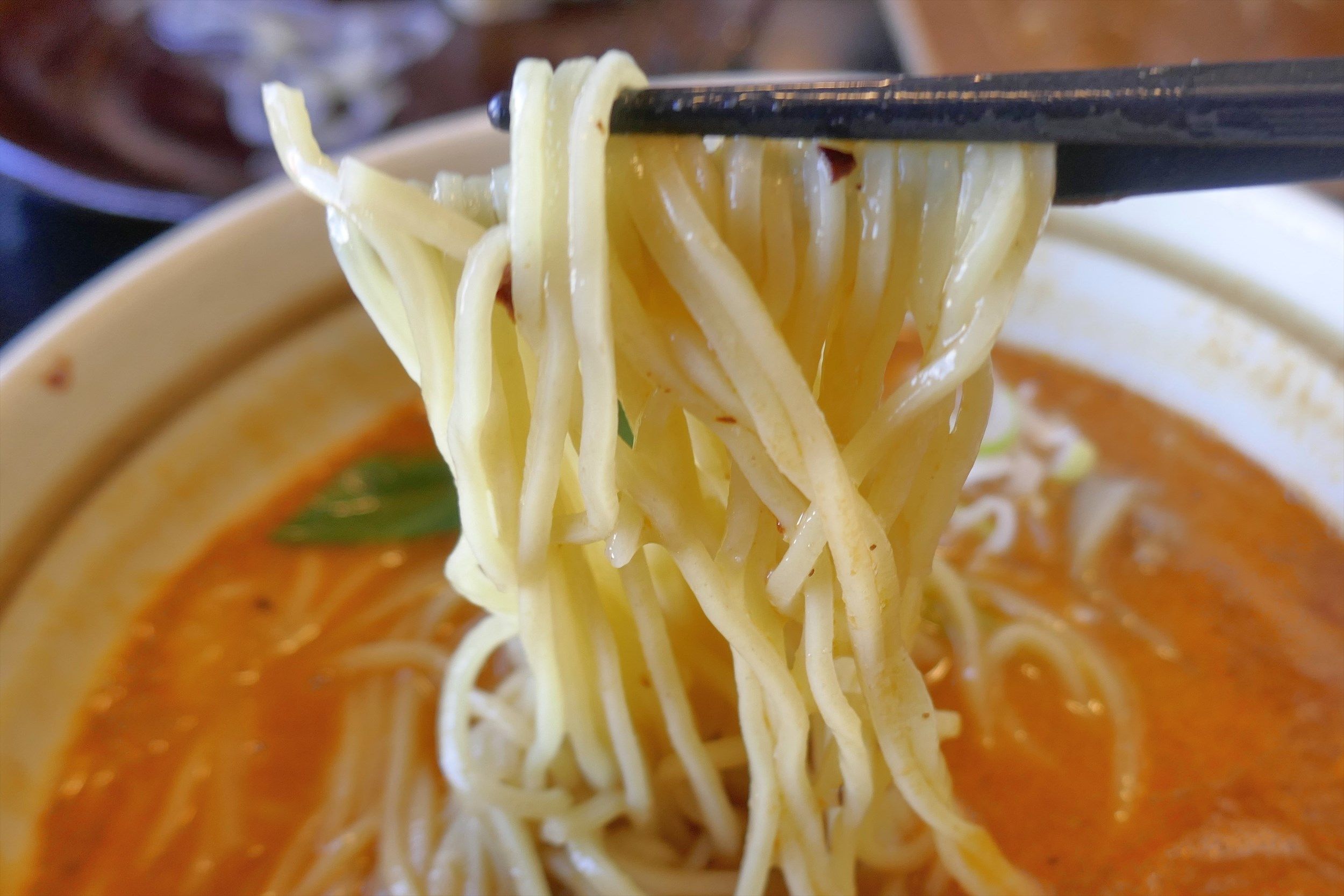 「担々麺」のスープは、山椒の痺れる辛さ、刺激的な唐辛子の辛さ、ごまのコク、ほどよい出汁の風味が感じられ