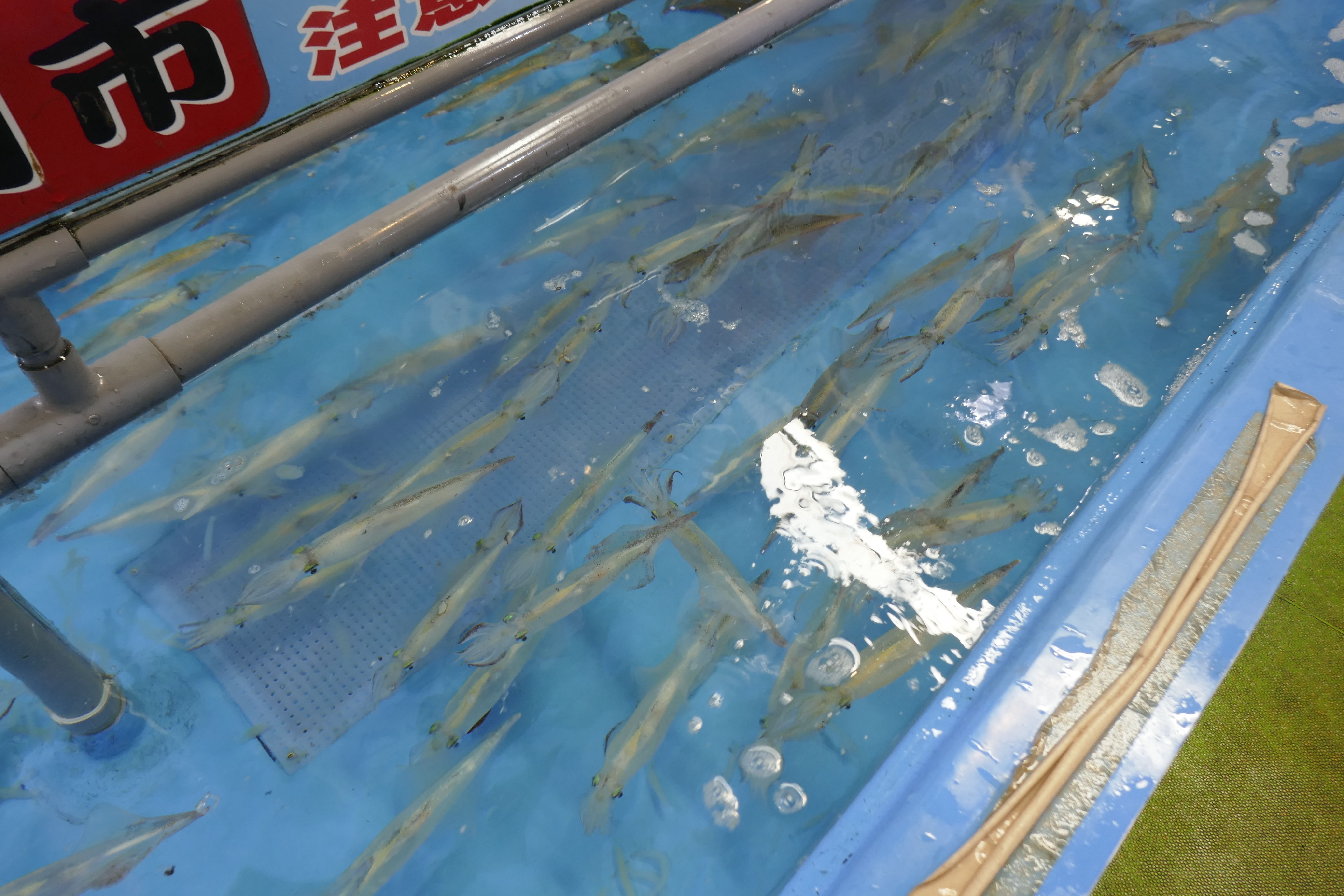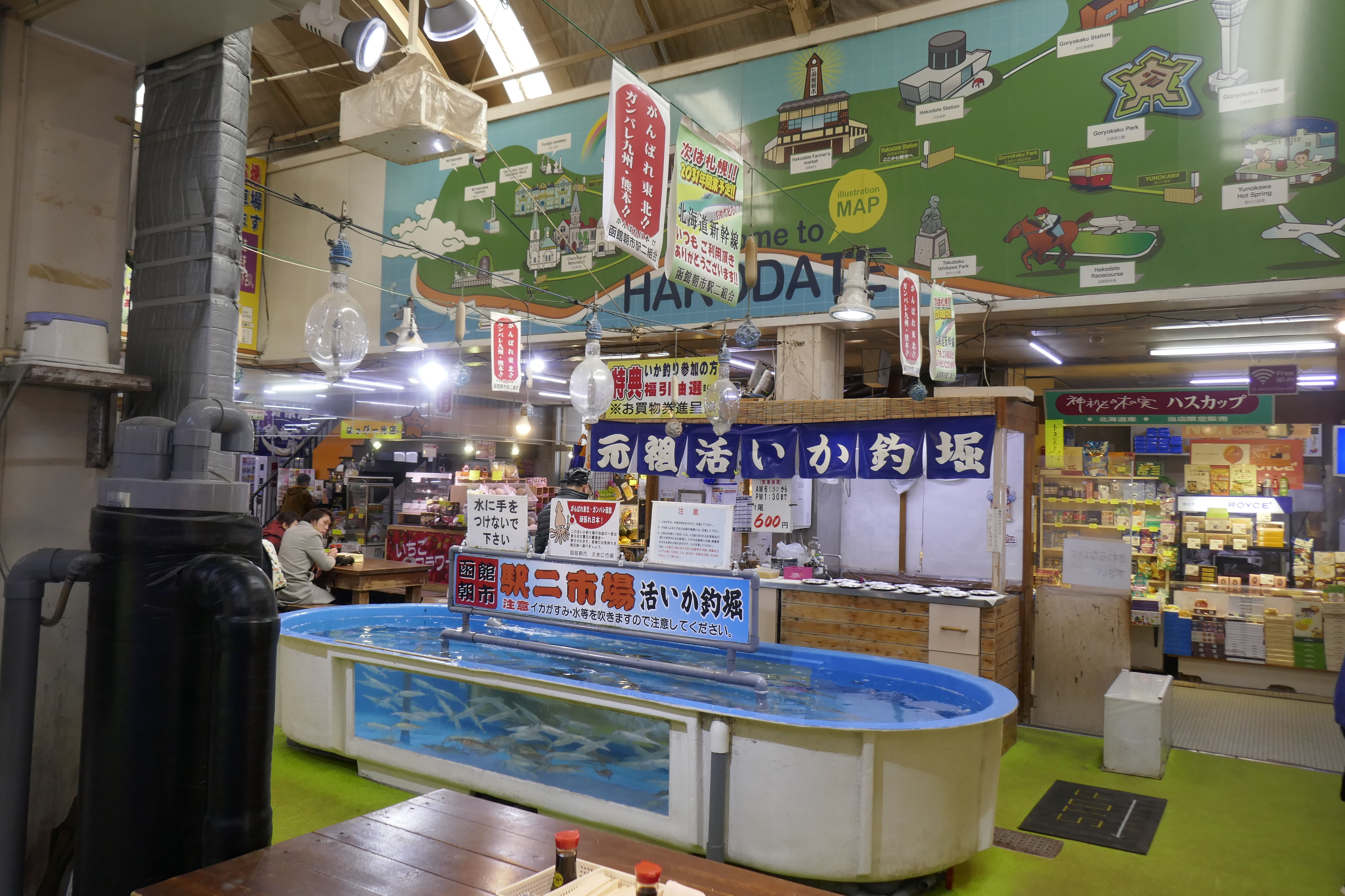 函館といえばイカ刺しが有名ですが、今回は安価にイカ釣り&イカ刺しが楽しめる「函館朝市 駅二市場 活いか釣り広場」へ。