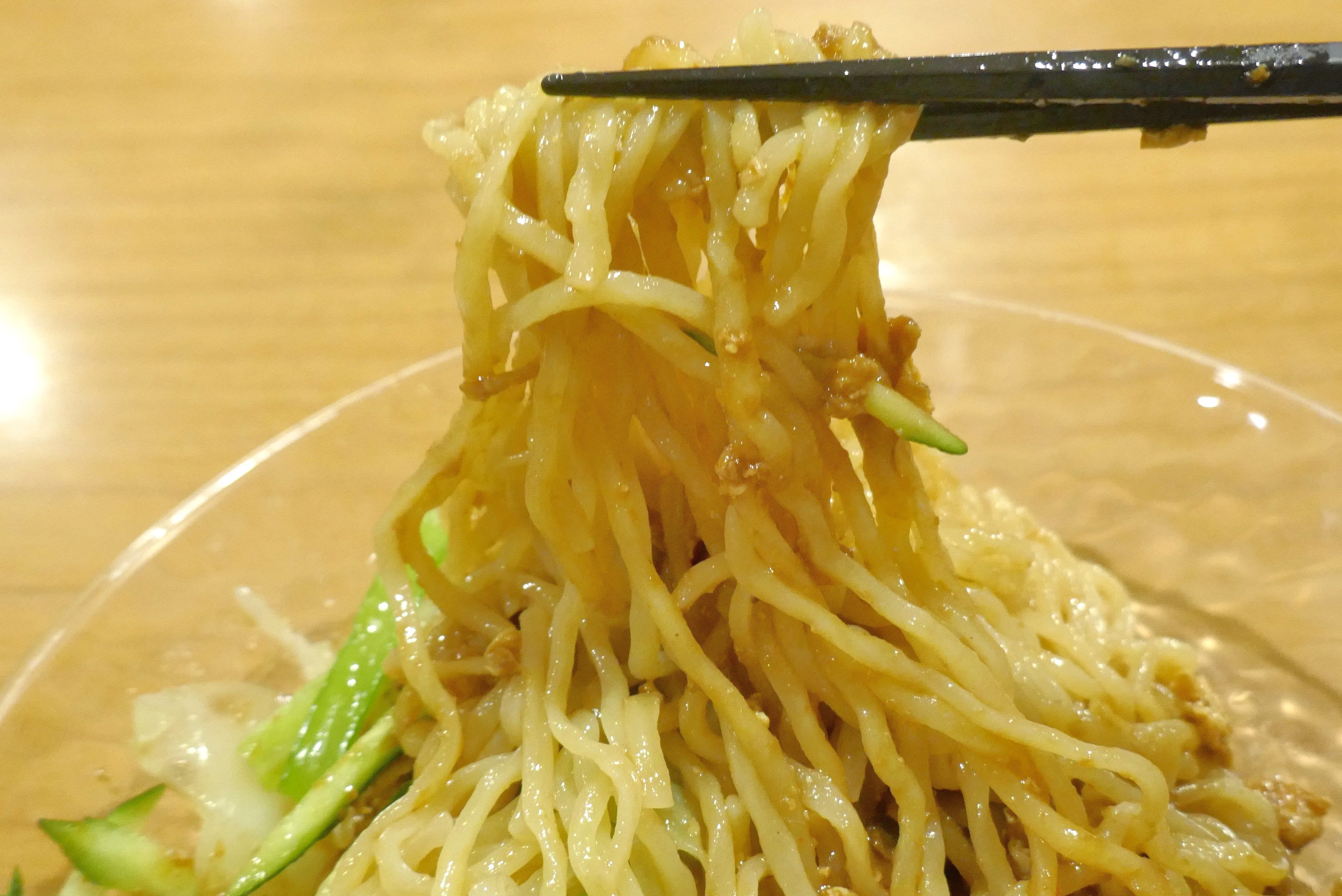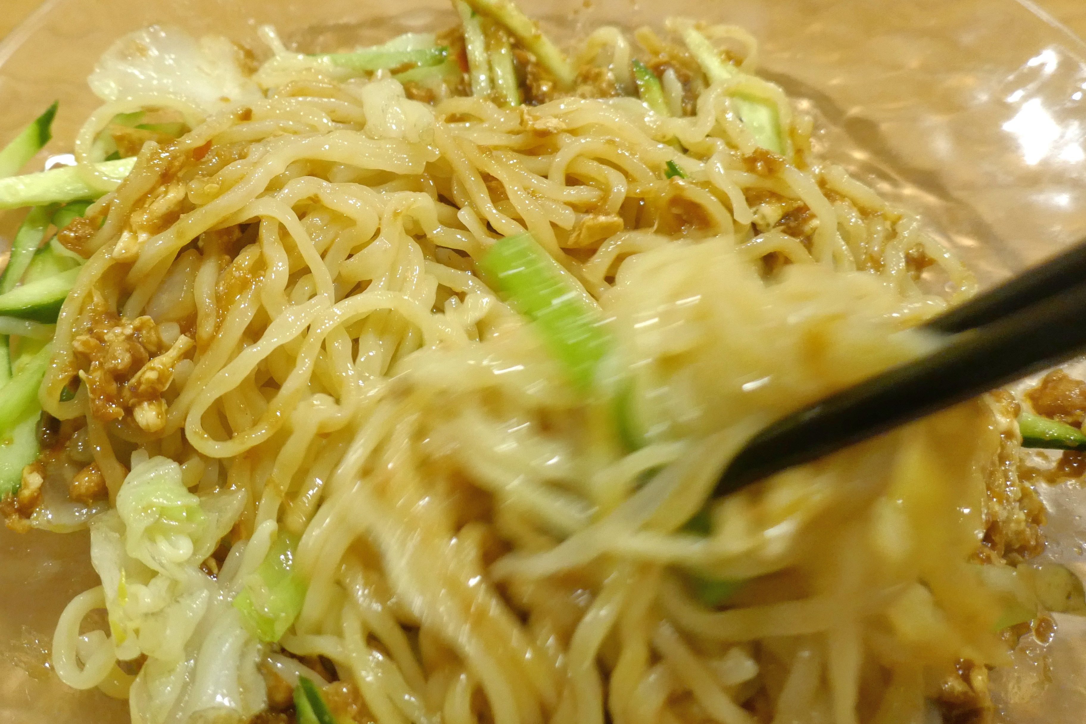 しっかりとかき混ぜたあとに食べてみると、塩辛くお肉の旨味、玉子の滑らかな食感、きのこの旨味満点な肉みそと、太めで腰のある麺がすこぶるマッチ!また、麺以外にきゅうり、茹でたキャベツが入っているので、思っていたよりも肉みその塩辛さは気になりませんでした。