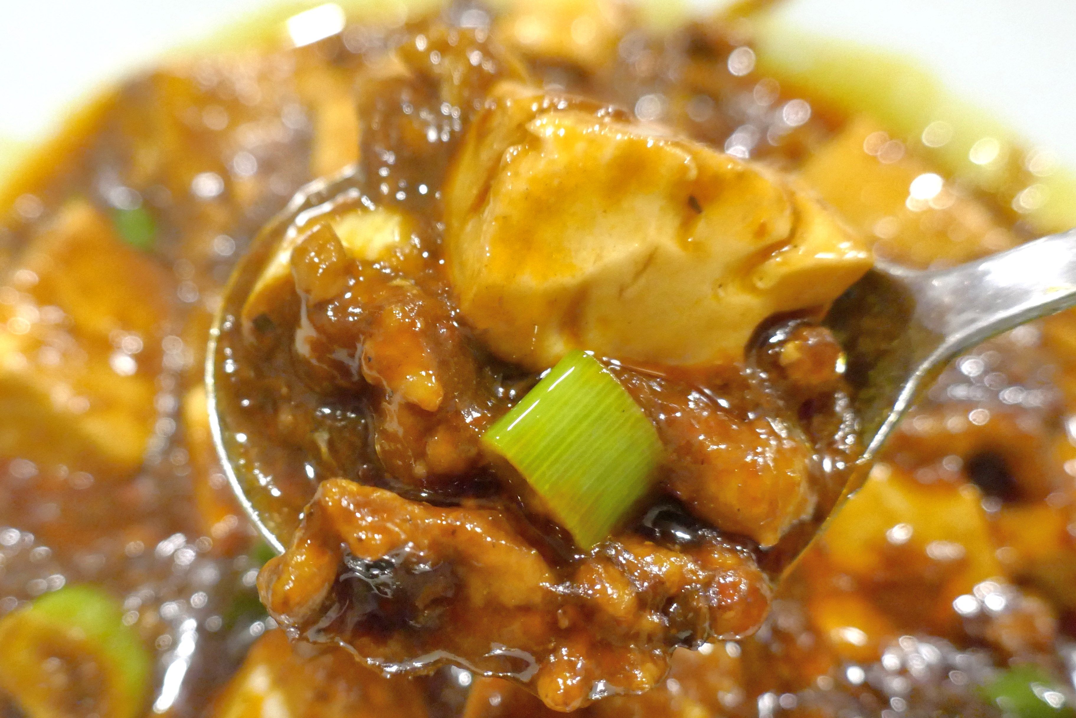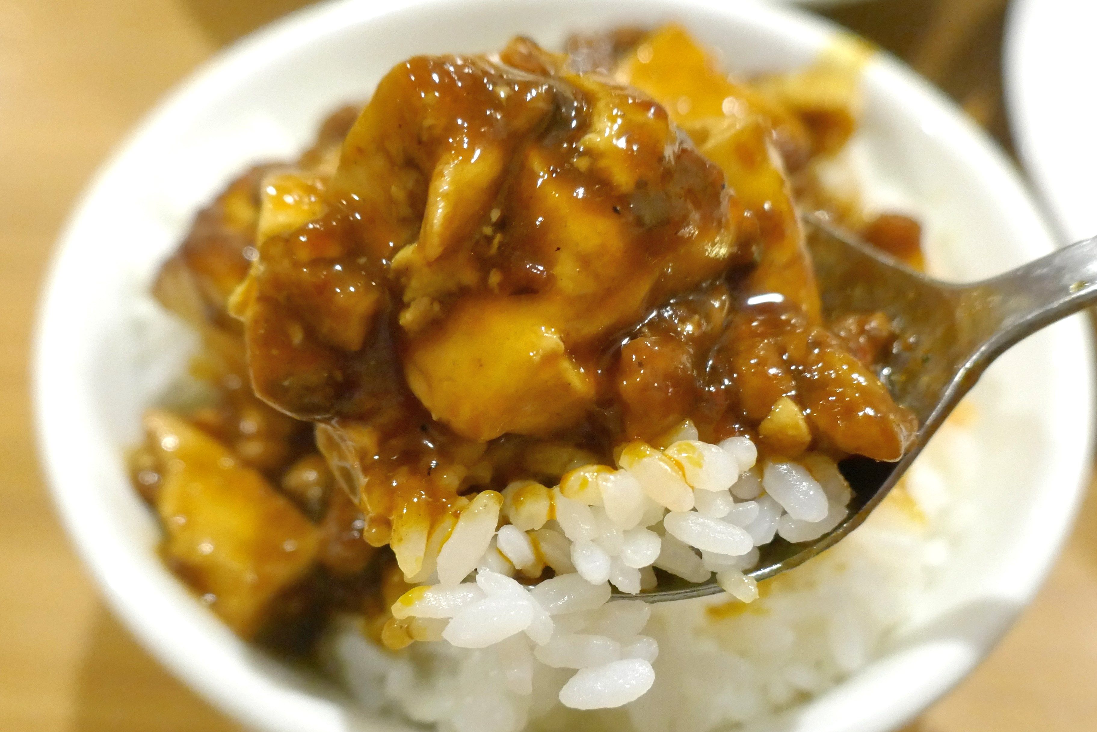 ご飯が来たたら即!パワフルな見た目の「羊肉入り麻婆豆腐」をOTR(On The Rice)します。