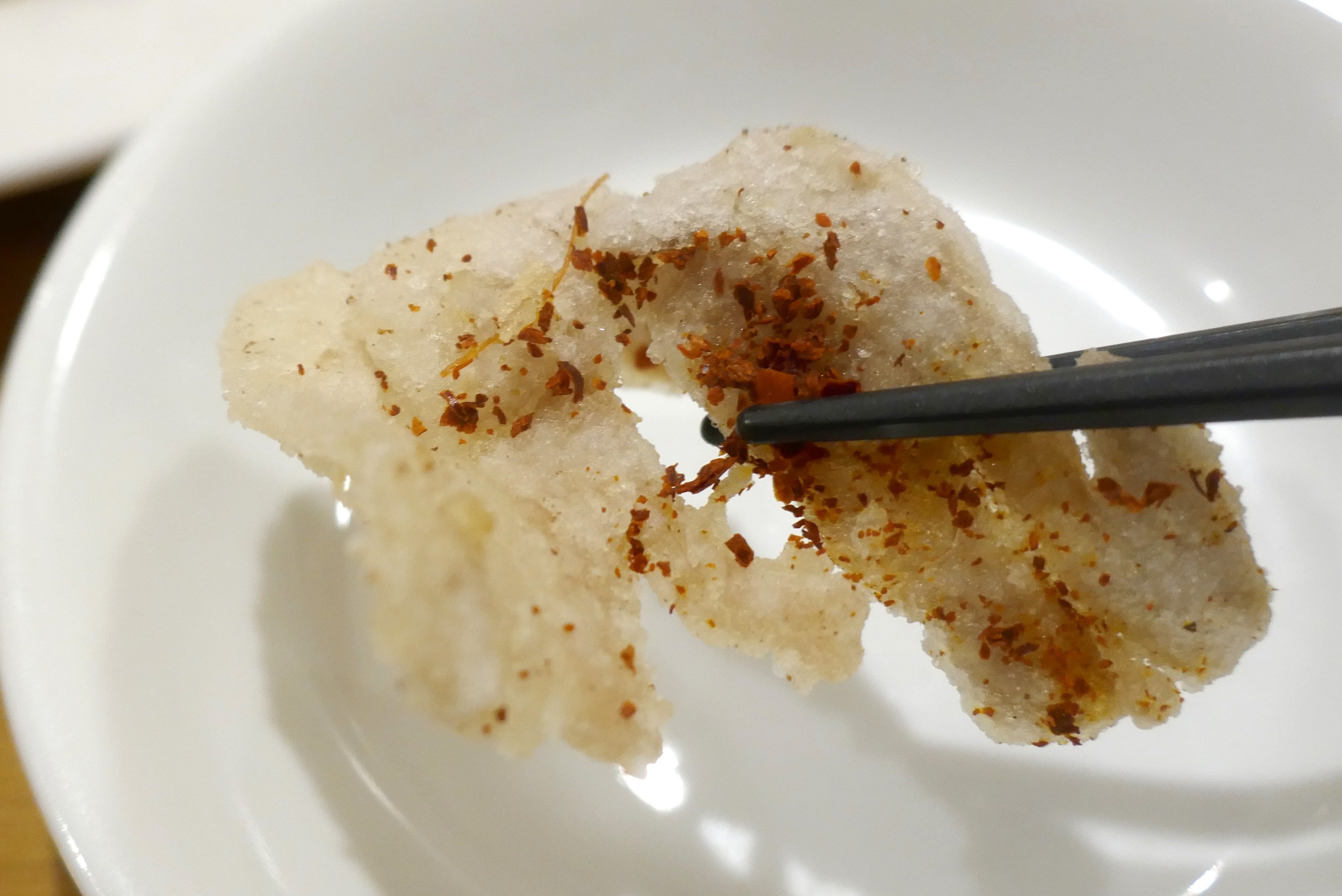 柔らかな食感でオイリーな風味に満ちた豚バラ肉に、カリカリ食感の片栗粉仕様の衣に、淡い塩気が効いた唐辛子&山椒風味の調味料がマッチ!ボリューム&味も良好で大変オススメです!