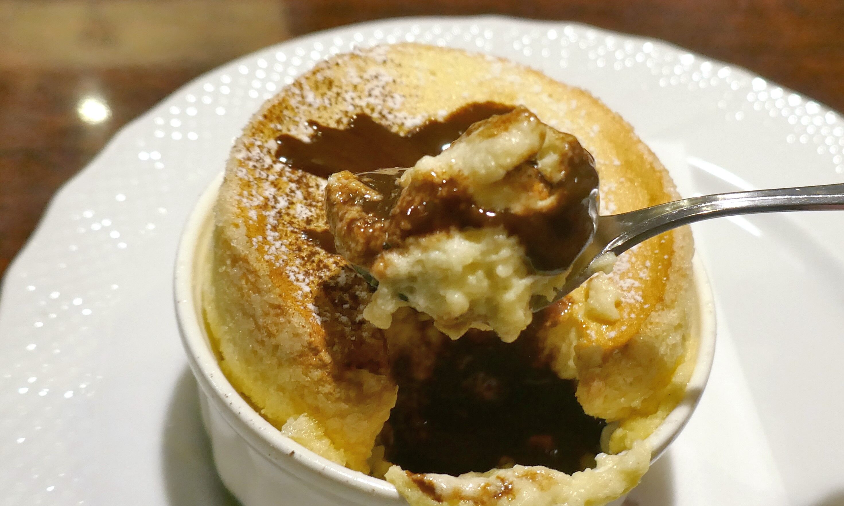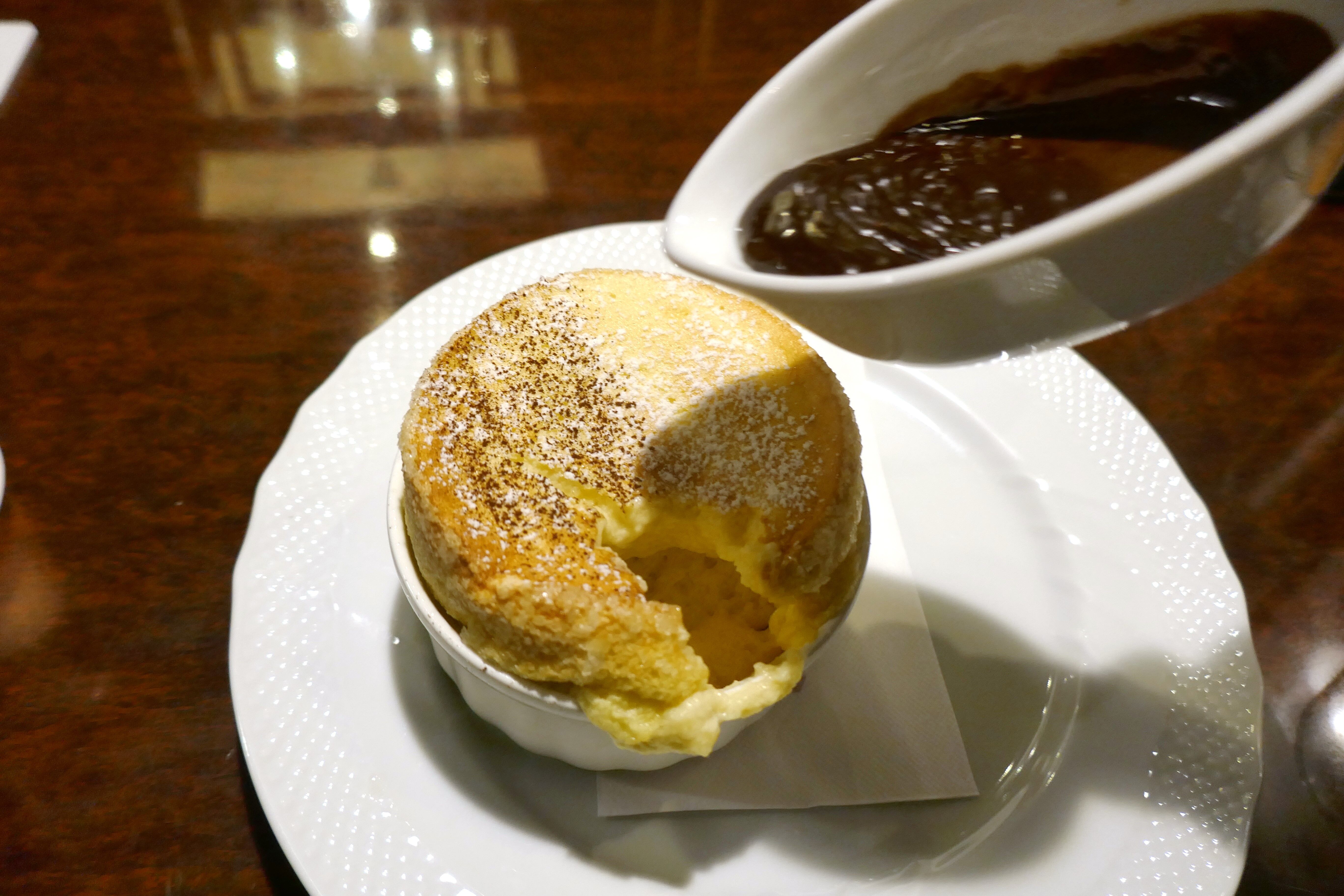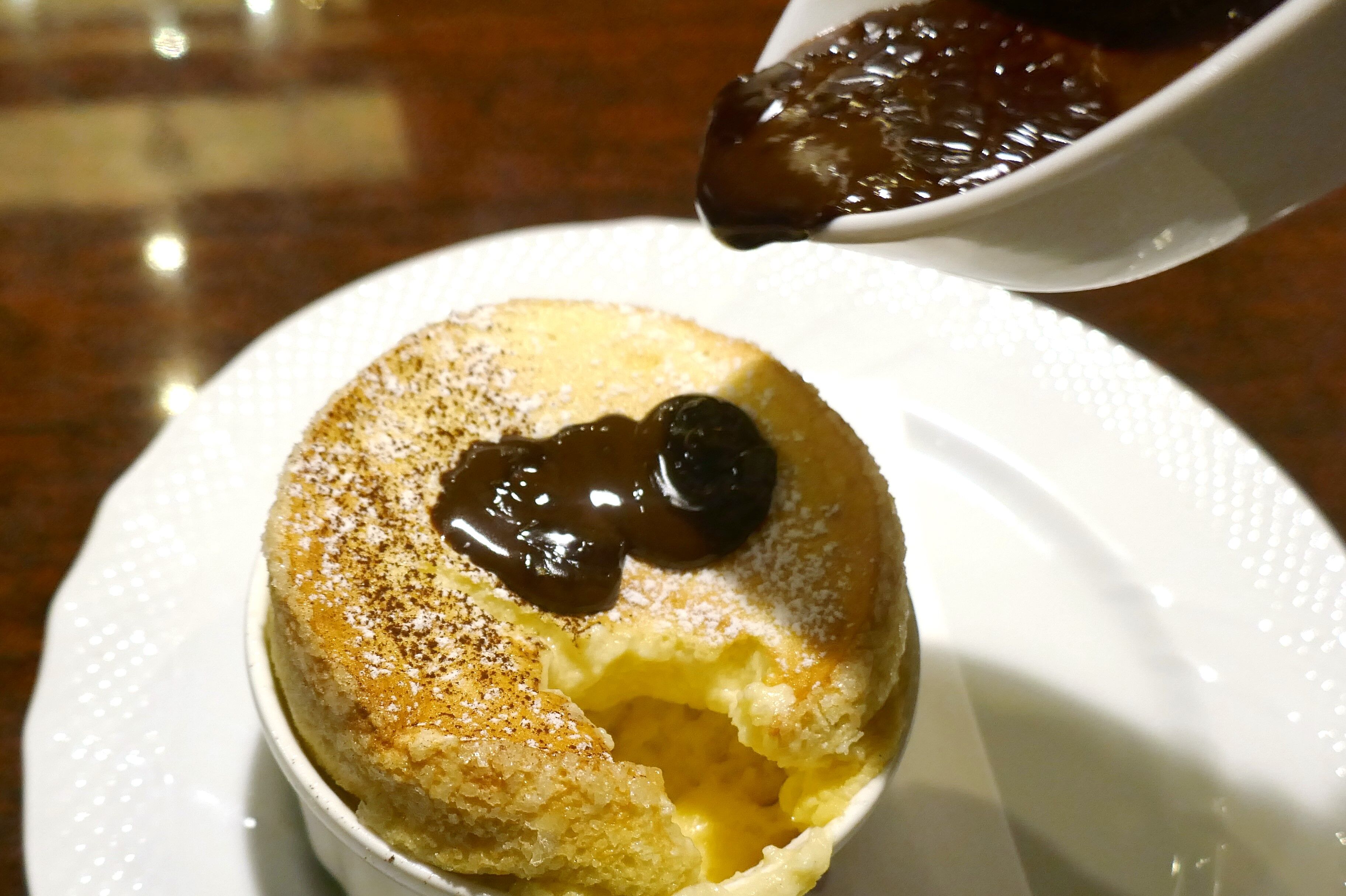 素のままの状態で「窯焼きスフレ」を楽しんだら生チョコレートソースを「窯焼きスフレ」に投下!