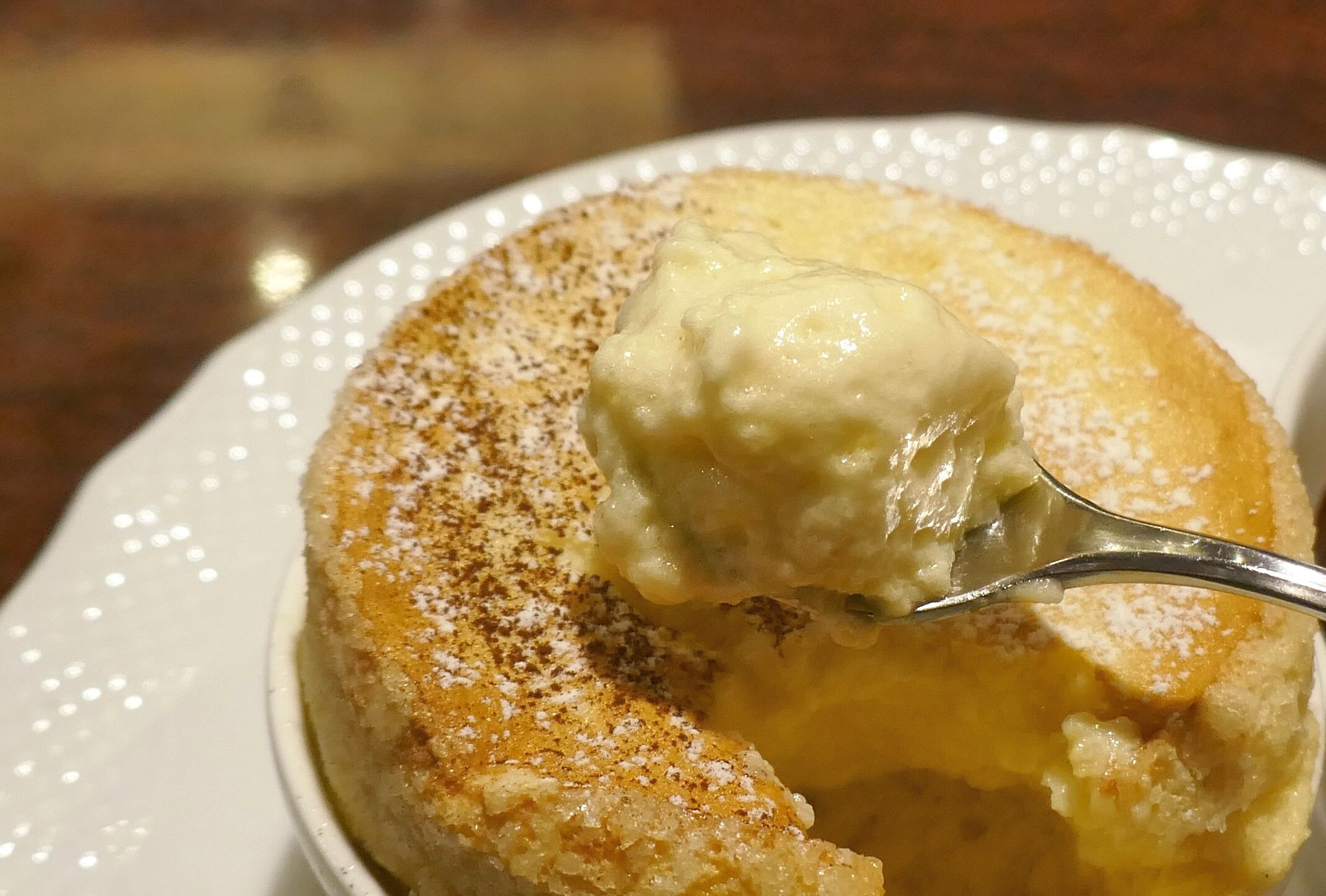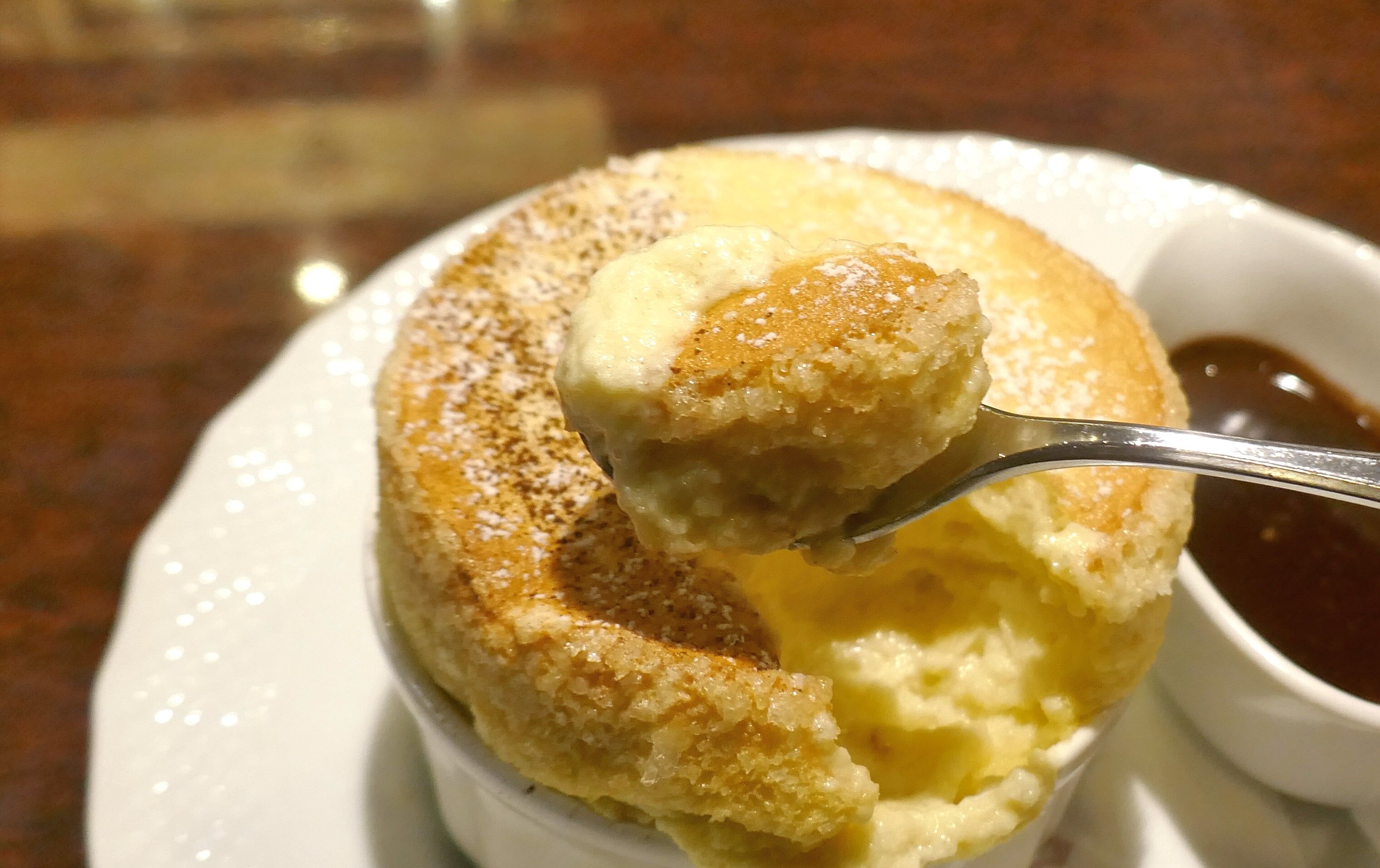 生チョコレートソースを絡めた「窯焼きスフレ」は、カリッとした食感と柔らかく甘々で卵の風味が効いたスフレ生地にコクと甘味マシマシな生チョコレートソースが馴染んでメチャスイート!