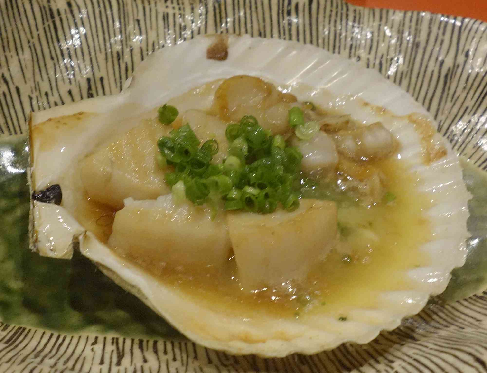 ホタテの殻焼きは紐も同時に焼かれたお汁たっぷりな一品で