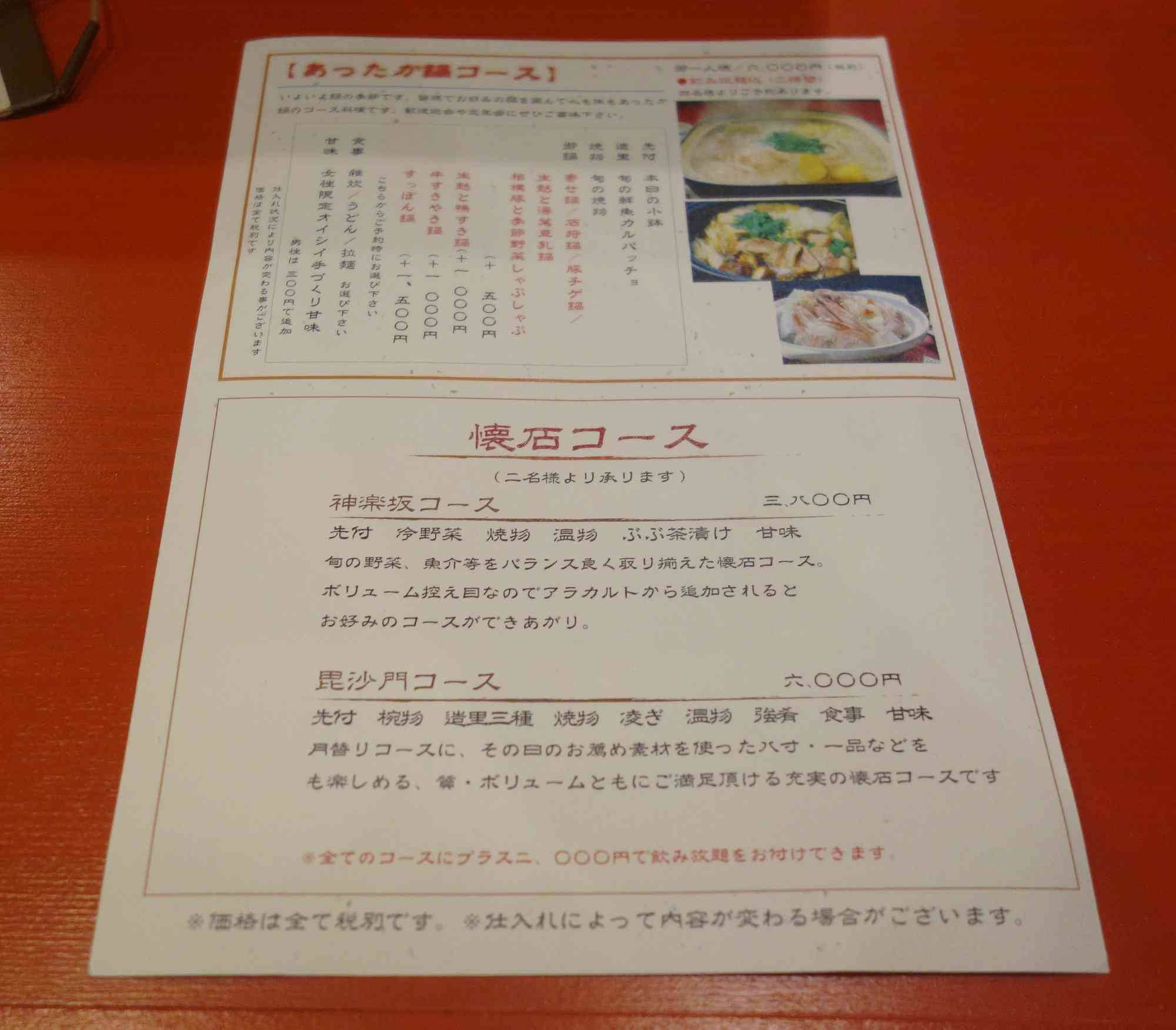 あったか鍋コース、神楽坂コース、毘沙門コースと続きます。