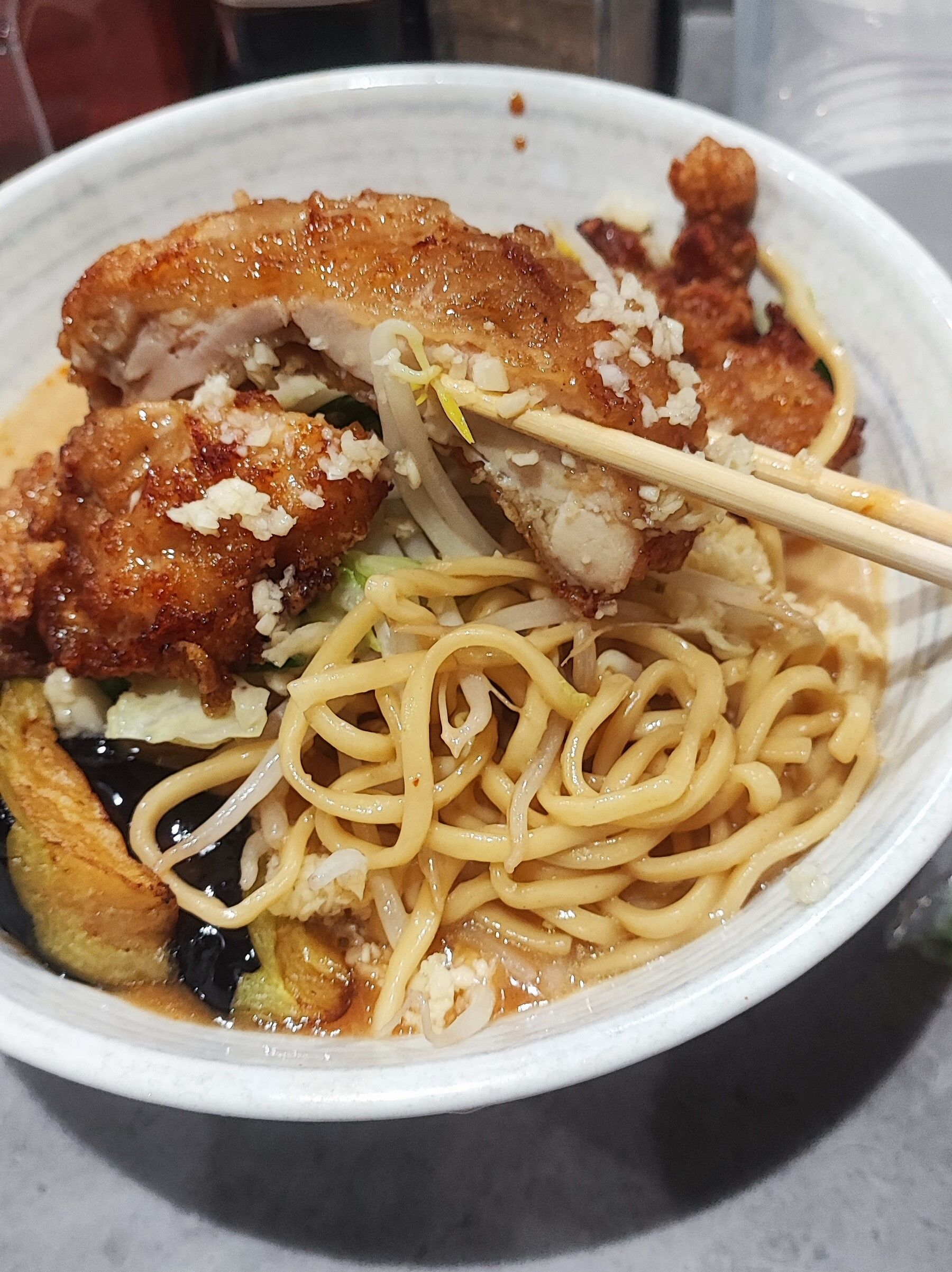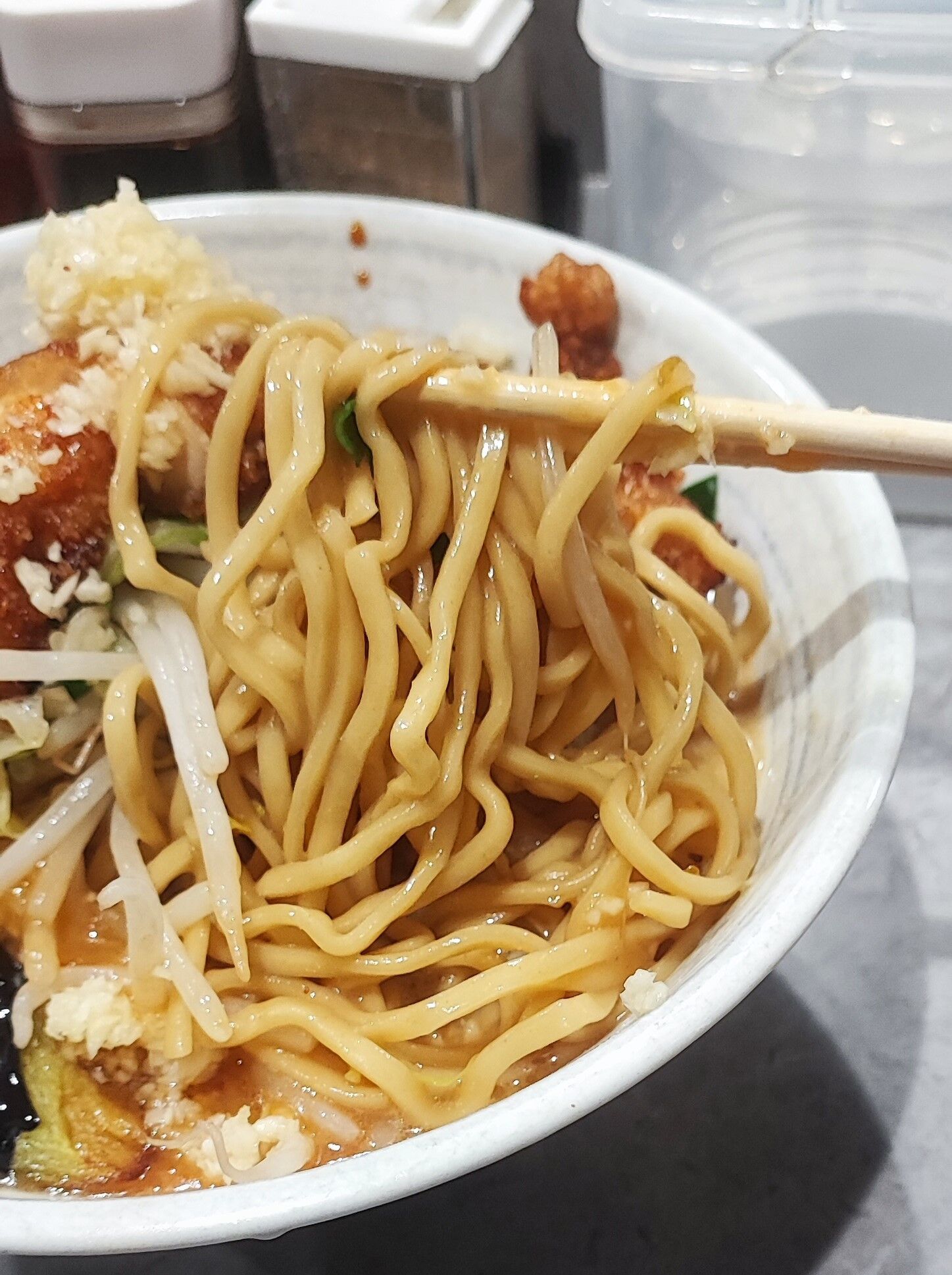 麺は太く腰も強めで、旨味と辛味が入り混じるスープになじんで味もバッチリ!