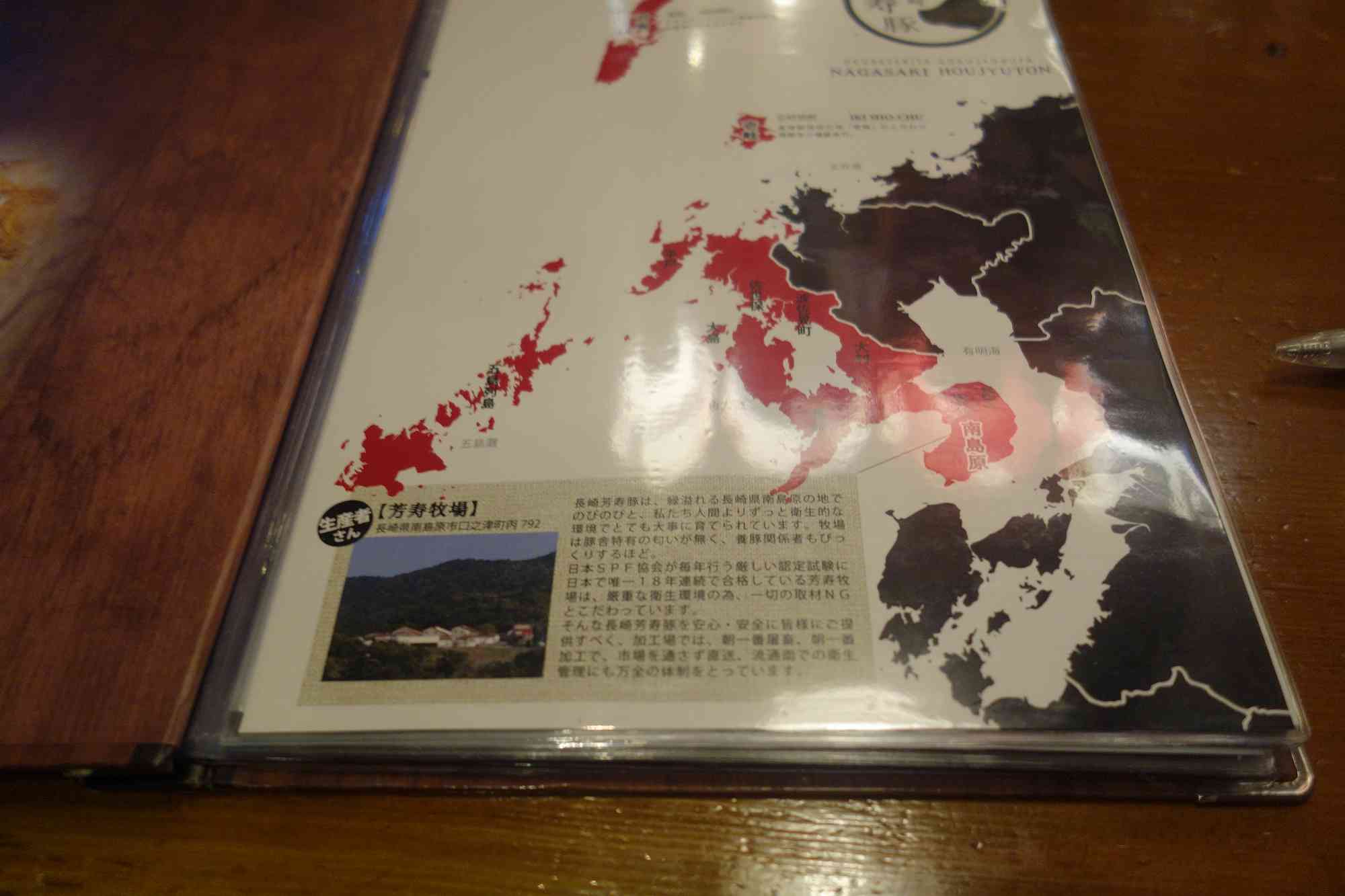 長崎系食材使用の居酒屋とあって長崎県部分を強調した地図が最初のページに描かれ