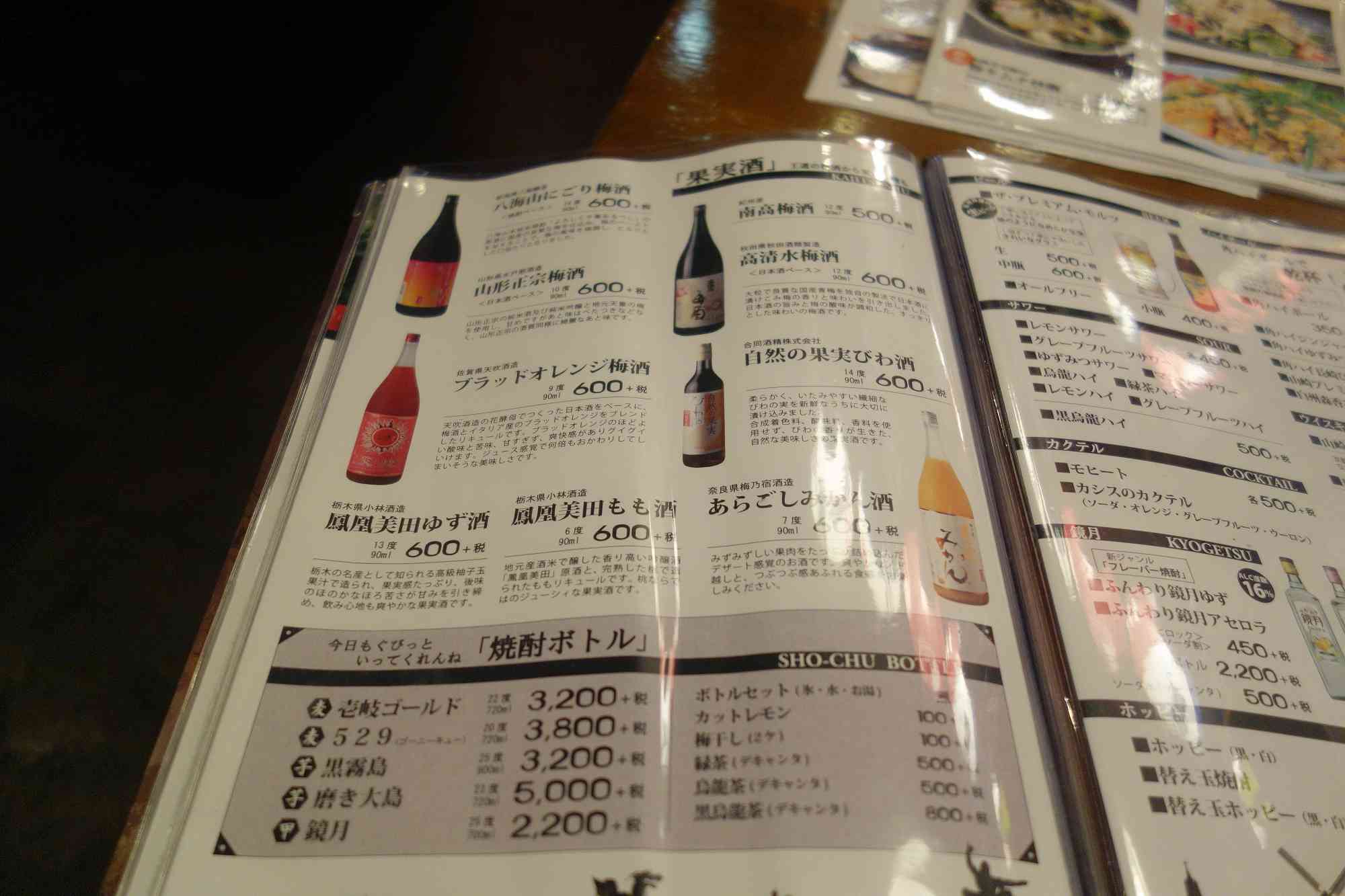 果実酒と焼酎ボトルメニュー