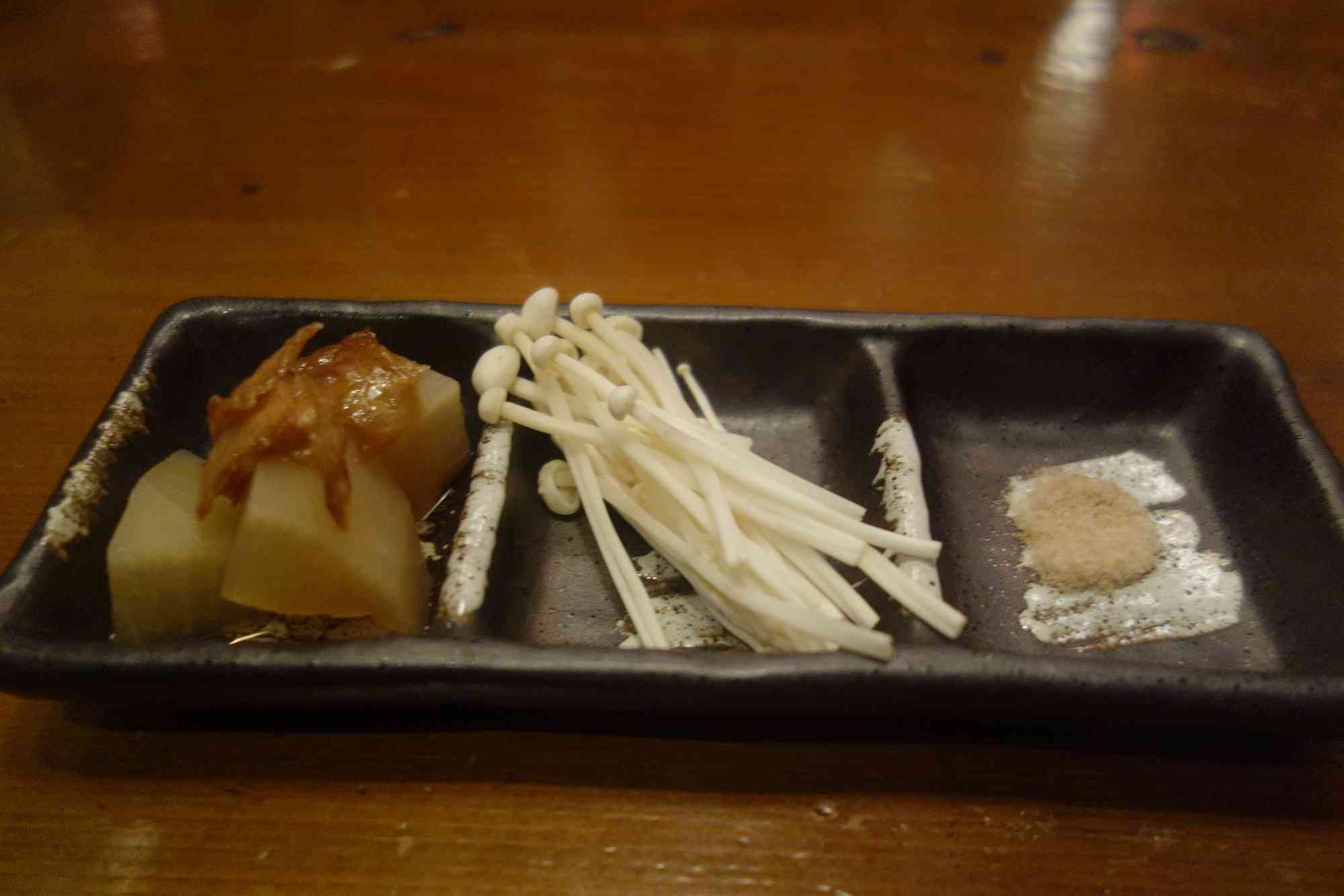 最初に運ばれてきたのは肉ではなく、肉と一緒に食べる大根の薄切りと調味料で