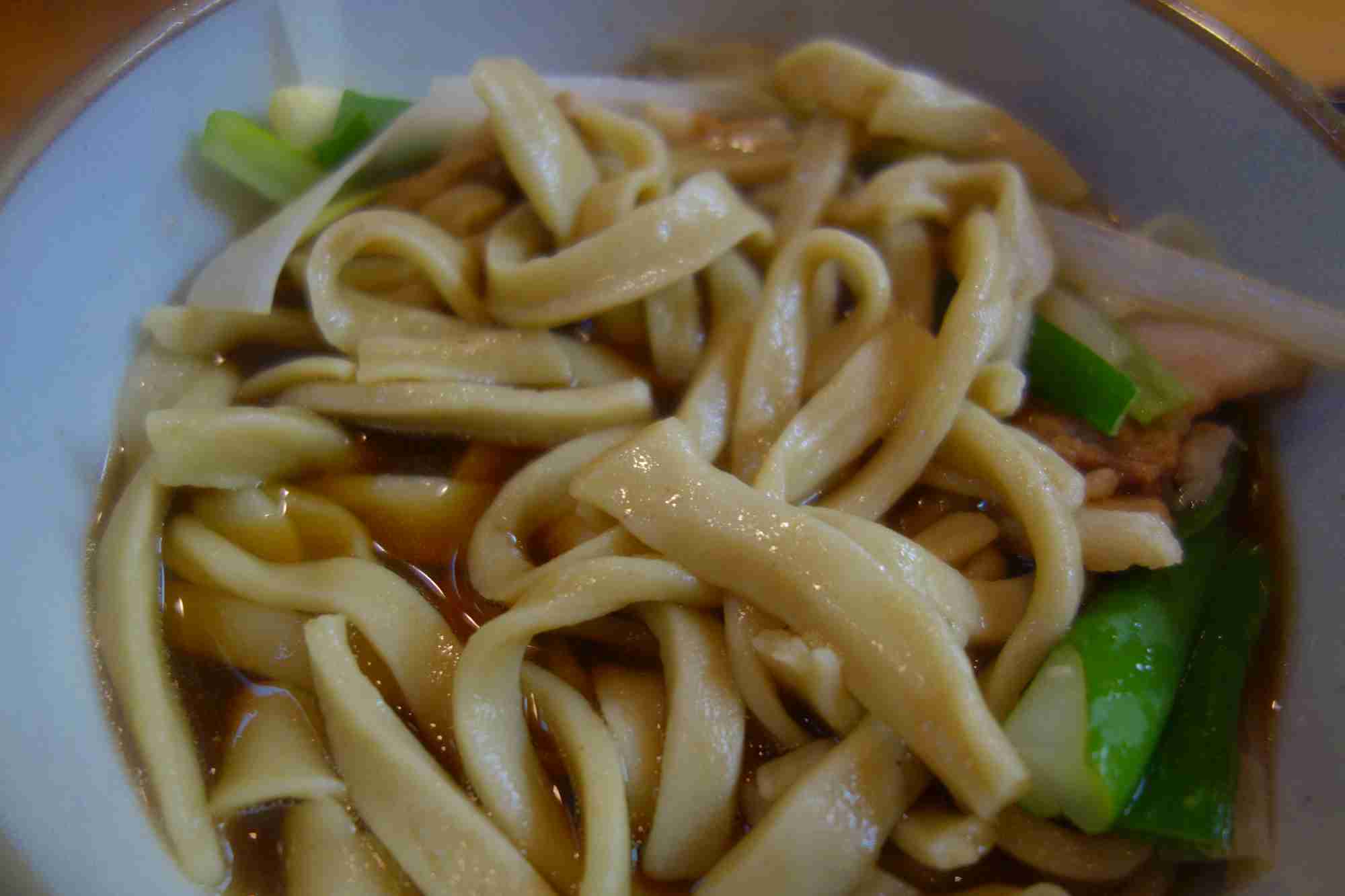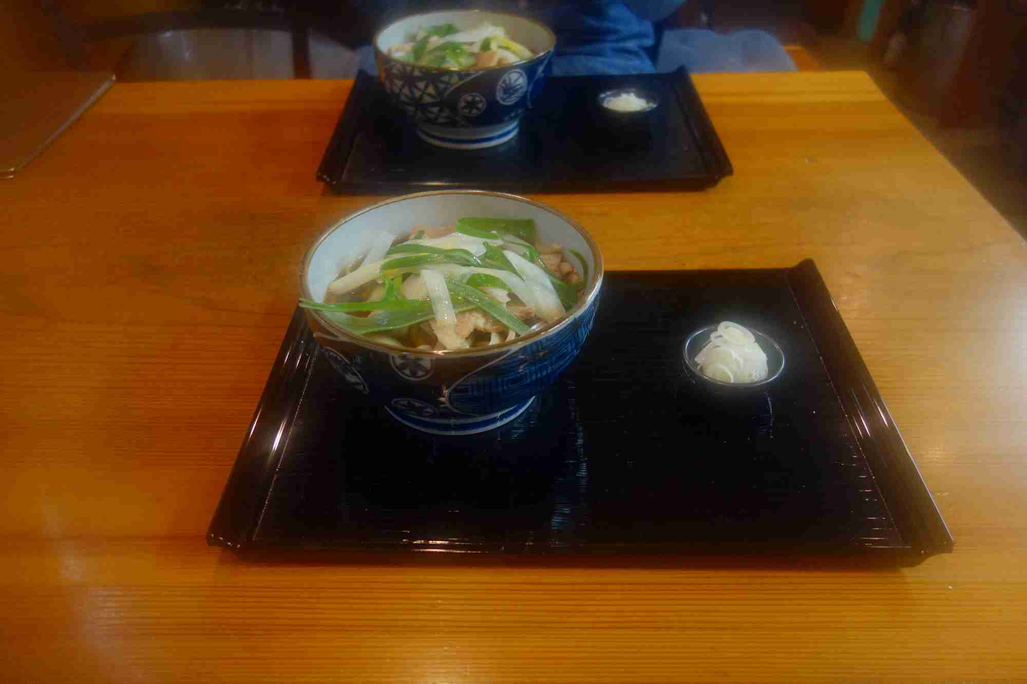 肉南蛮太麺は、ネギとお肉の下に太い蕎麦麺が隠れている一品で