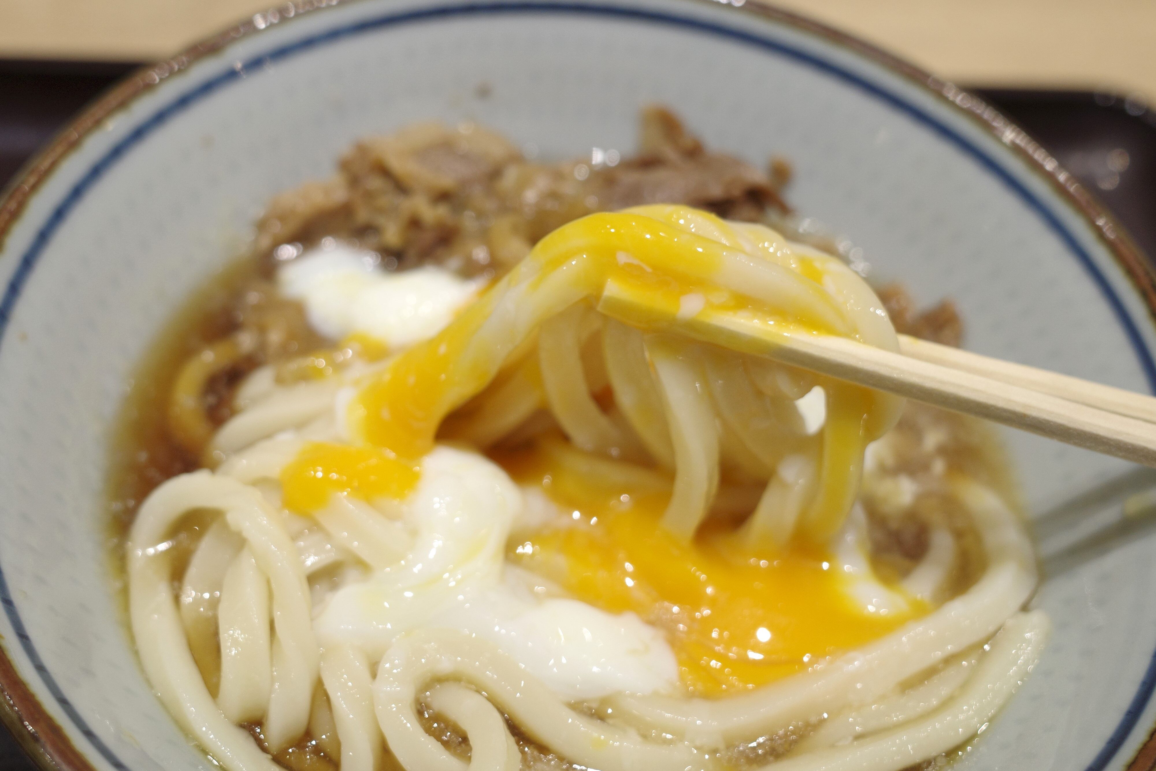 サクッとうどんと牛肉を楽しんだら、うどんに温玉を絡めてみると、黄身のコク、白身の淡白な風味が加算されて堅実にウマさレベルアップ!