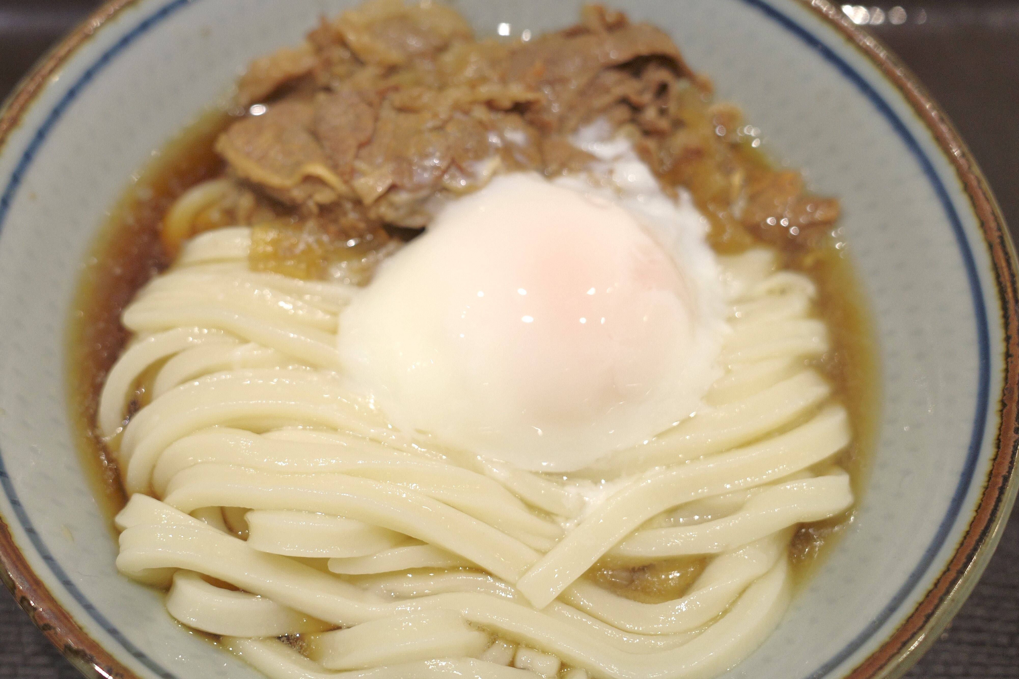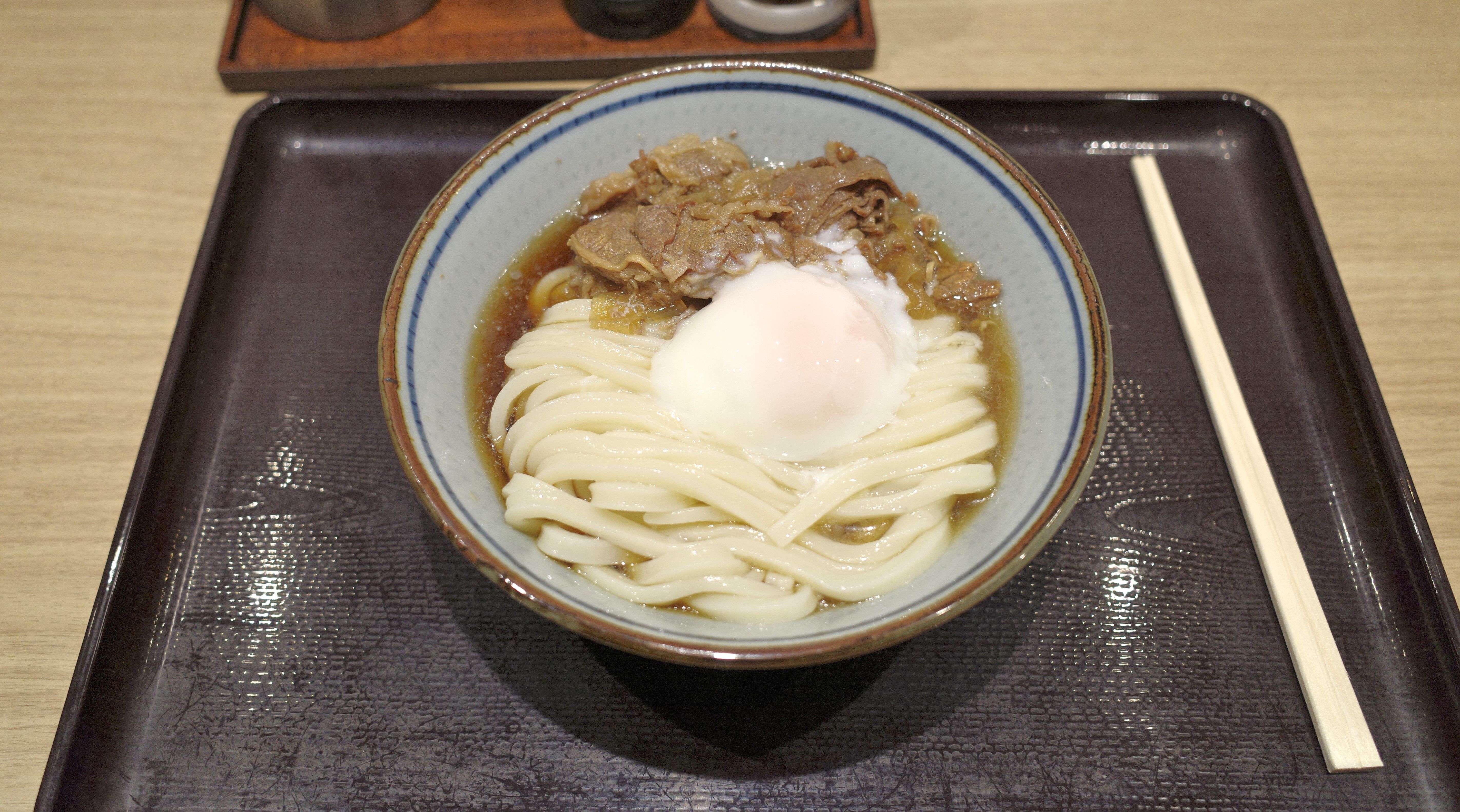 うどんの上には牛肉、温玉がバランス良く盛り付けられています!