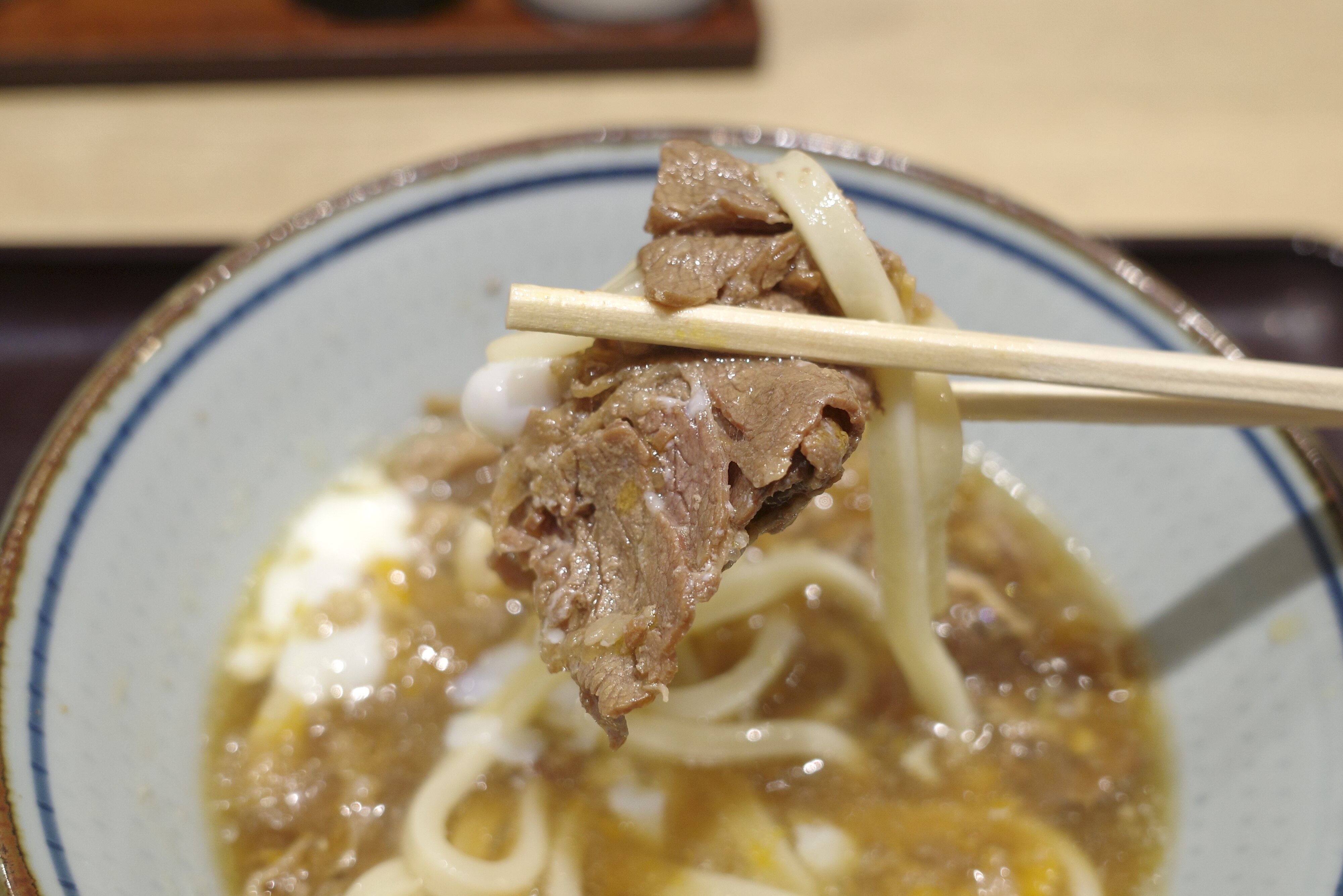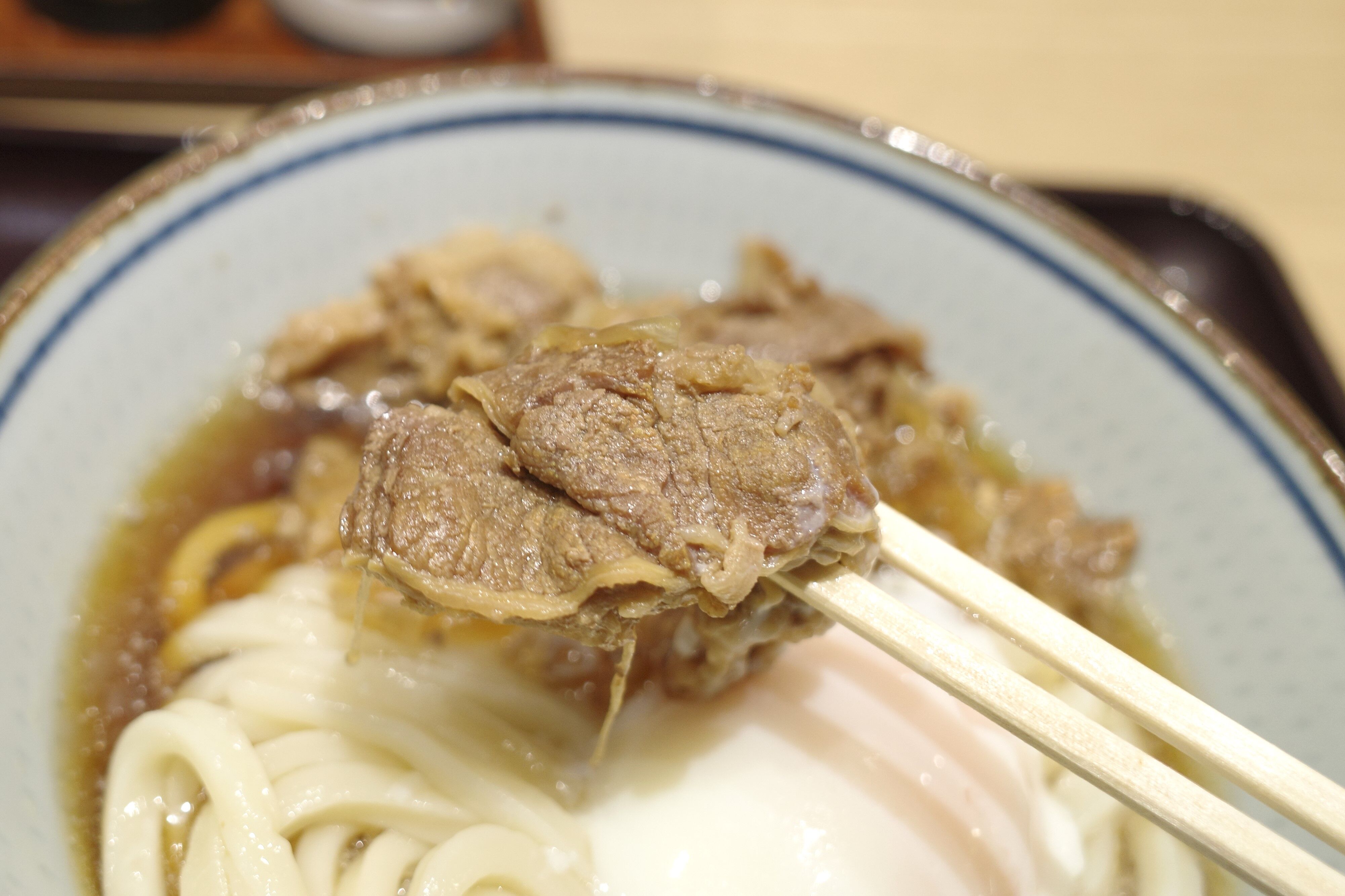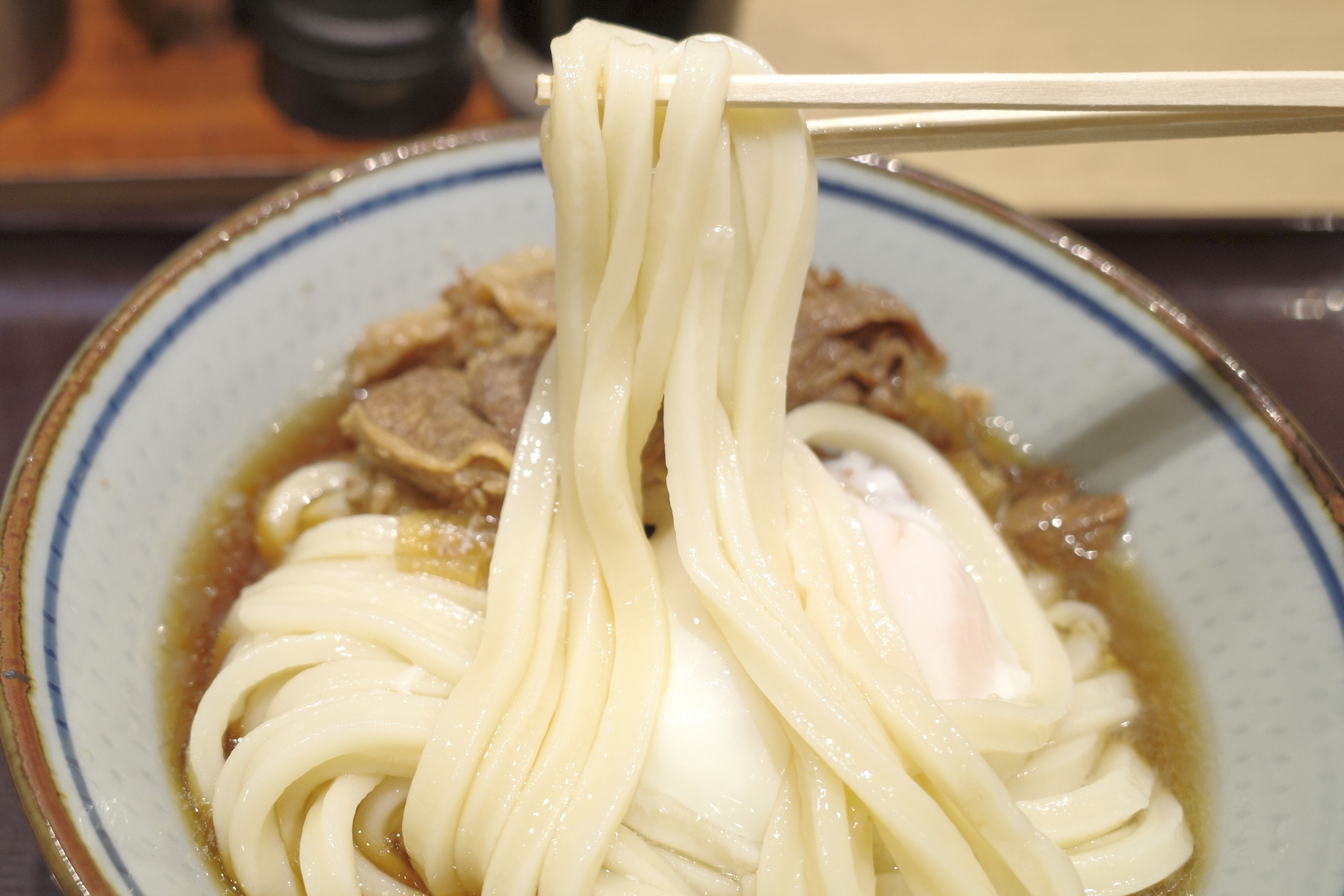 太めのうどんは強いコシ、ツヤ、グミのようなモチモチ感が相互に感じられてウマー!牛肉から染み出した甘いタレや、力強い出汁ともマッチする点が吉!