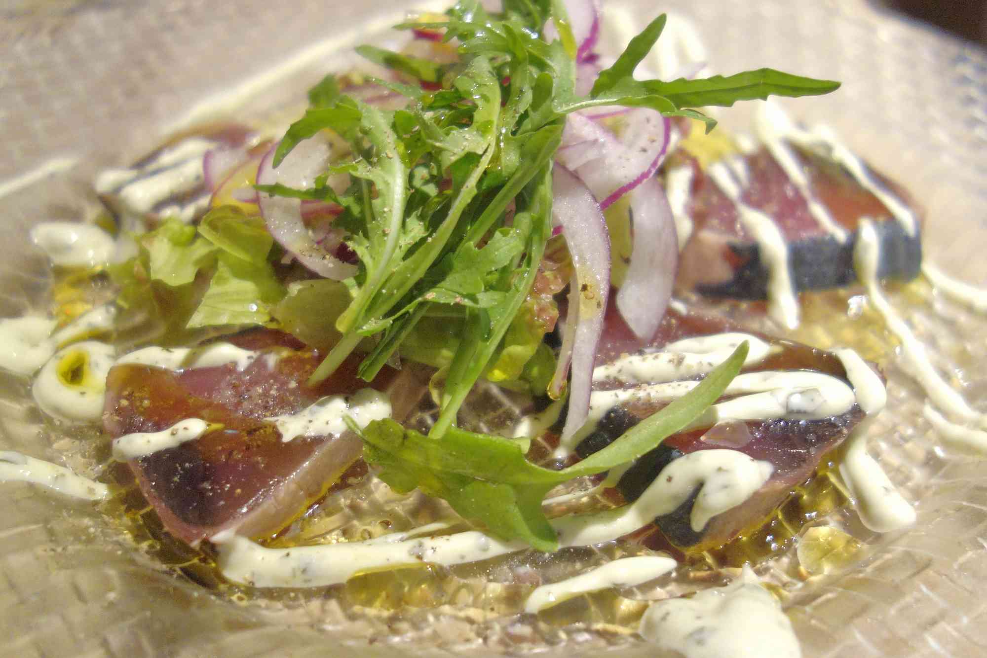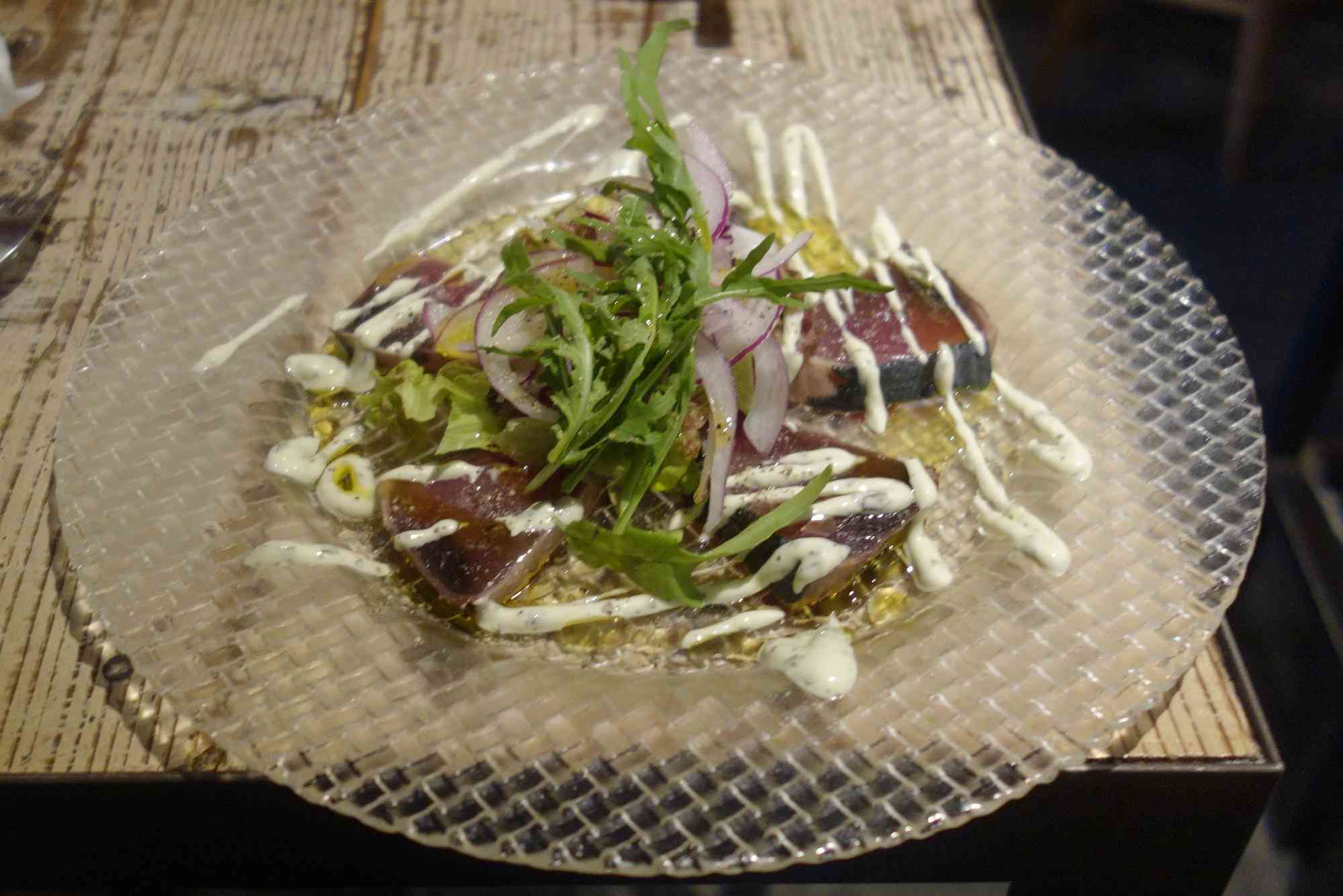 その後はカツオの厚切りカルパッチョバジルマヨネーズ680円を注文し