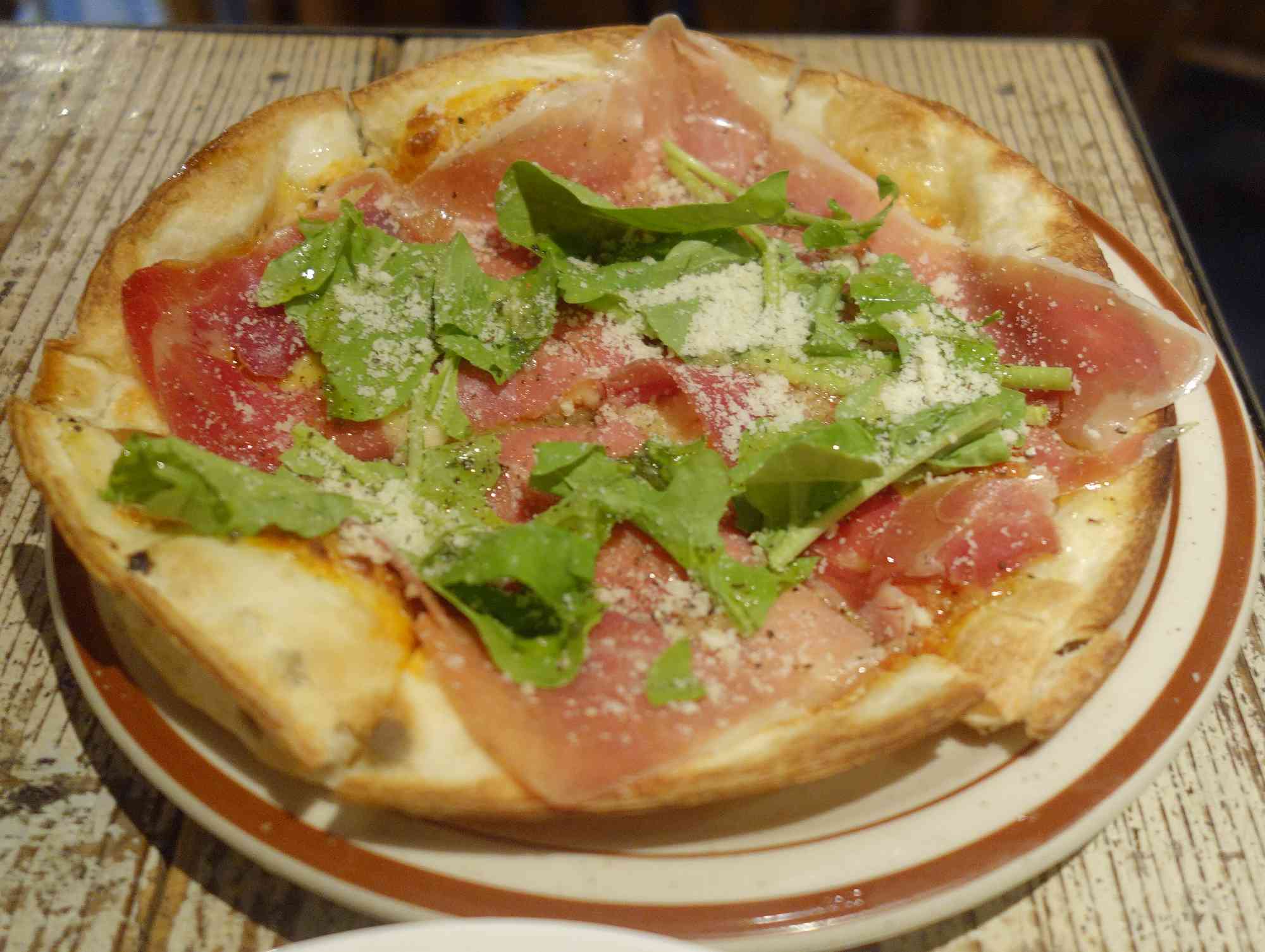 最後に生ハムのインパクトが強い、生ハムとモッツァレラ、ルッコラのピッツァ980円を食し