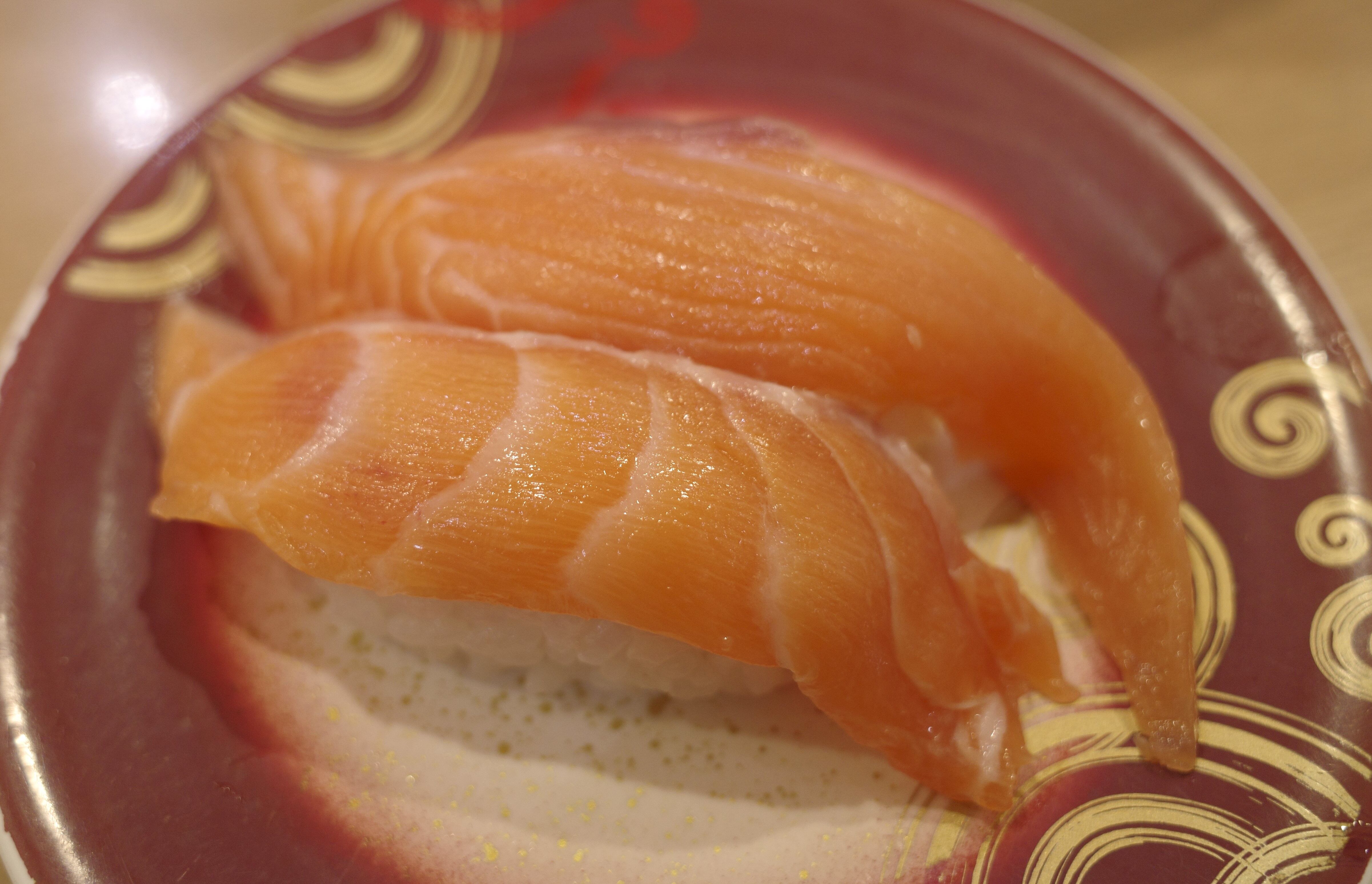 「厳選生サーモン」374円は、分厚くオイリーな旨味豊か!