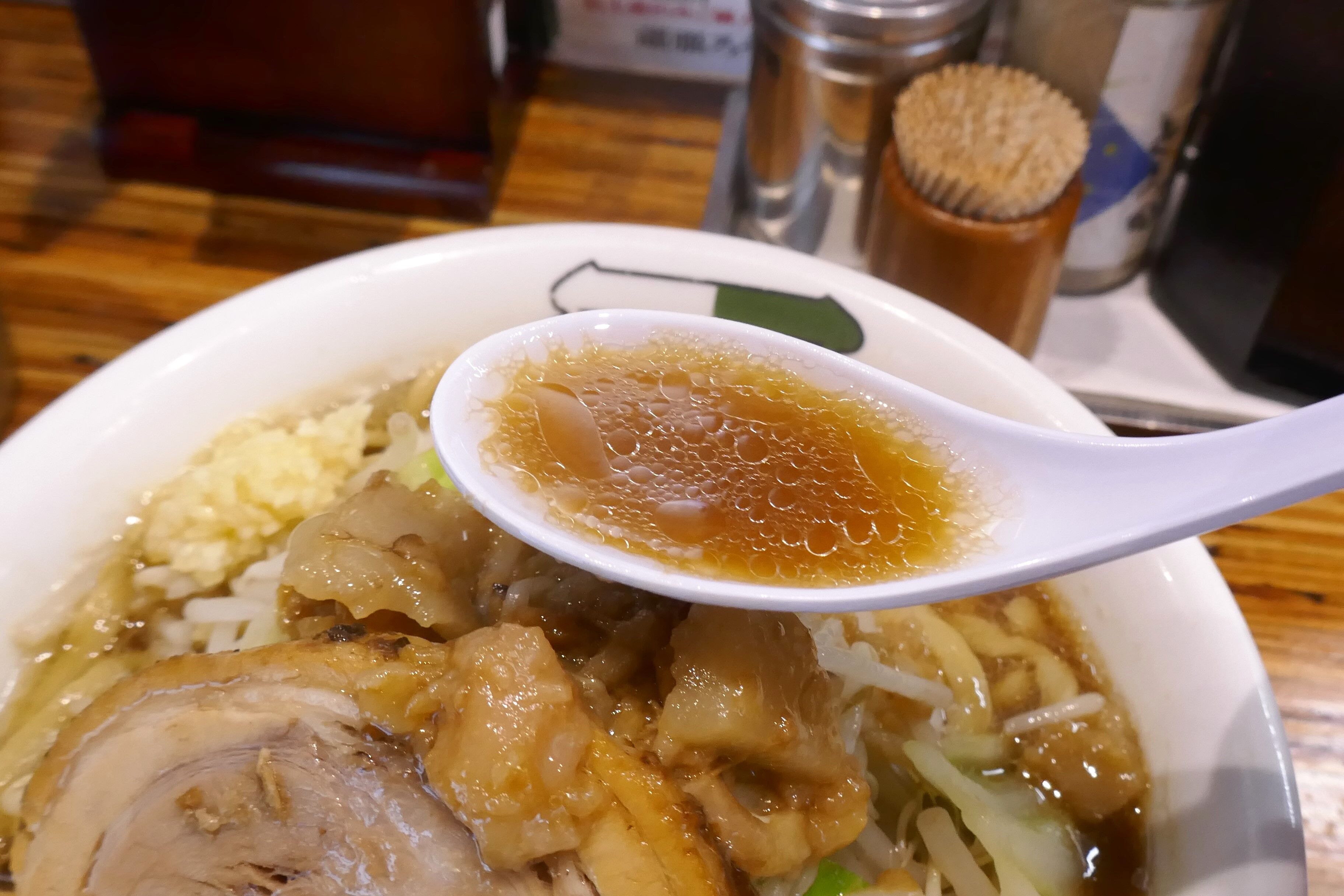 まずはスープから飲んでみると、甘味、塩気、旨味がバランス良く効いて二郎インスパイヤにしては上品な美味しさ!