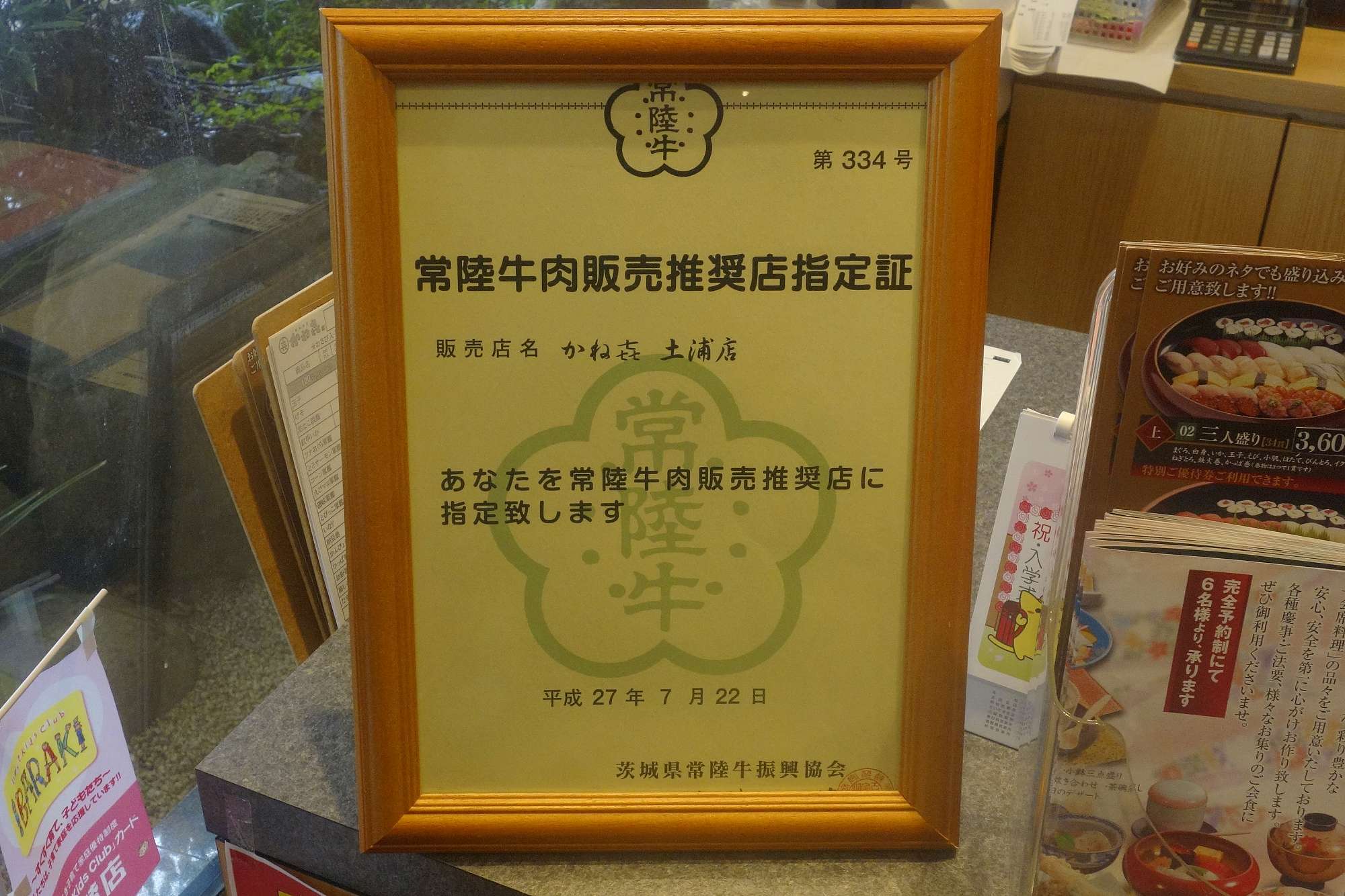 店内に移動すると、常陸牛販売推奨店指定証があり、肉寿司メニューにも期待します。