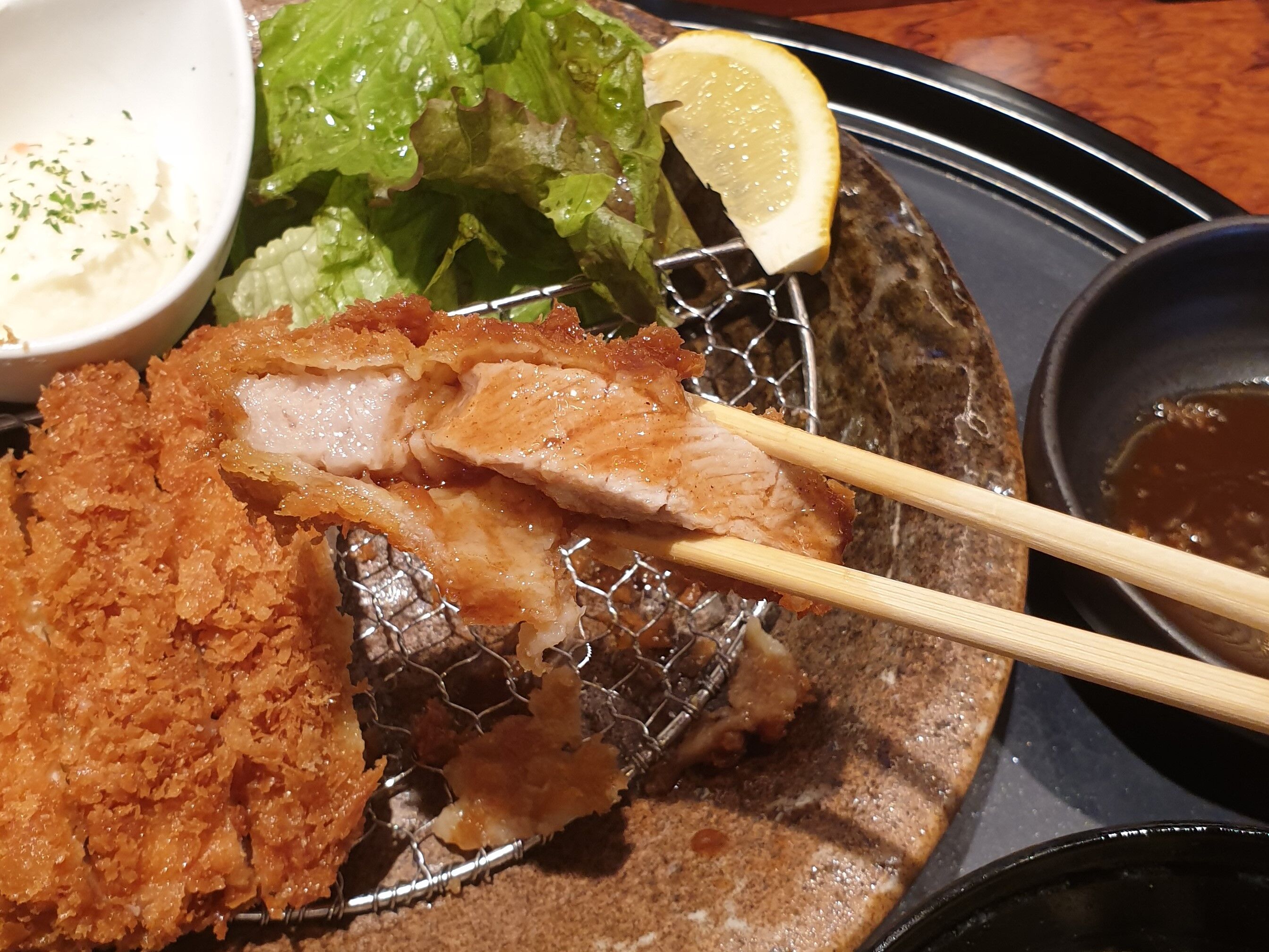 まずは、シンプルにかつを食べてみると、分厚くジューシーでオイリーな旨味満点!
