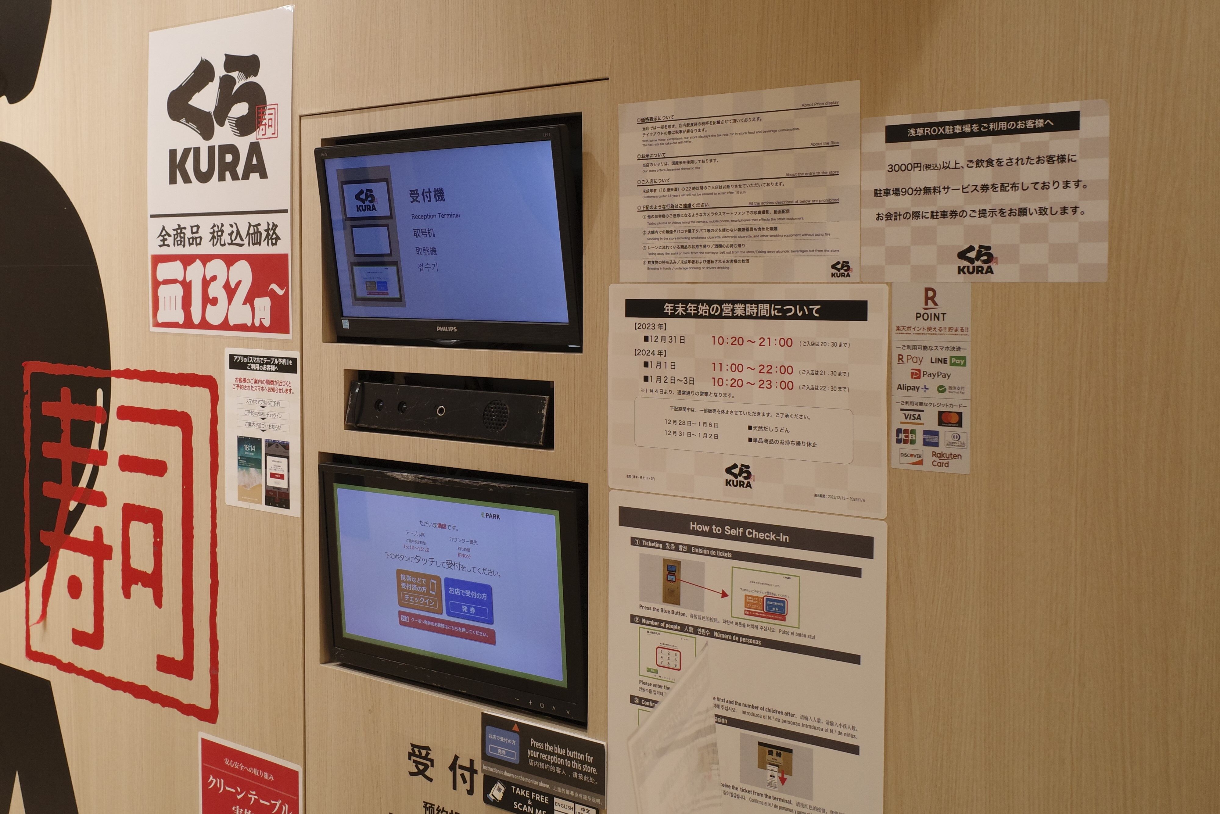 「くら寿司 浅草ROX店」のある階層へとたどり着いたら、お店手前の受付端末で受付処理を早々に処理!