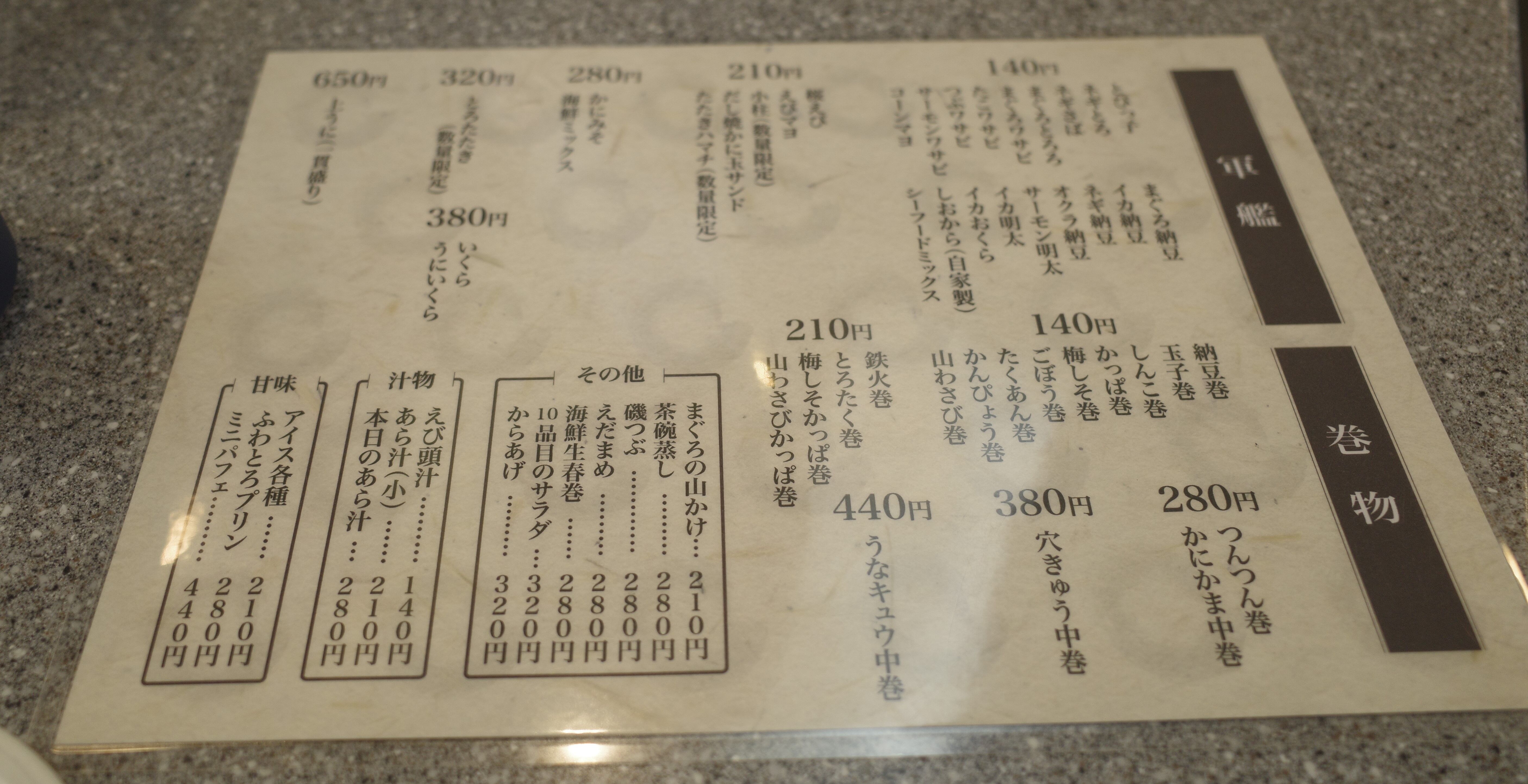 寿司メニューは軍艦、巻物、各種一品メニュー。