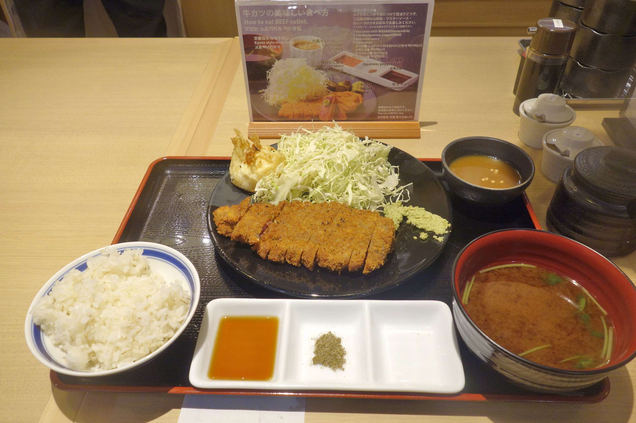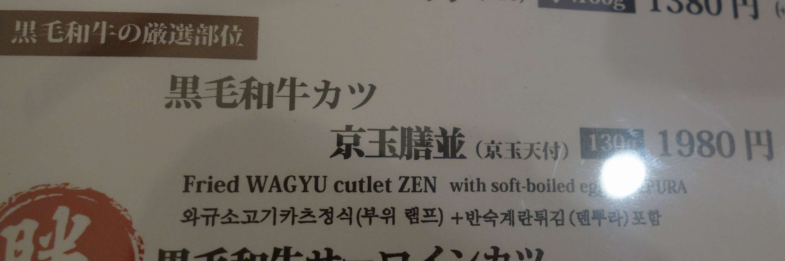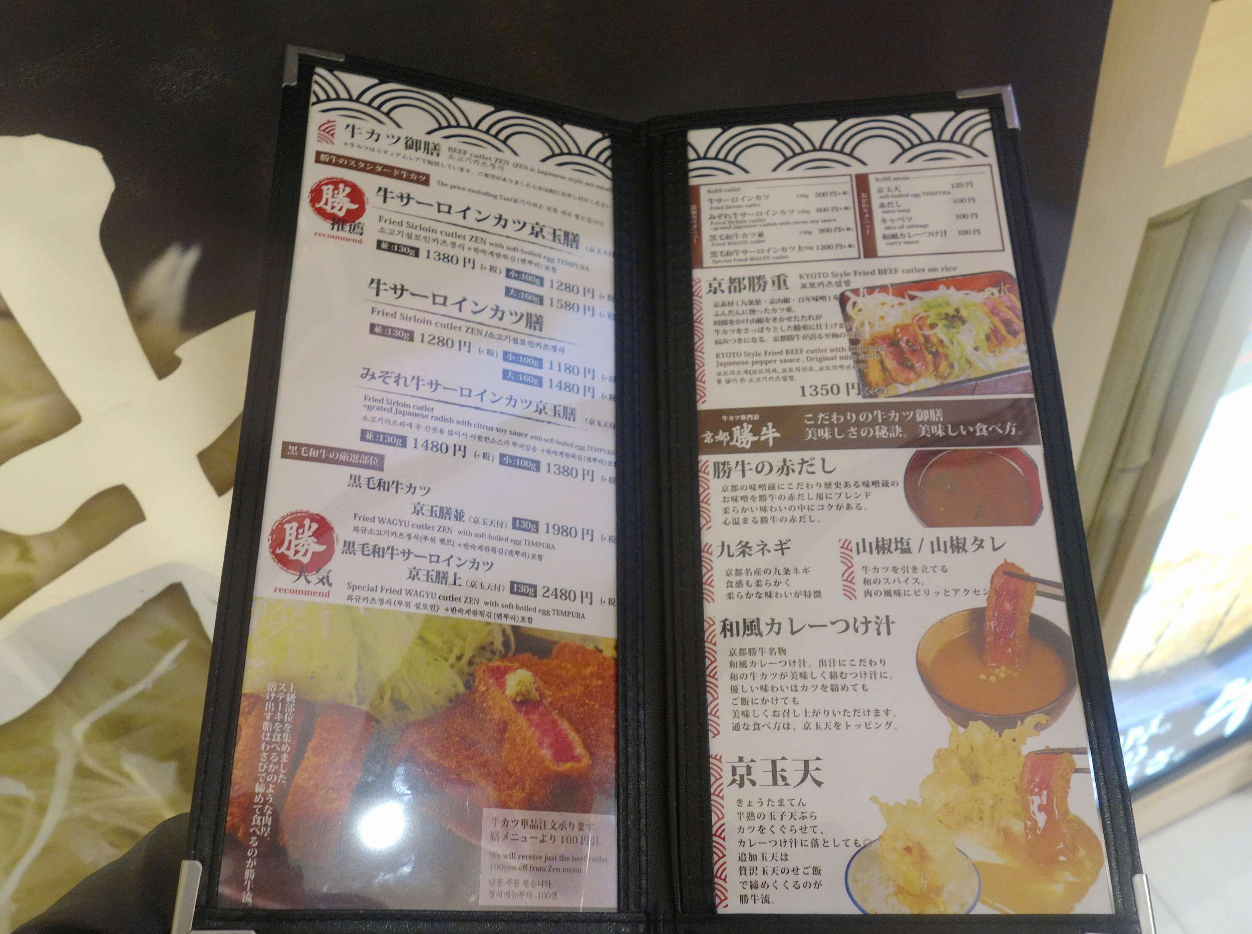 メニュー表は先日足を運んだ小川町店と変わらず、牛サーロインかつや黒毛和牛カツに、京都勝重、牛カツについてくる料理の解説