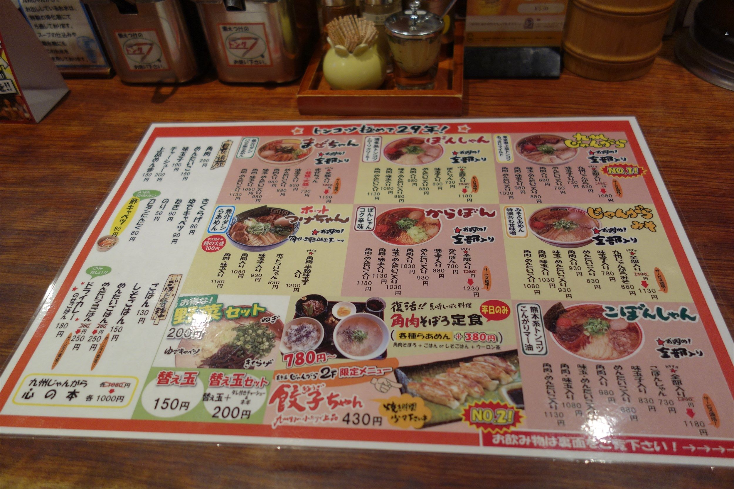 メニューは各種ラーメンに加えて、餃子、定食、トッピングメニュー