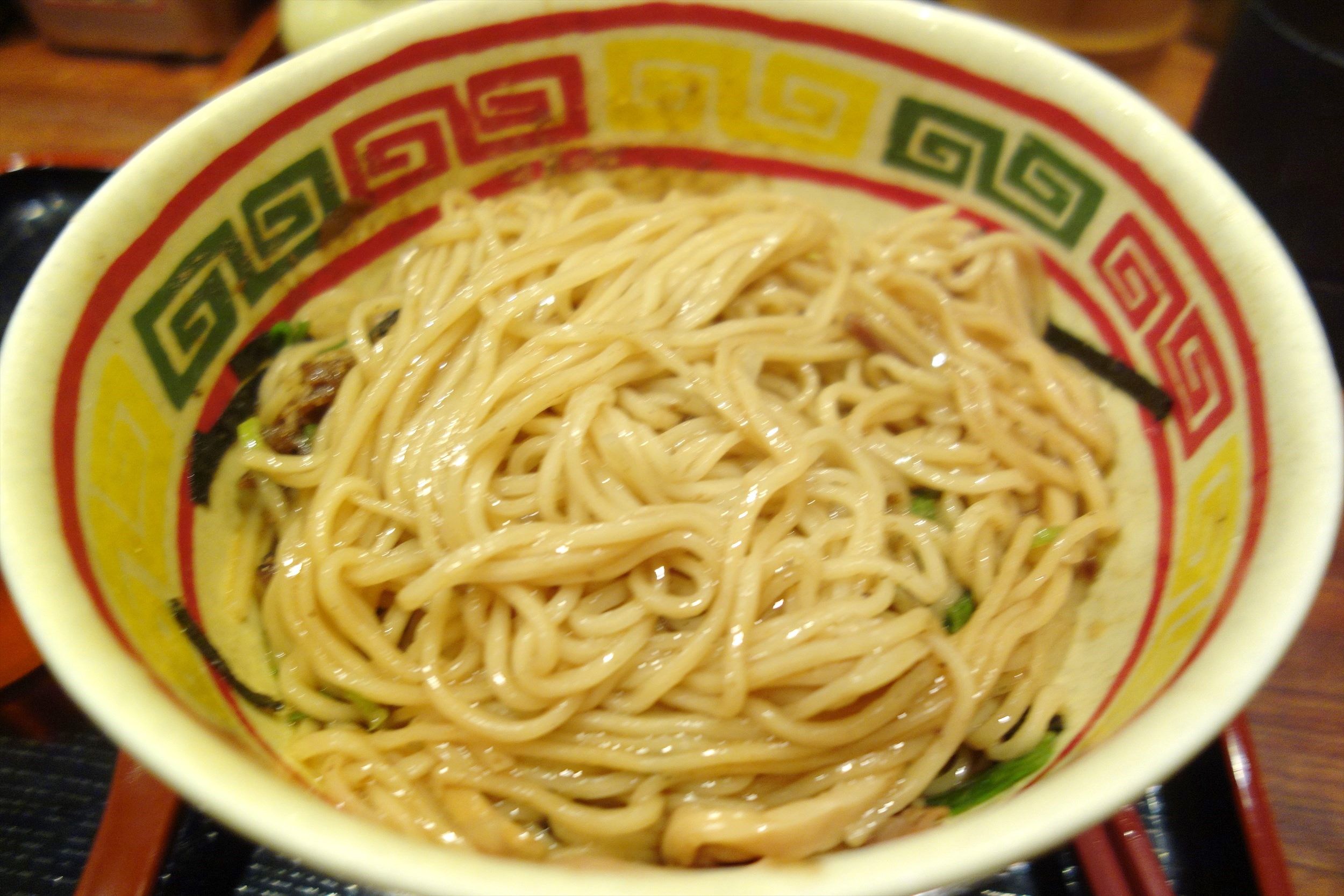 食べる前にしっかりとかき混ぜて食べてみると、中太のモチモチ麺に魚粉の旨味と甘味が癖になるタレがマッチして中々の美味しさ!