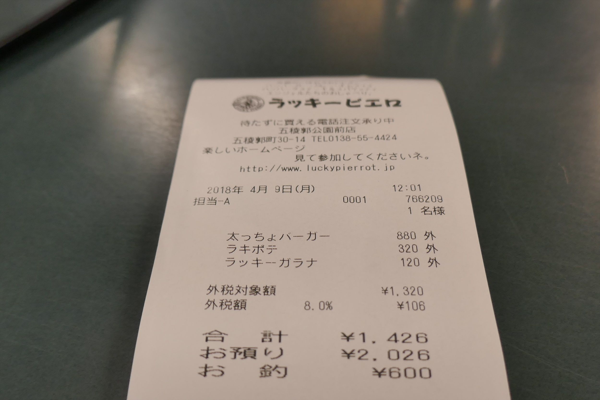 先日、「五稜郭タワー」観光の帰りに「ラッキーピエロ 五稜郭公園前店」へ行き、今回は「太っちょバーガー」880円、「ラキポテ」320円、「ラッキーガラナ」120円を注文しました。