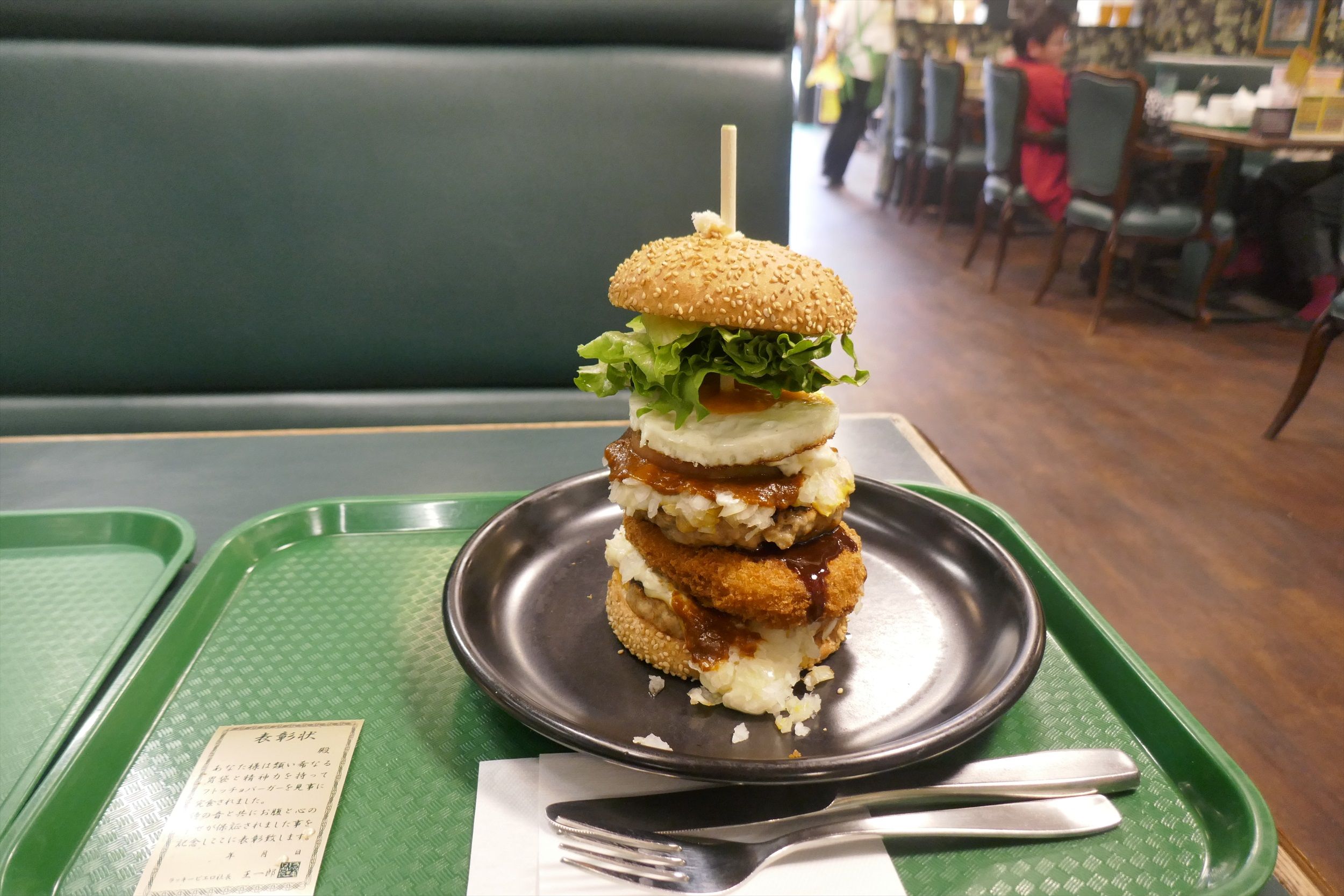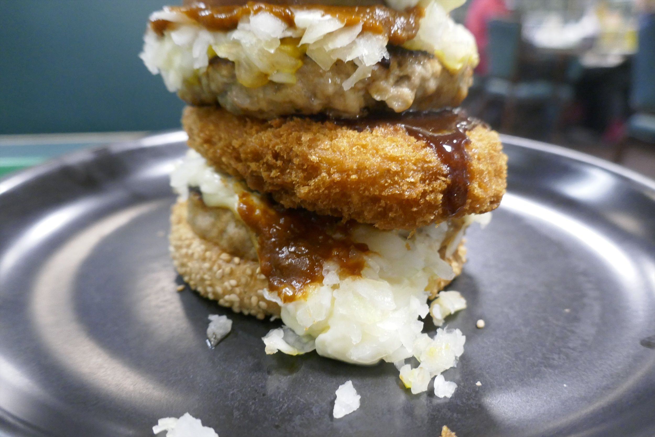 食べる際にはナイフとフォークが必須ですが、ホクホク食感のコロッケ、肉厚でお肉の美味しさに満ち溢れるパティ、爽やかに玉ねぎの風味が効いたタルタルソース、ぷるぷる食感の目玉焼き、香ばしい胡麻付きバンズ、みずみずしいレタス、トマトが絡んで、見た目以上に爽やかな美味しさに大興奮!重量感あふれる姿が嘘のようにあっという間に完食できちゃいました!
