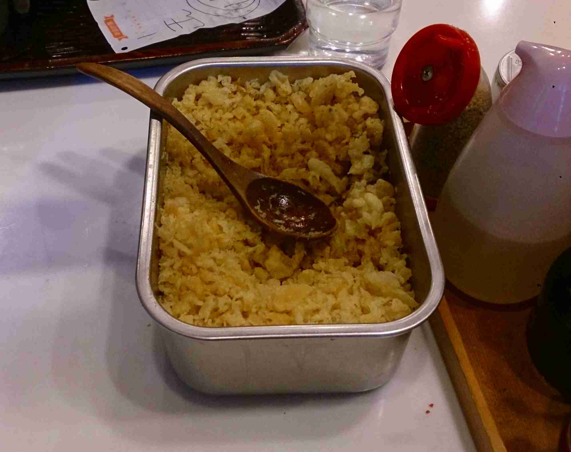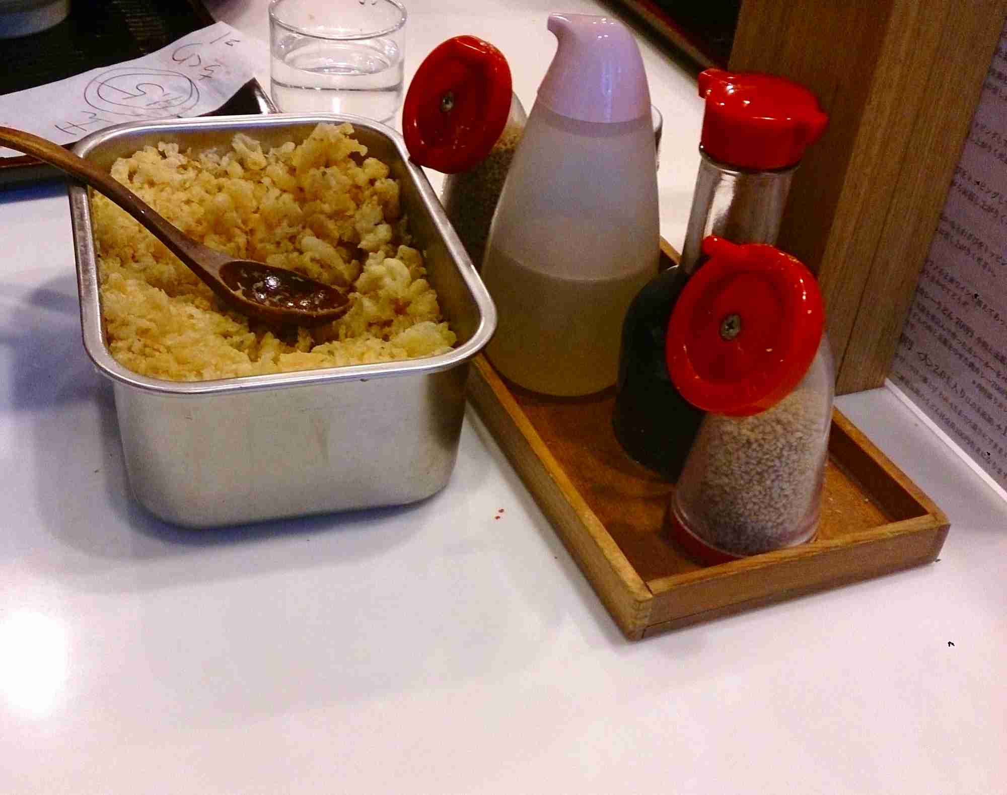 うどんを頂く前に目の前にありました、揚げかすの入った容器を手元に移動させ