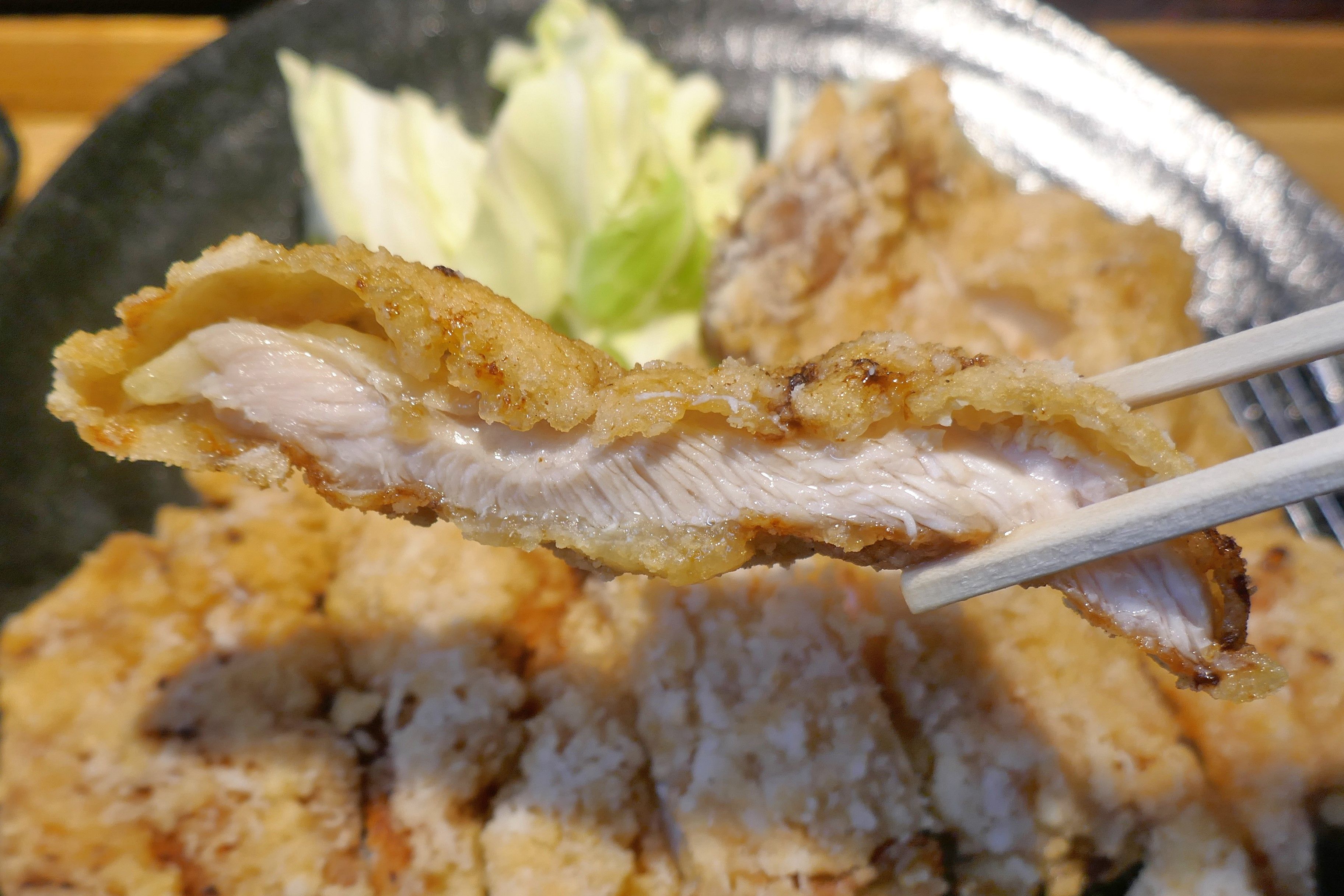 メインの山賊焼にかぶりつくと、竜田揚げのようにザクザク衣の中にジューシー感満点な鶏肉がたっぷりでウマー!下味もにんにく醤油ベースで素のままでもいい感じで、サラダ代わりに盛られた生キャベツともマッチ!