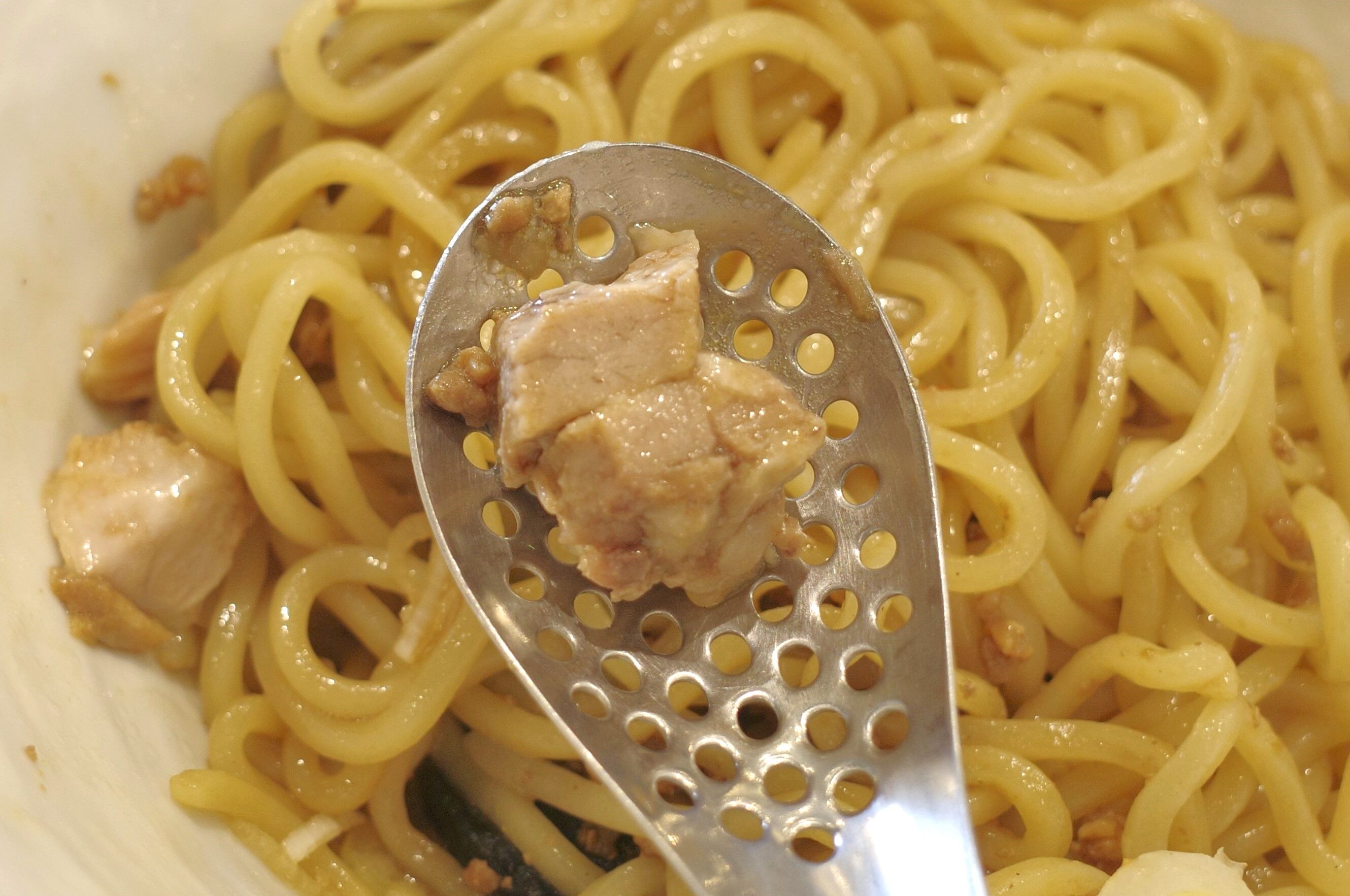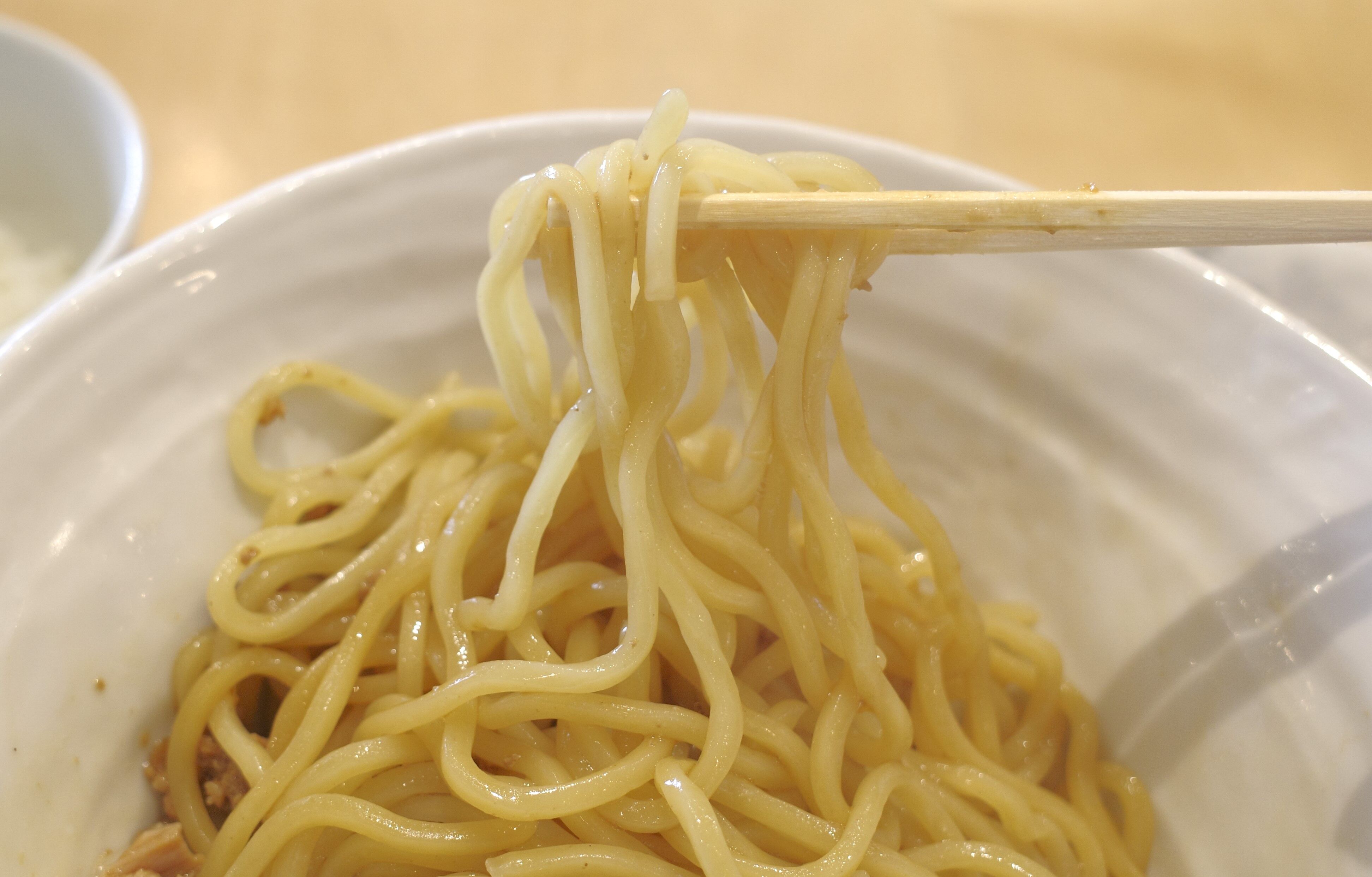 早速麺をすすっていくと、太くコシとモッチリとした歯ざわりが素晴らしく、塩気はそこそこに旨味豊かなタレが染みてウマー!