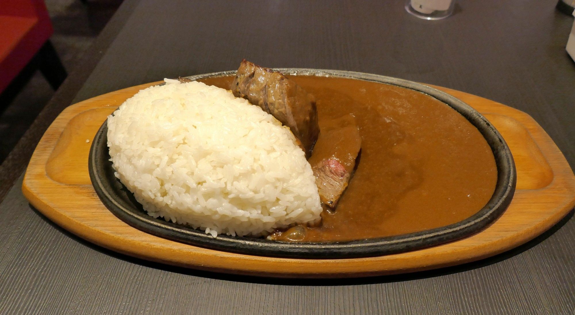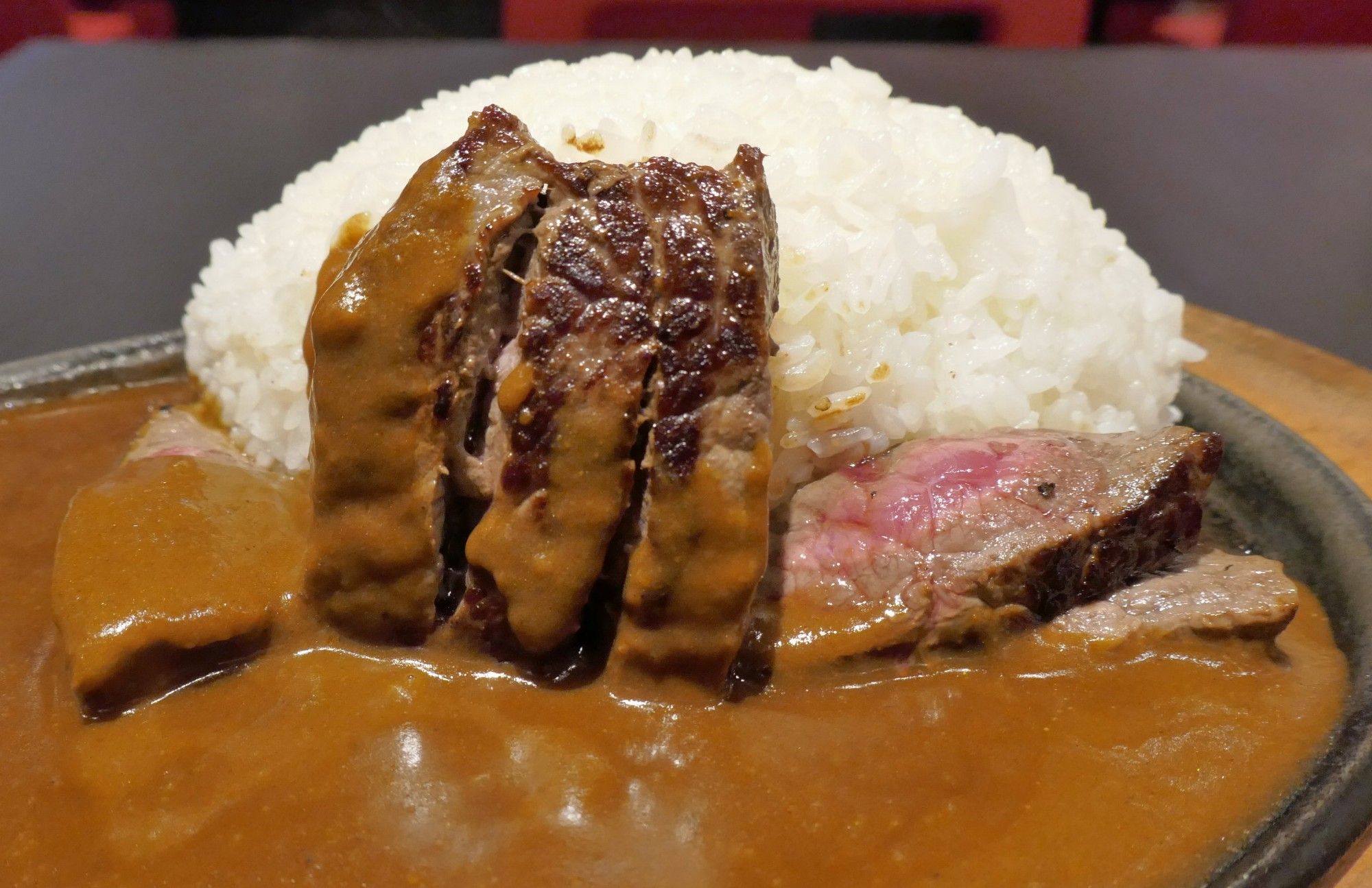 カレーの上に乗ったステーキは、赤身肉でレアな焼き加減です。