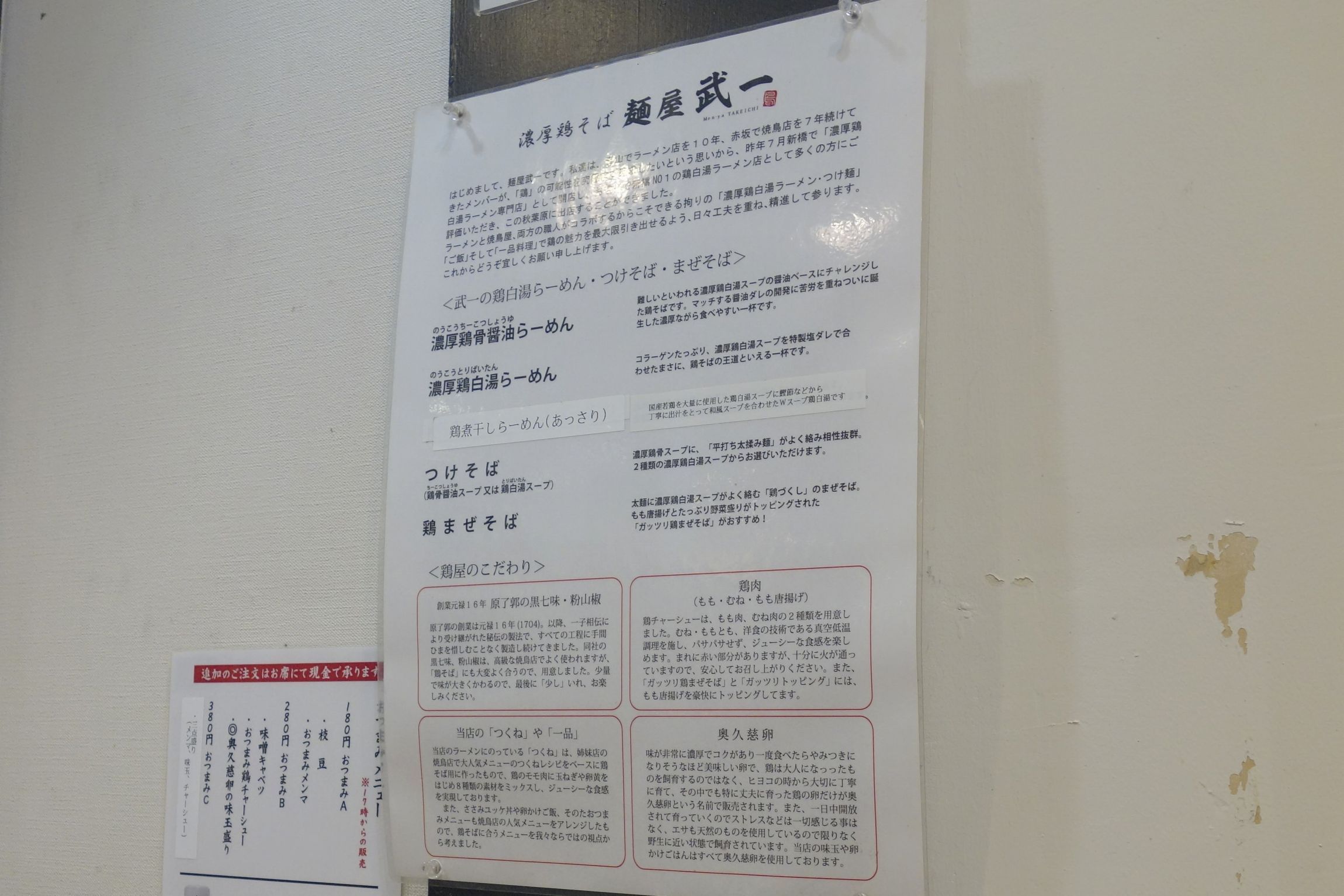 席につくと、麺屋武一では、濃厚鶏骨醤油ラーメン、濃厚鶏白湯らーめん、つけそば、鶏まぜそばがあるとのこと。
