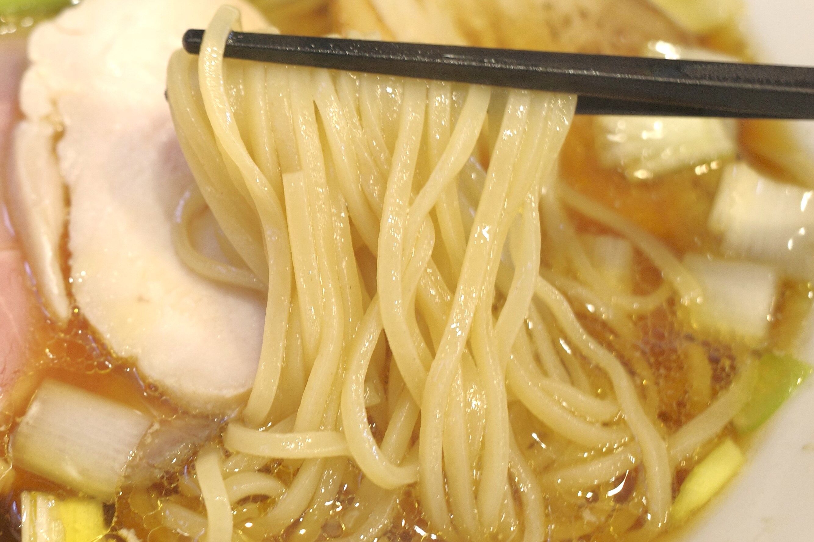 まずはスープから味わってみると、鶏の旨味、醤油の塩気が交互に感じられてメチャ淡麗!加えて、鶏の脂でスープ表面をコーティングされているので、スープが冷えにくいのもうれしいところ!