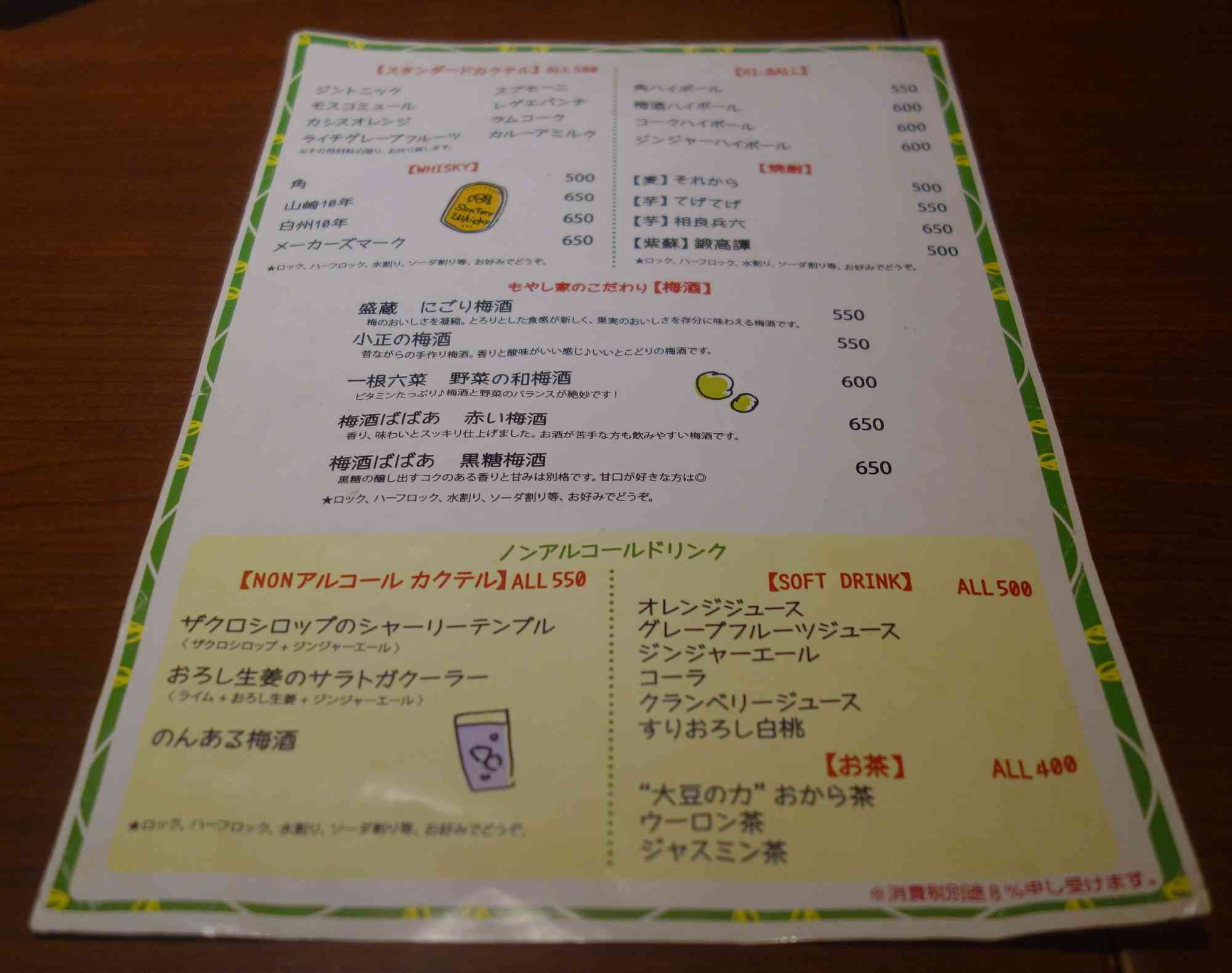 カクテル、ハイボール、ウィスキー、焼酎、梅酒、ノンアルコールドリンクで飲み物メニューは以上です。