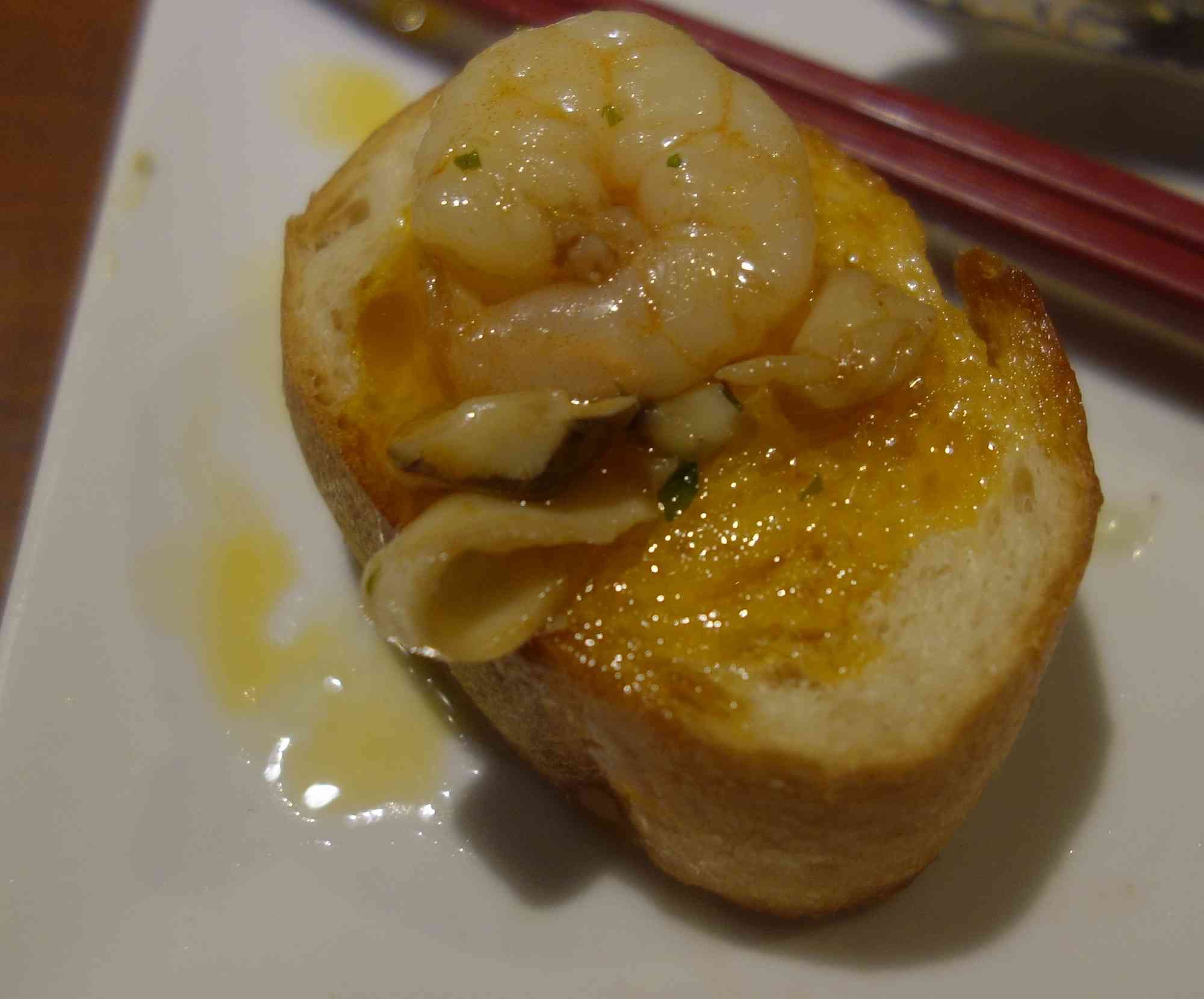 アヒージョの具材をパンの上に乗せて頂いてみると、具だくさんな事を功を奏したのか?