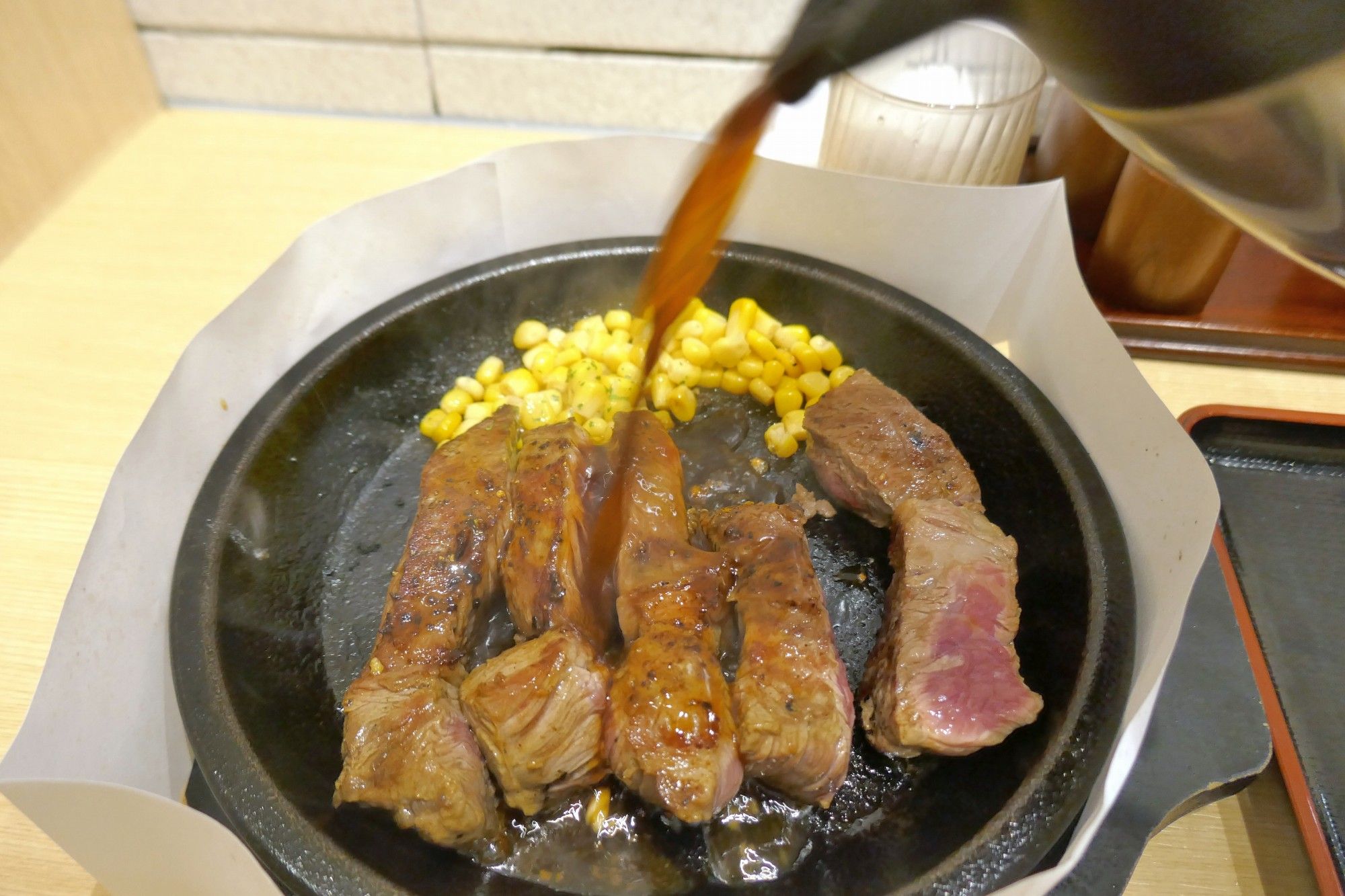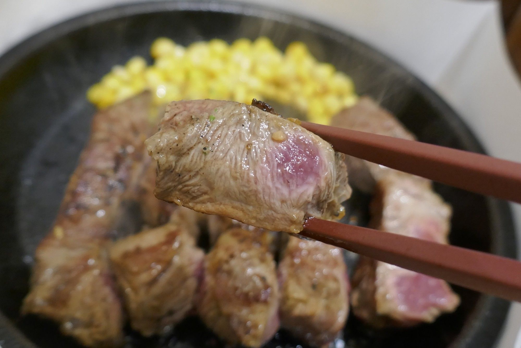 ステーキを食べてみると、お肉の美味しさにプラスされて、にんにくとしょうゆの風味が効いたタレの旨味が合わさって大満足なウマさに変化!