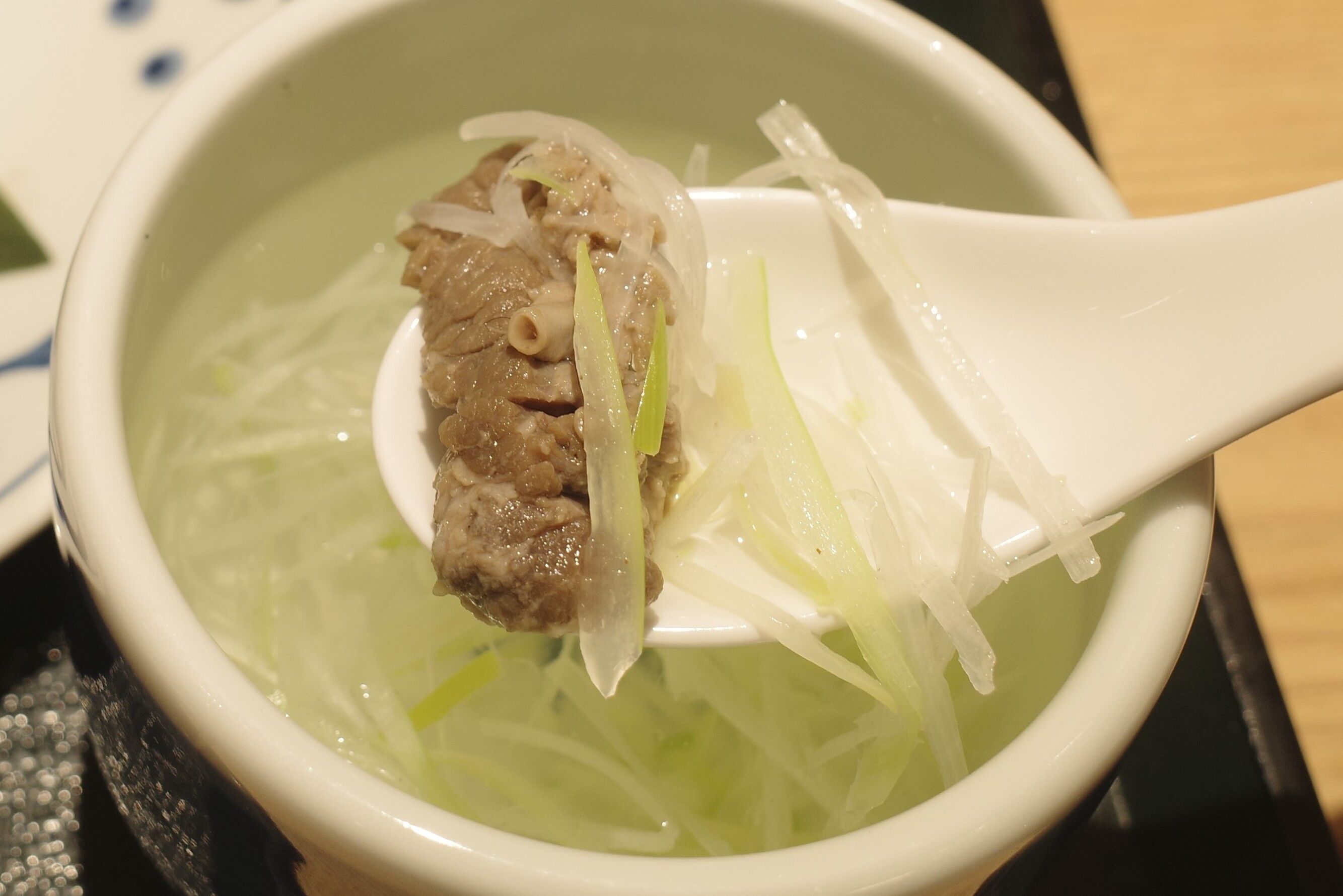テールスープは、優しい塩気と胡椒の辛味とあわせてねぎの爽快感、煮込んだテールの柔らかくキレのある旨味がじんわり舌に迫って中々美味!